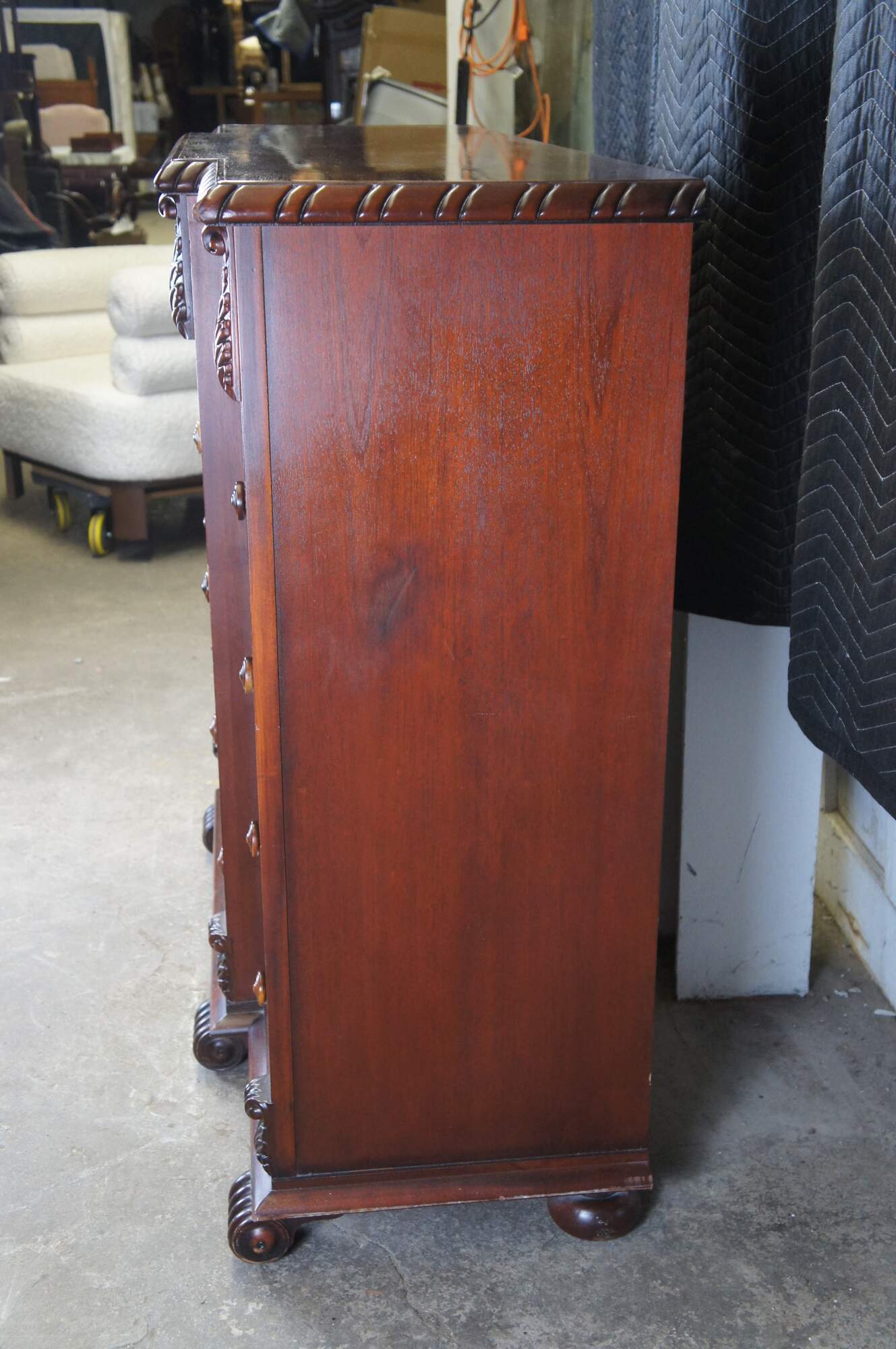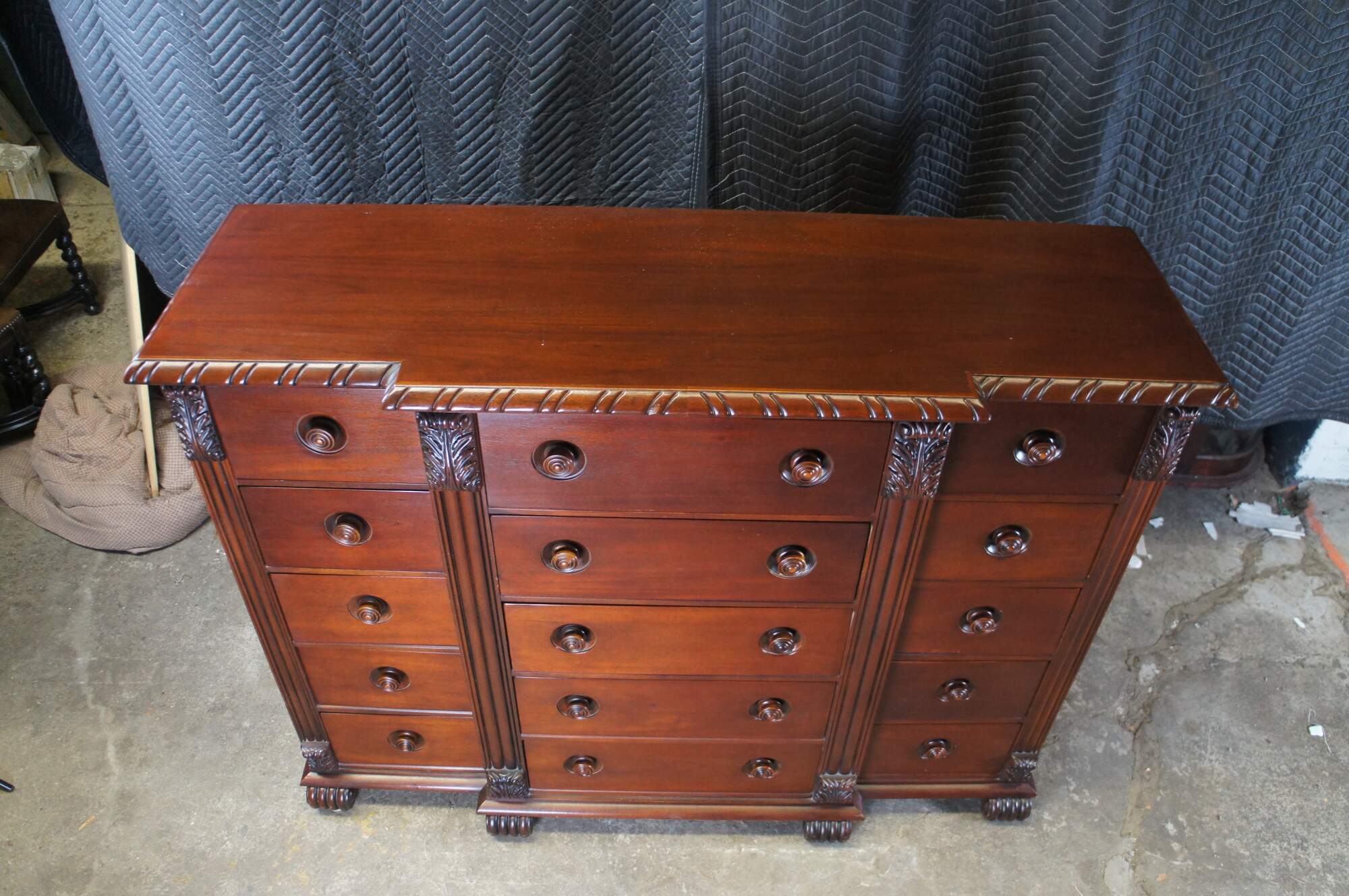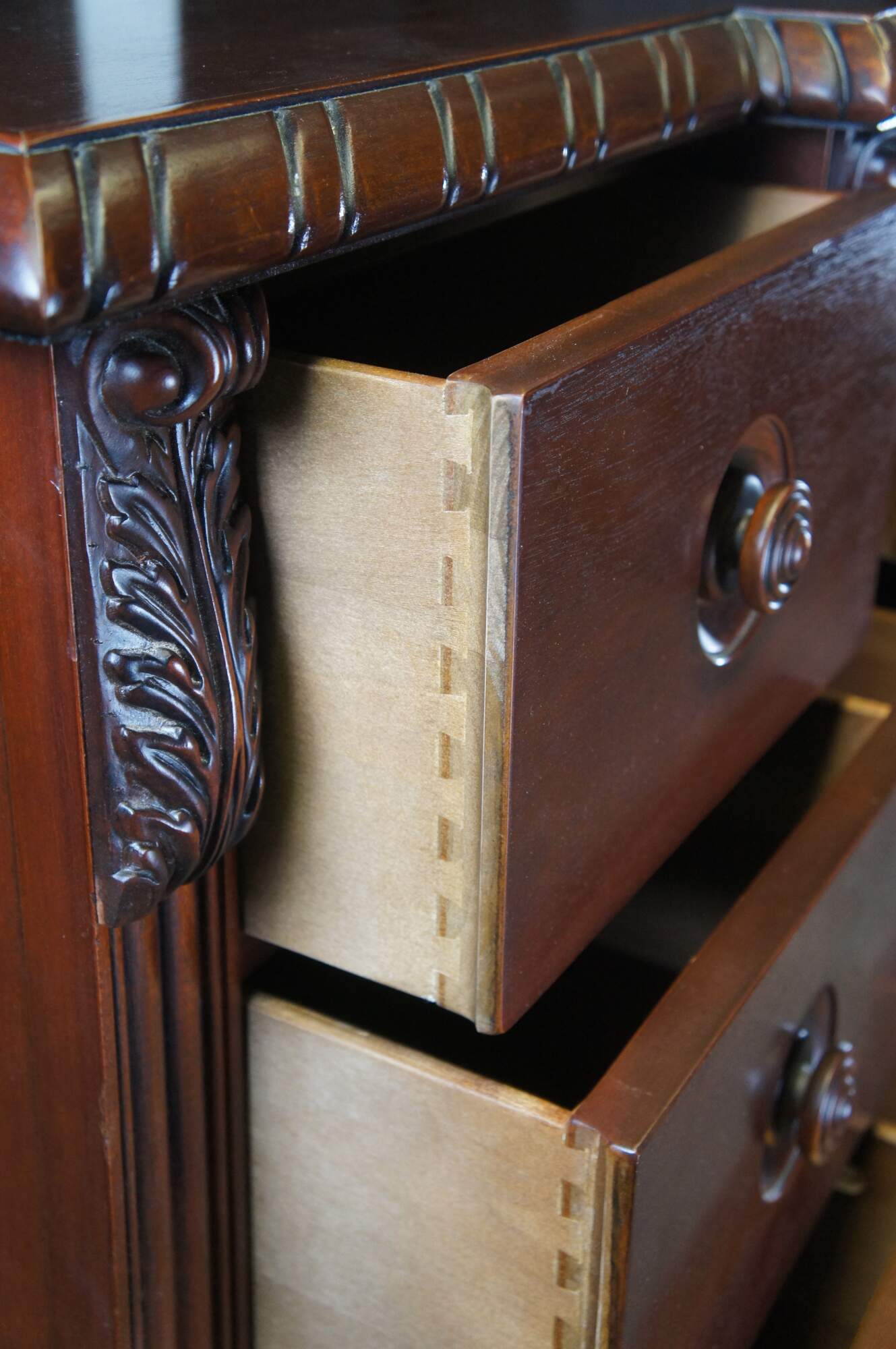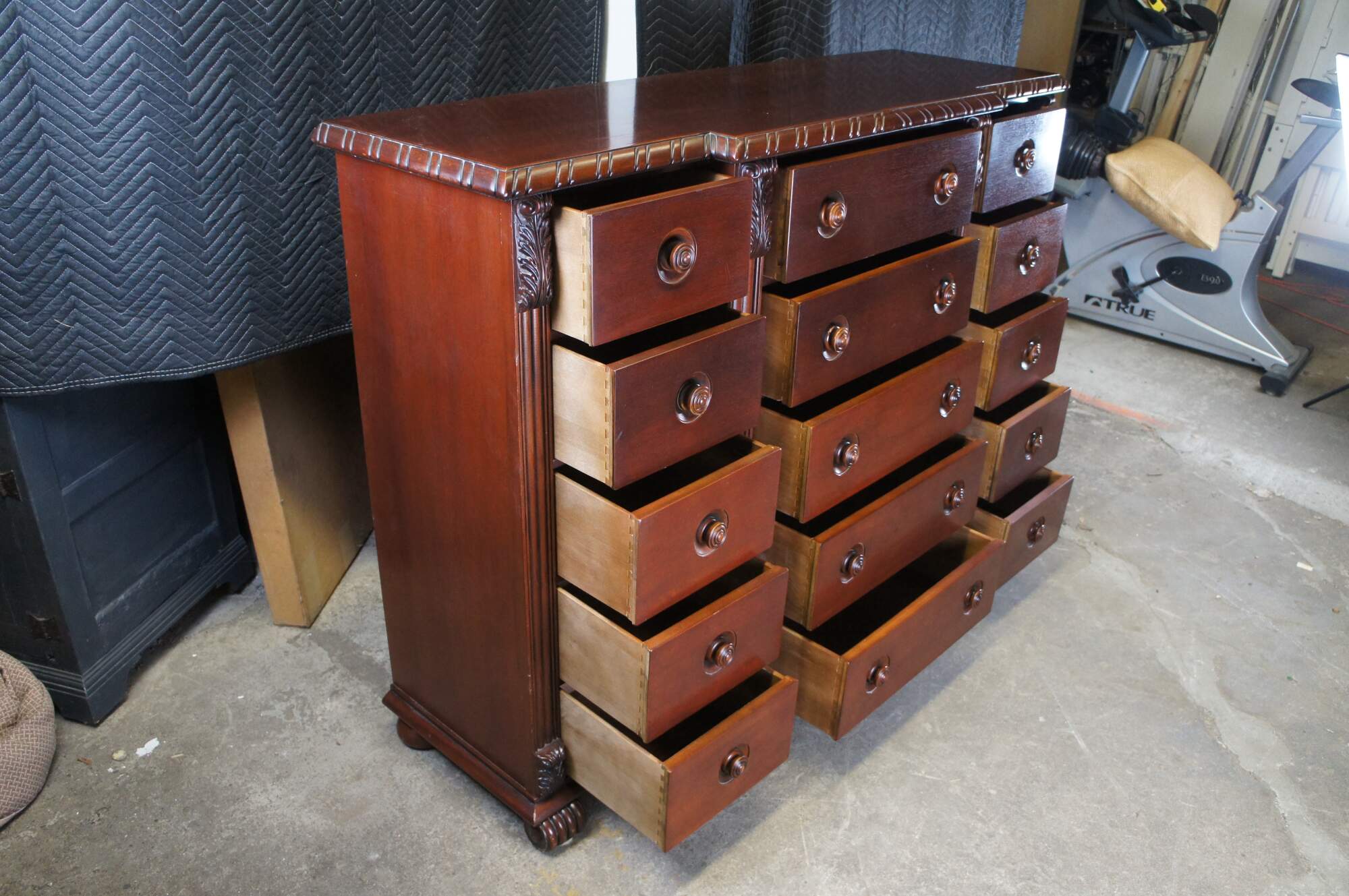 Late 20th Century Georgian style Chest of Drawer by Henredon for Ralph Lauren. Features a Breakfront form made from mahogany with carved front apron and grooved stiles flanking 15 dovetailed drawers. Drawers have an inset center with turned pulls. Stiles are flanked by carved acanthus molding along the top and bottom. The dresser is supported by grooved scrolled feet at the front and bun feet along the back.