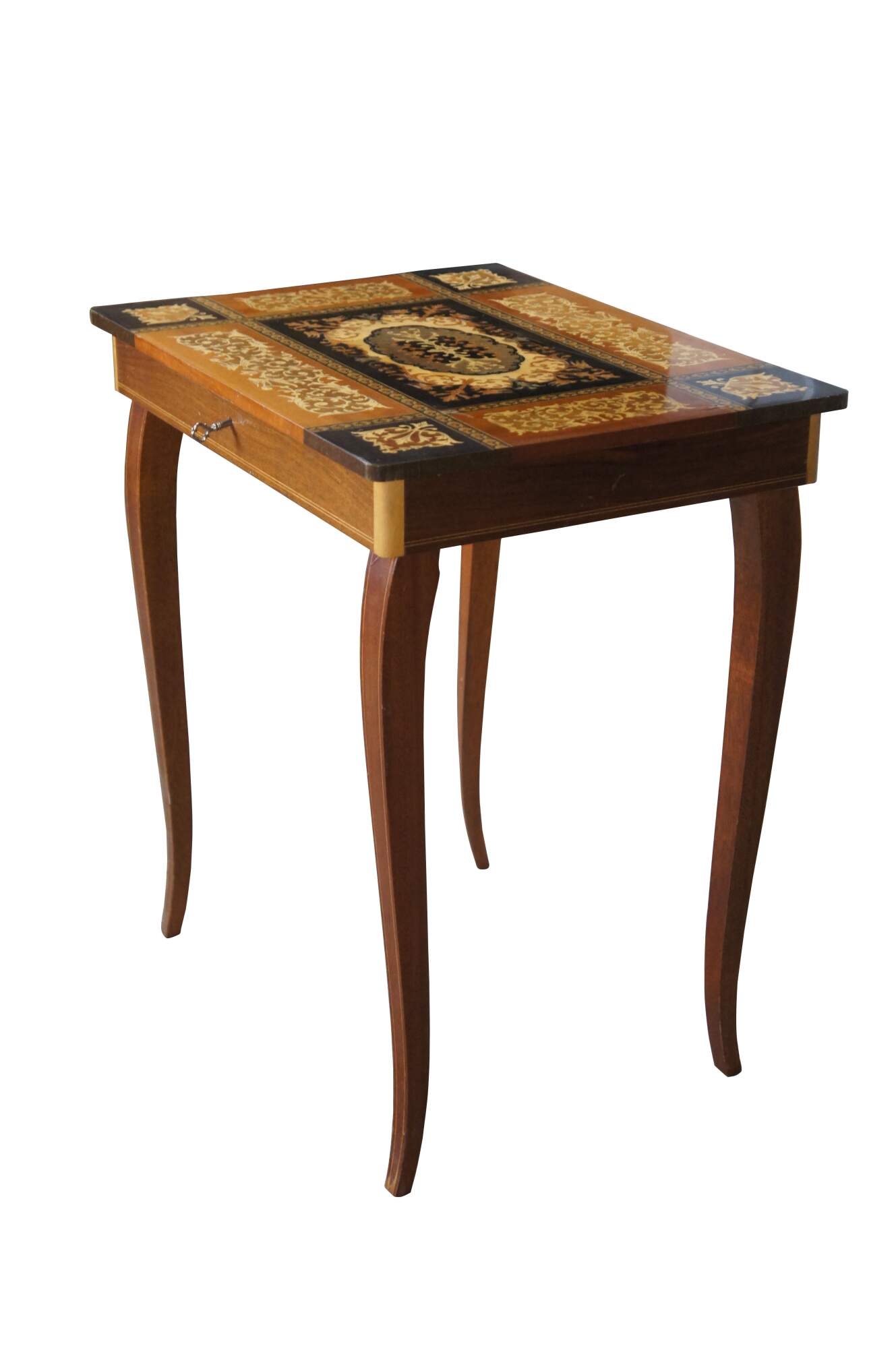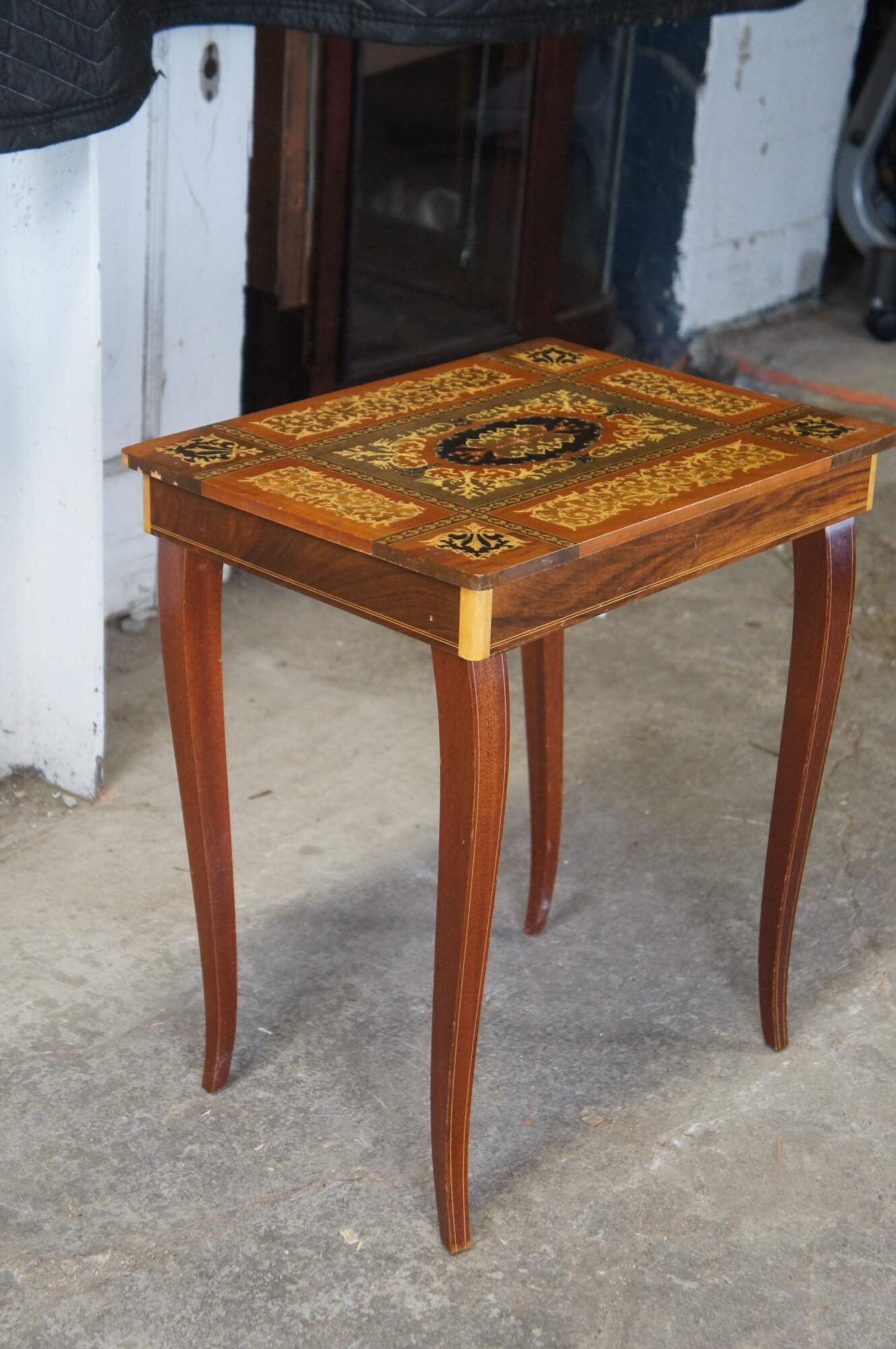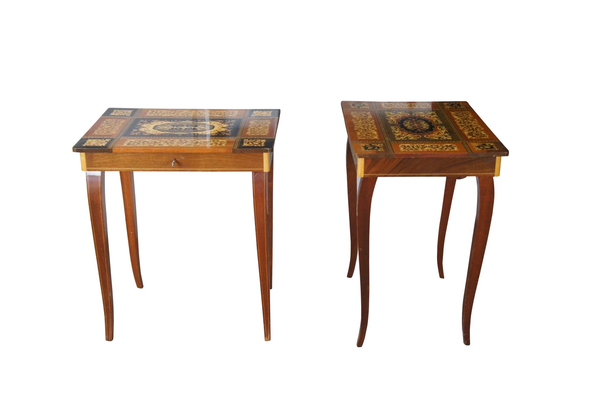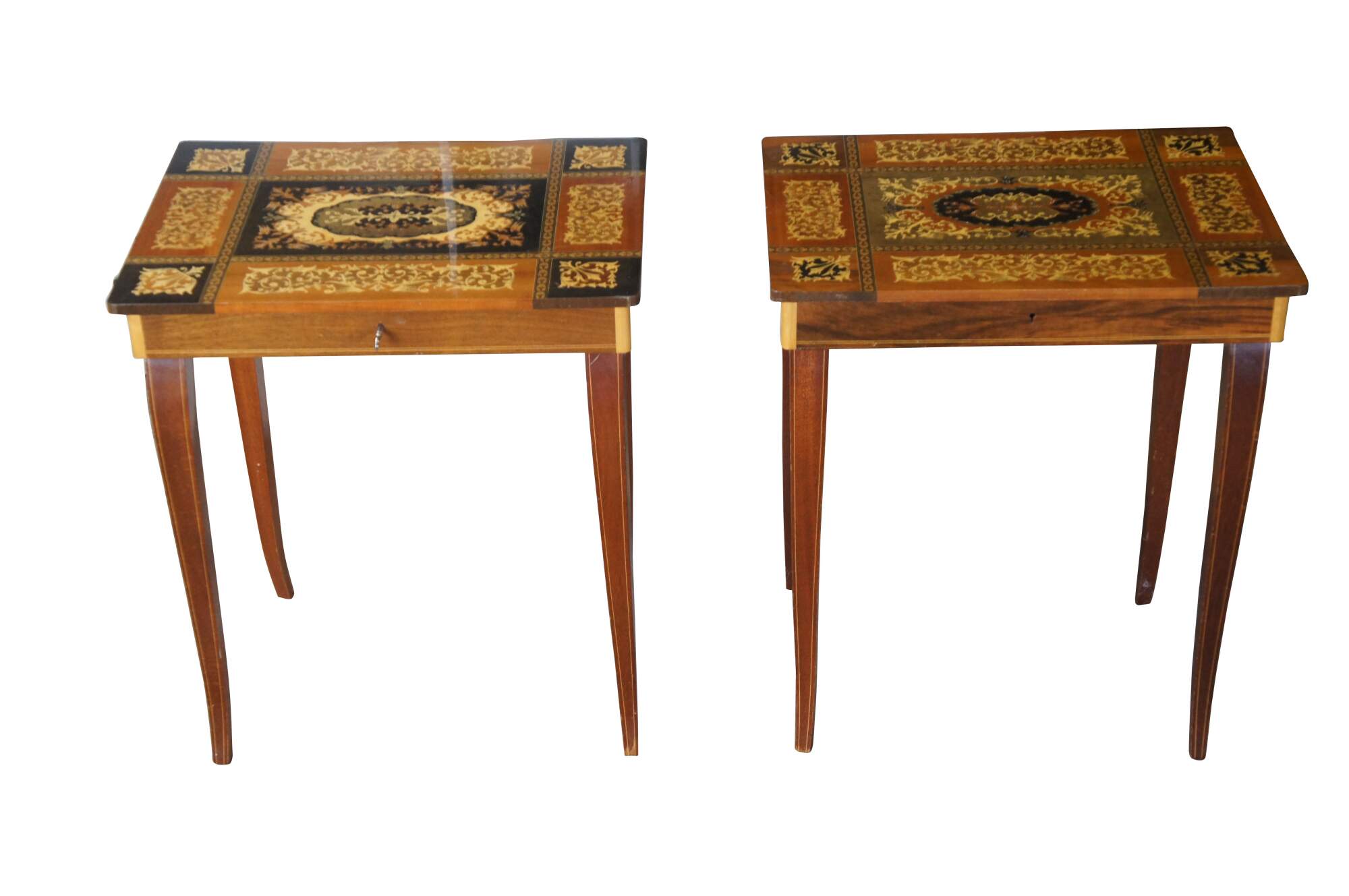 2 Italian Inlaid Marquetry Musical Side Tables Pair Santa Lucia Music Box