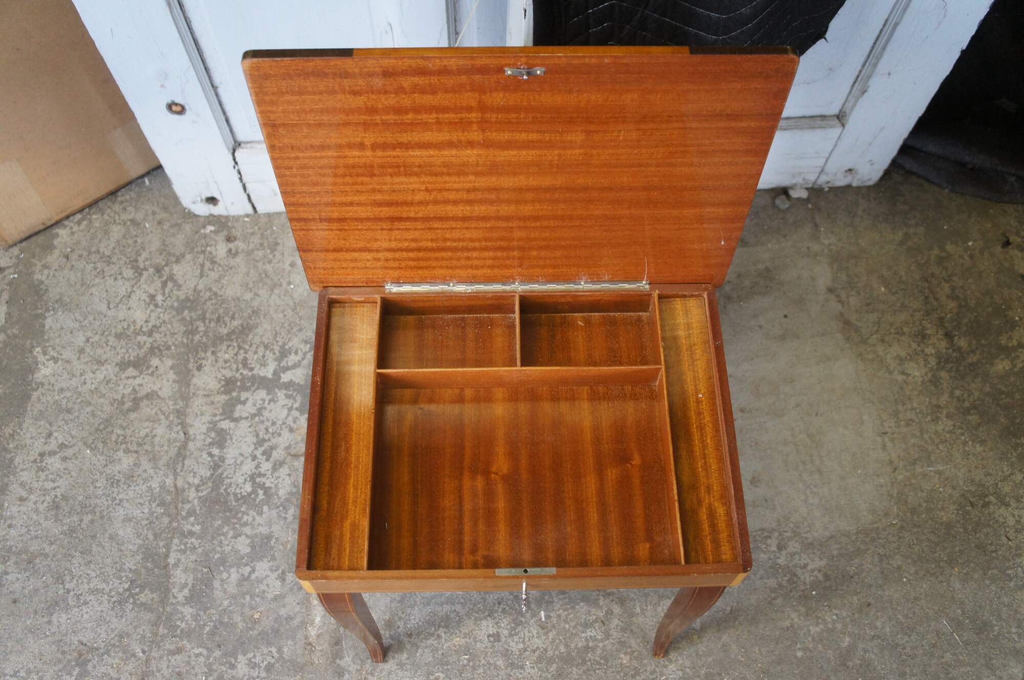 Pair of Italian Mahogany Inlaid Marquetry Musical Side Tables. Lid opens for storage of jewelry or collectibles. Plays Santa Lucia Music Box