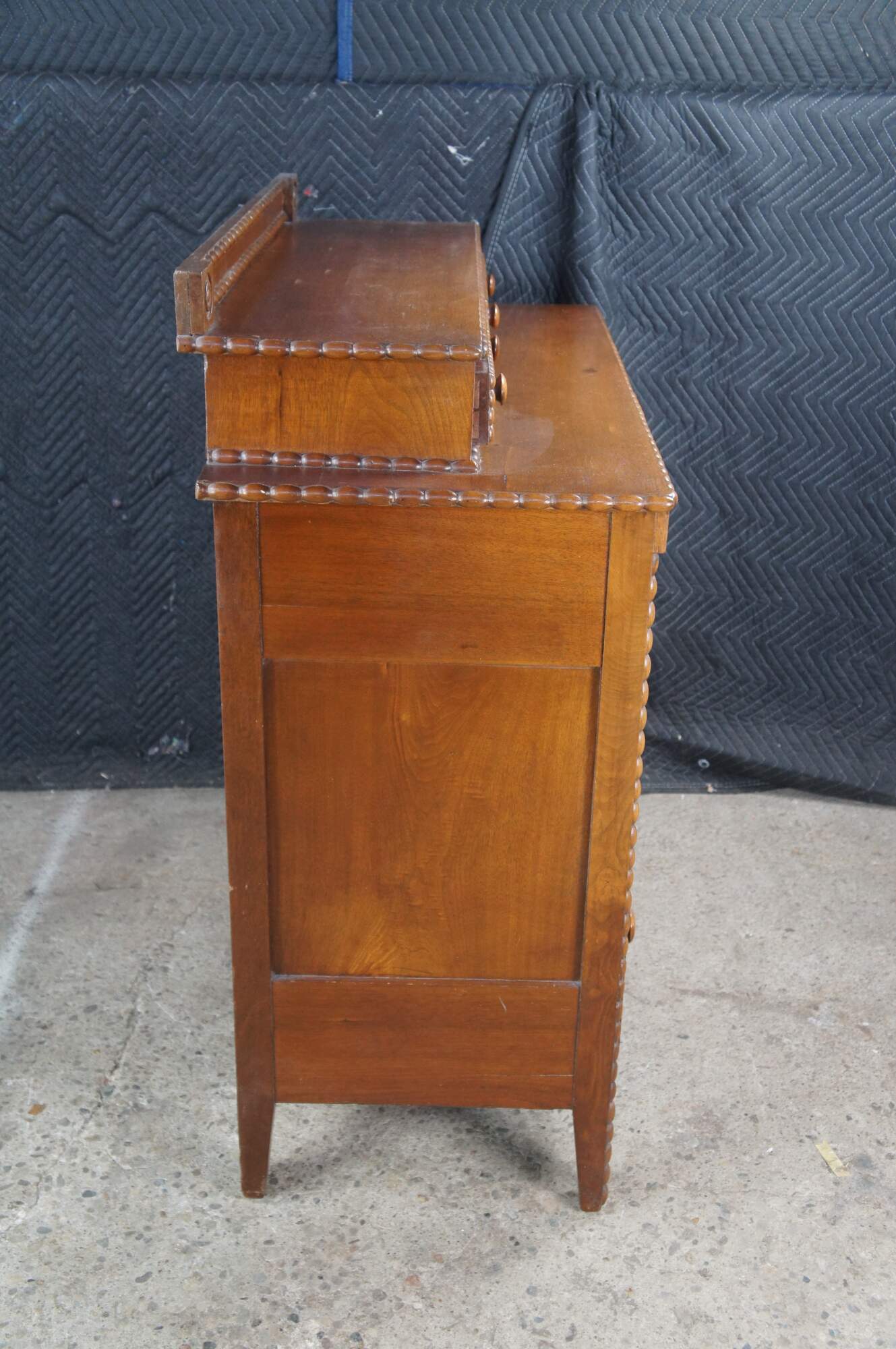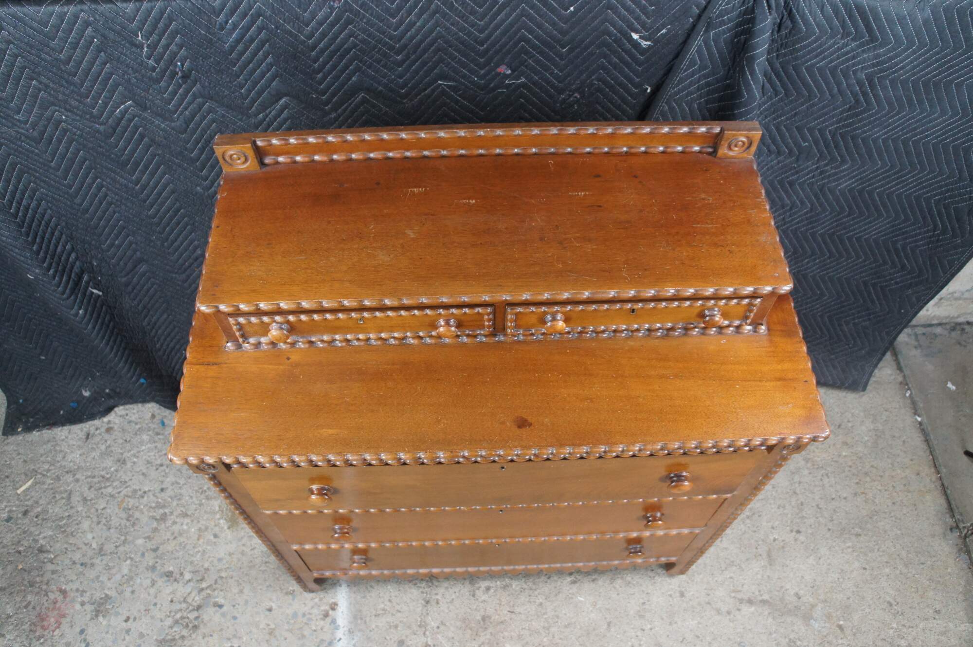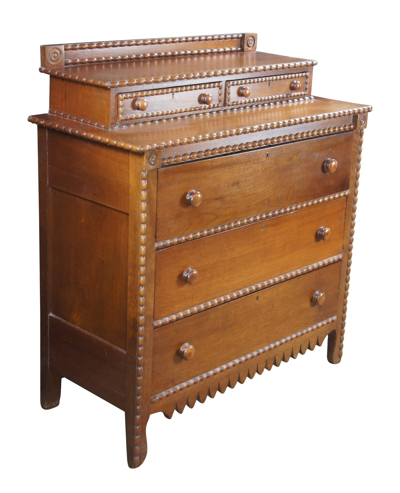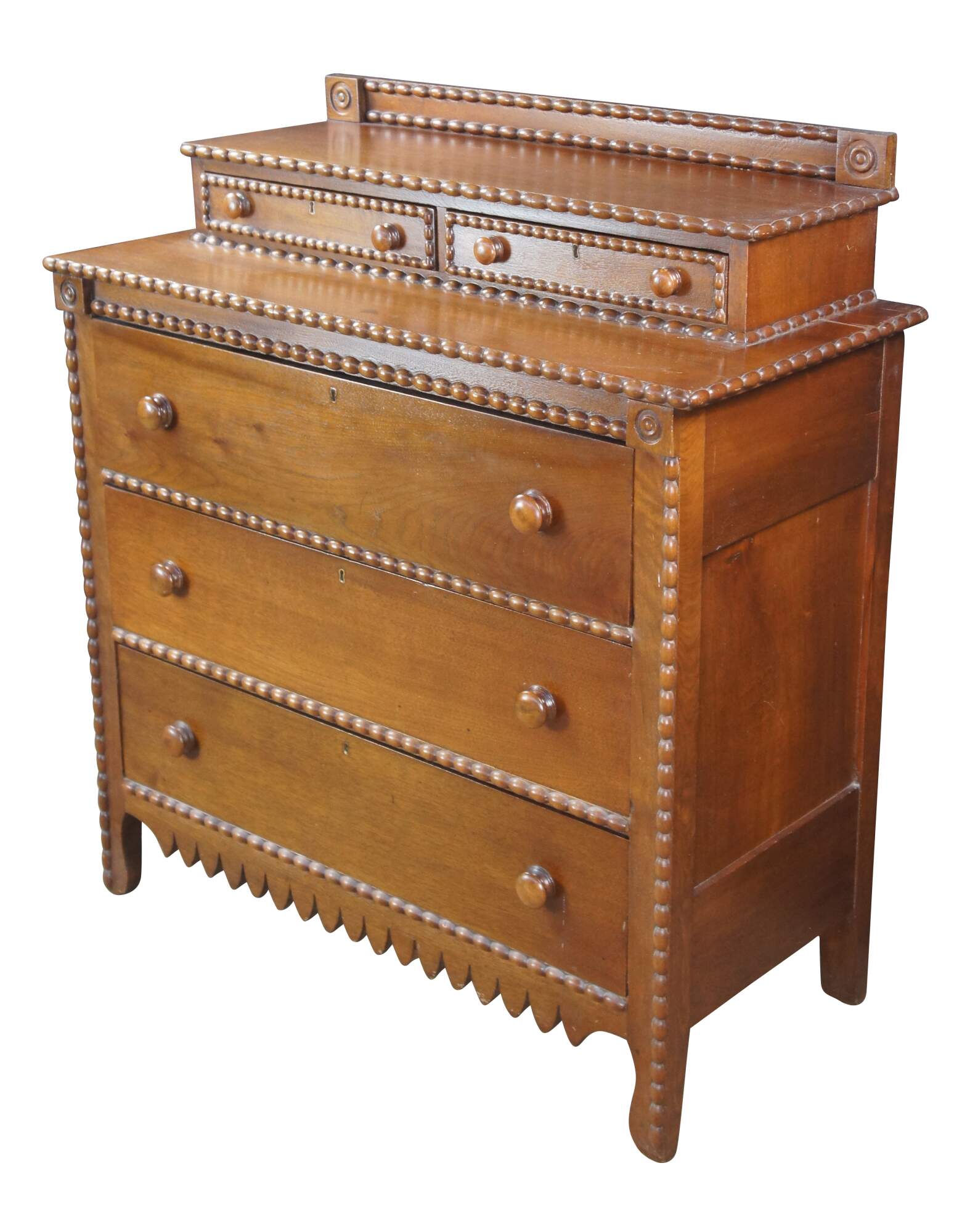 Antique Victorian stepback dresser / chest of drawers. Made of walnut featuring Arts & Crafts styling with five hand dovetailed drawers framed by long spool style beads and lower sawtooth edge. One of the upper glove box drawers has been modified with a divided felt liner for jewelry.
