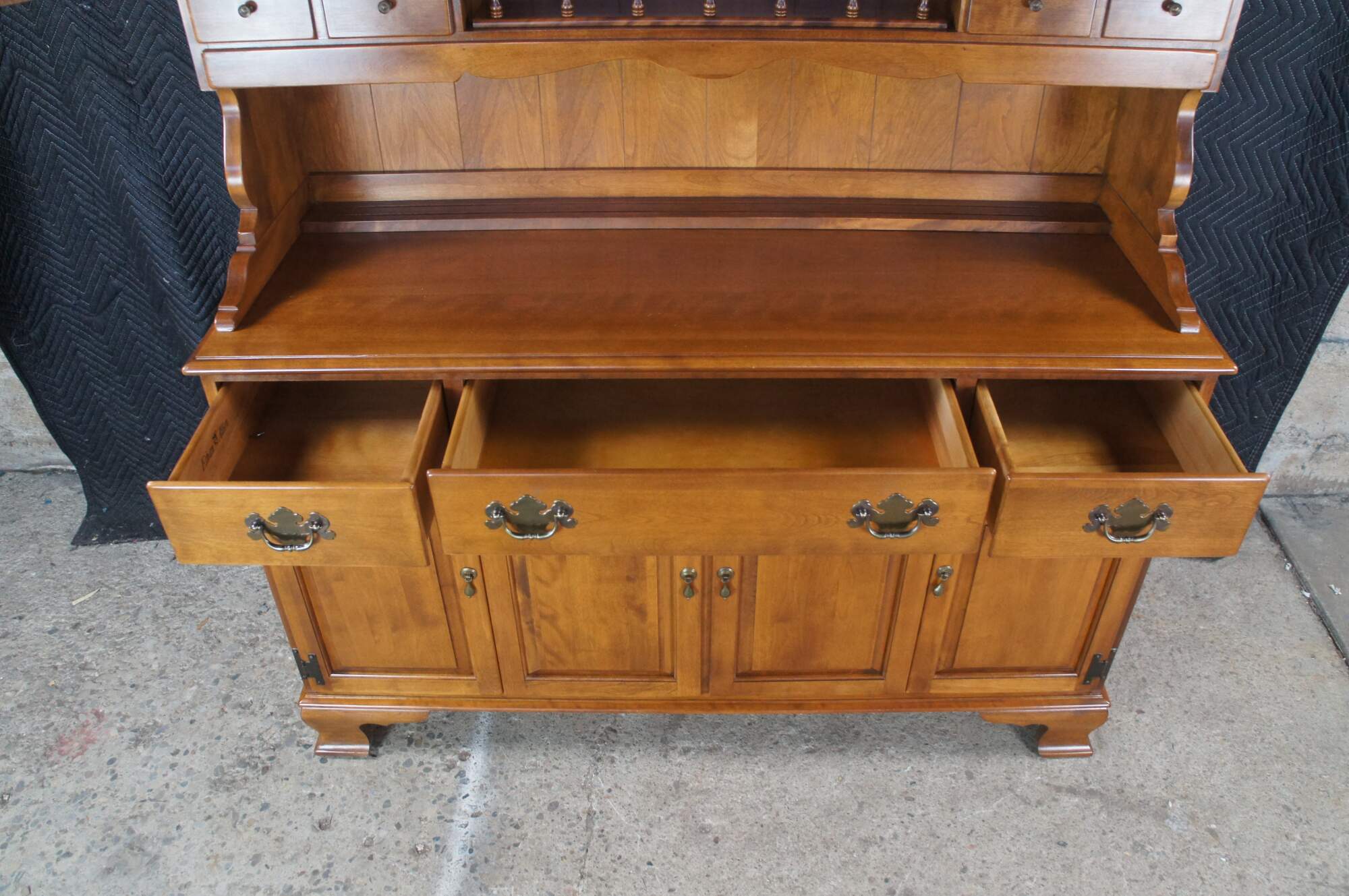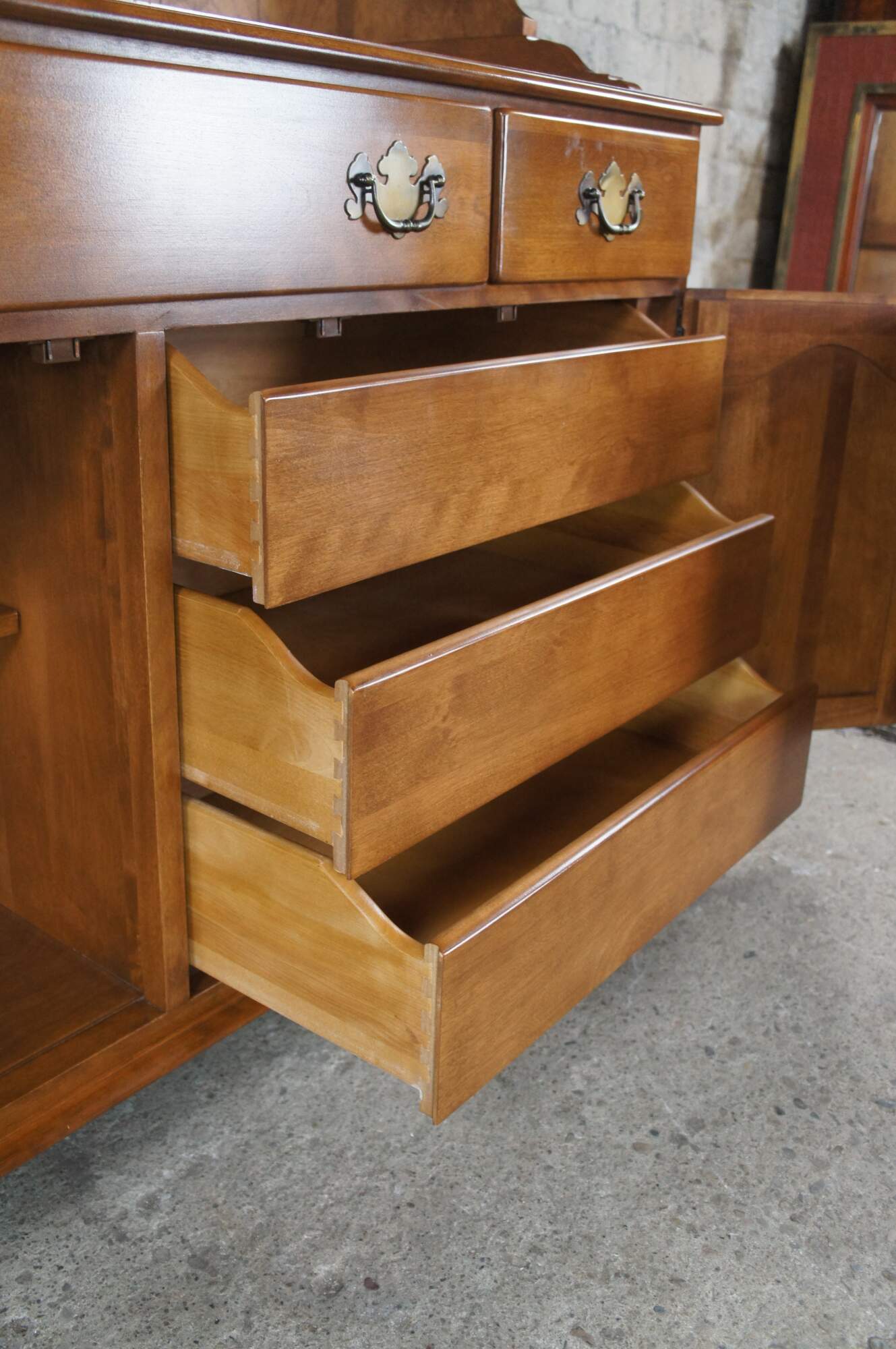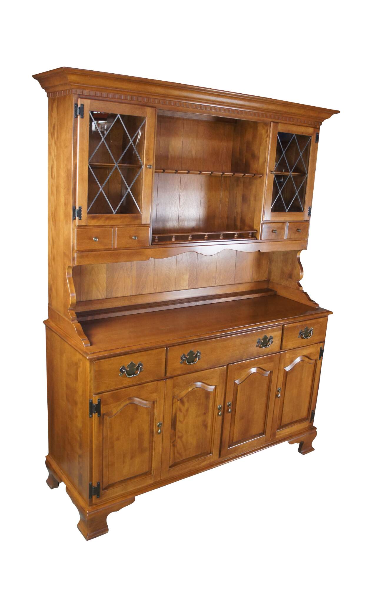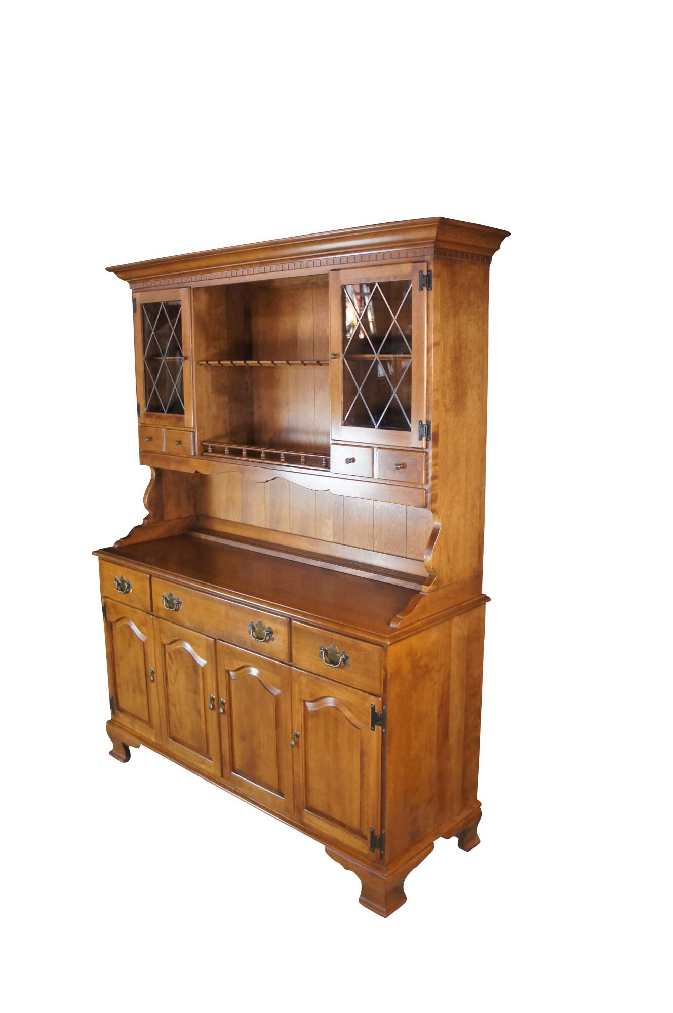 Vintage Ethan Allen Heirloom Collection china cabinet / credenza / sideboard / drybar. Made of maple featuring lower buffet cabinet with three drawers and lower cabinets over bracket feet, supporting an upper stepback hutch with more drawers and cabinets, with a central gallery for glasswear, stemware and bottles. Nutmeg finish 10-6028 (hutch), 10-6016 (buffet).