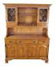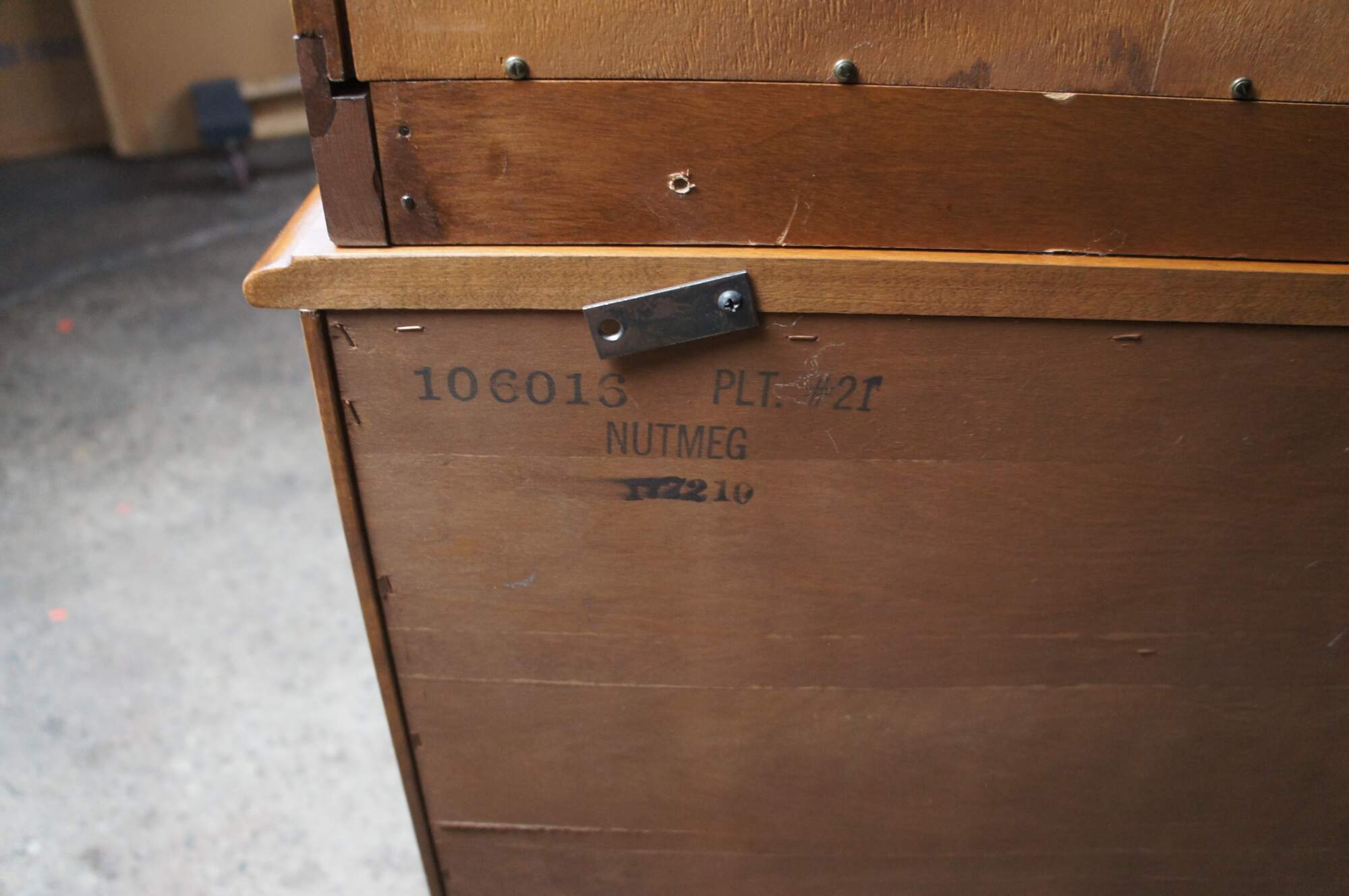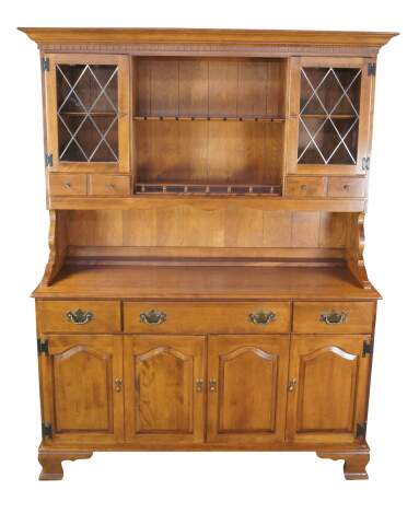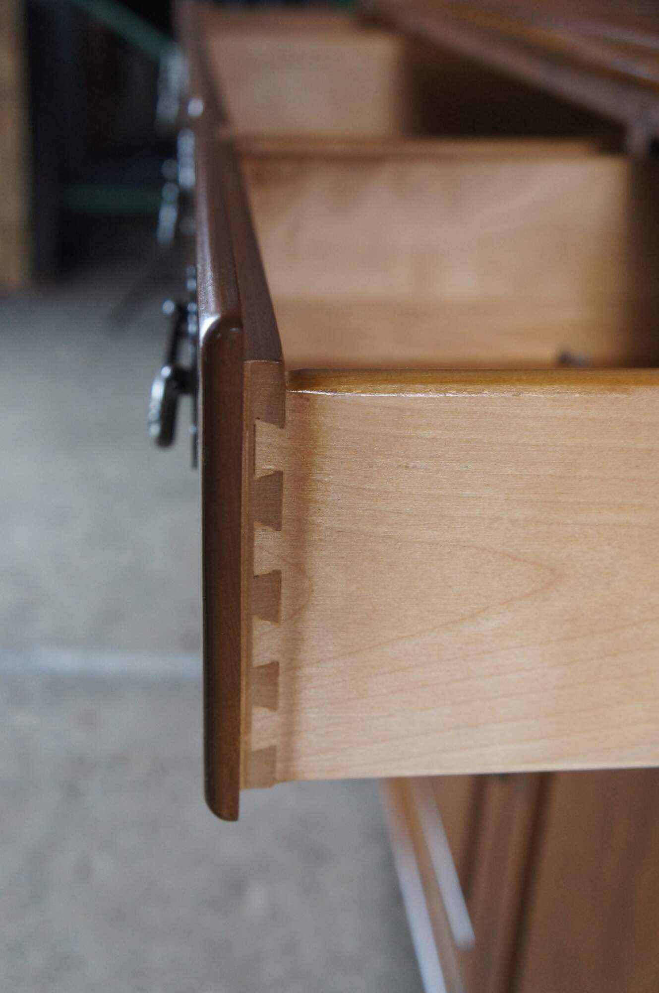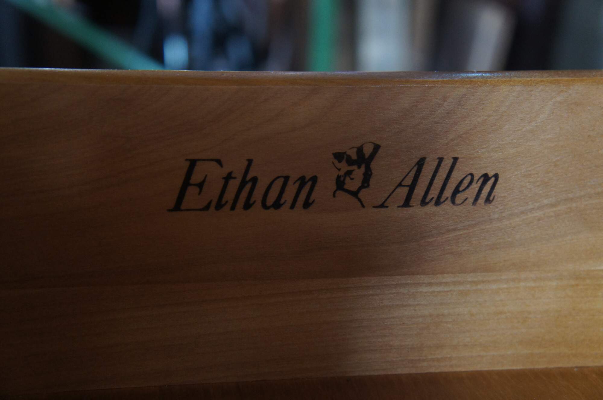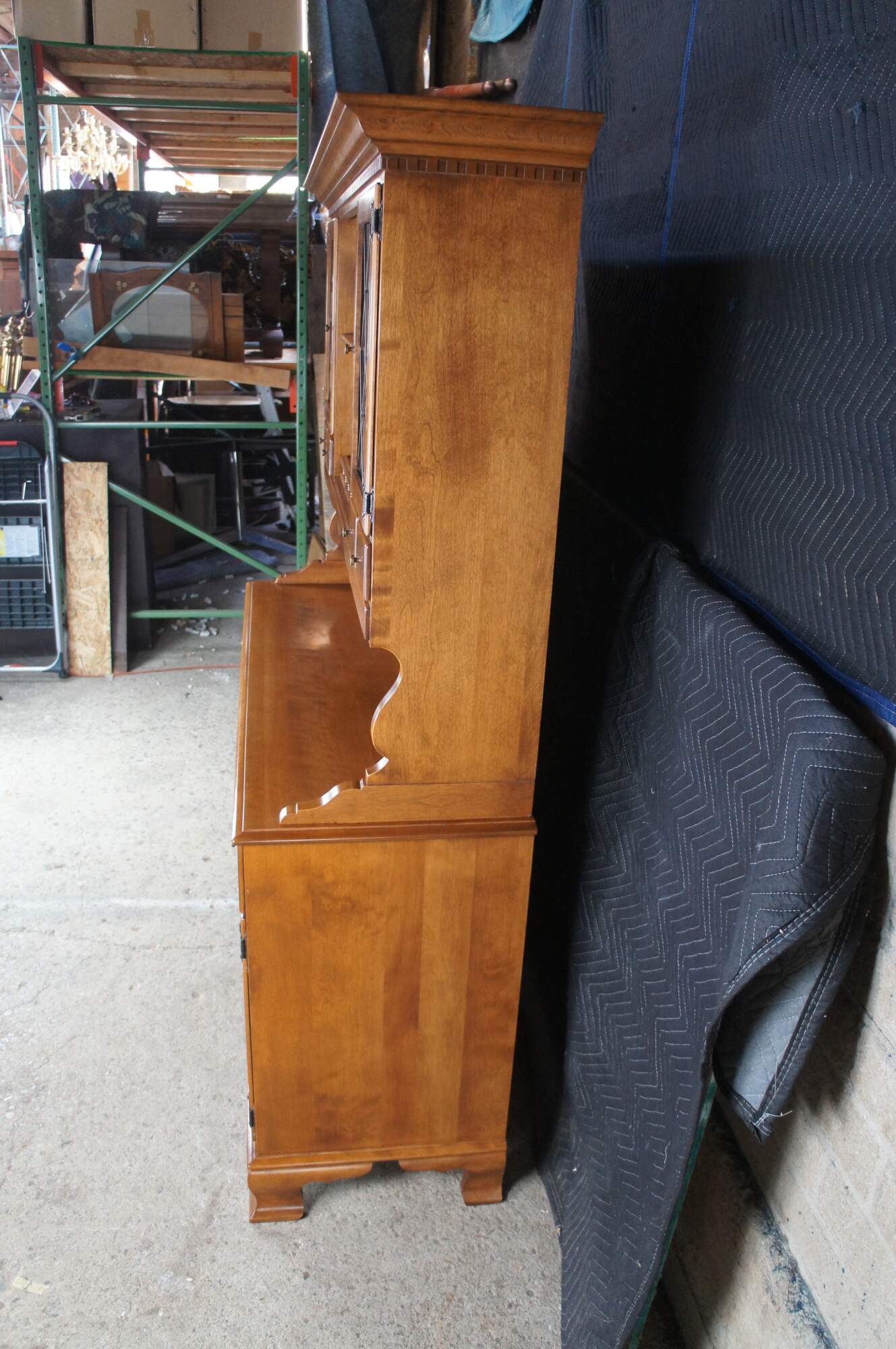 Vintage Ethan Allen Heirloom Collection china cabinet / credenza / sideboard / drybar. Made of maple featuring lower buffet cabinet with three drawers and lower cabinets over bracket feet, supporting an upper stepback hutch with more drawers and cabinets, with a central gallery for glasswear, stemware and bottles. Nutmeg finish 10-6028 (hutch), 10-6016 (buffet).