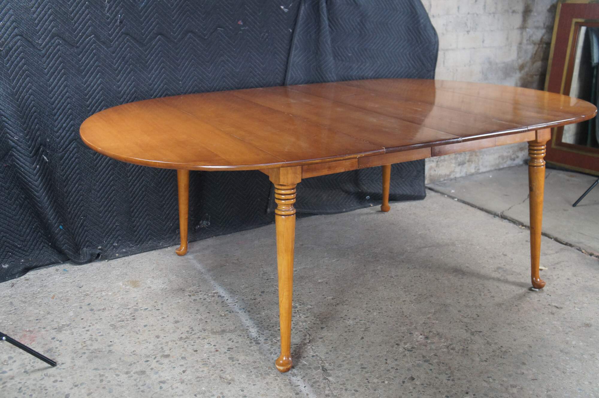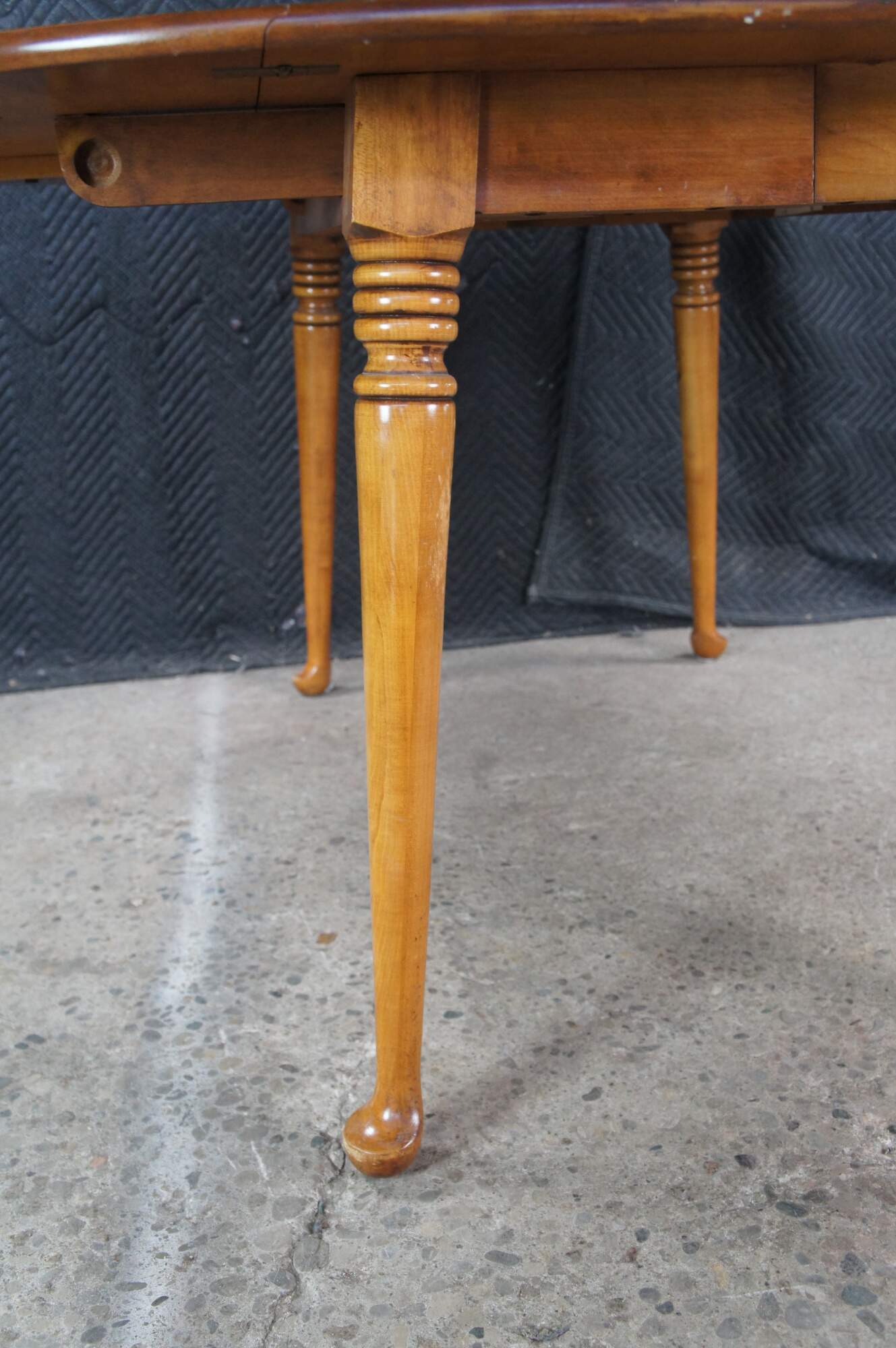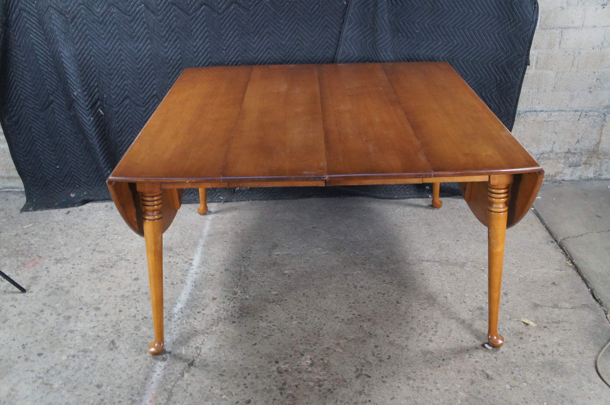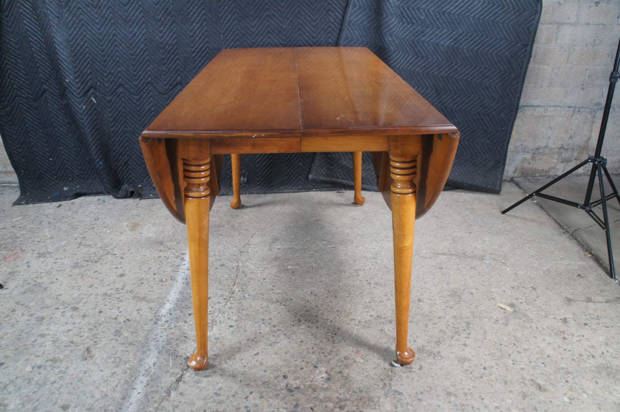 Mid century Early American Colonial style extendable country farmhouse drop leaf dining table. Made of maple featuring long turned legs with Queen Anne pad foot. Includes to leaves. Rike-Kumler Co, Dayton Ohio. Fact 460, style 825-55, Maple.