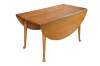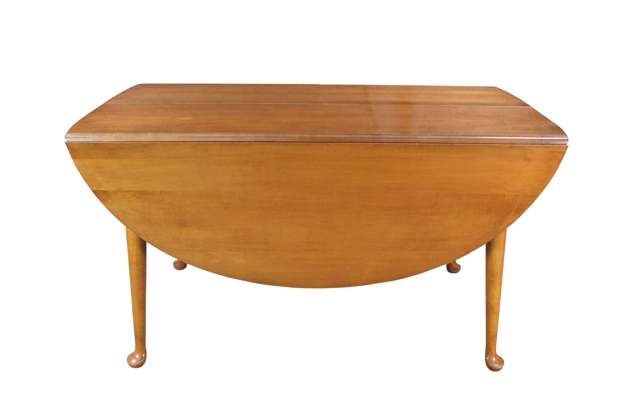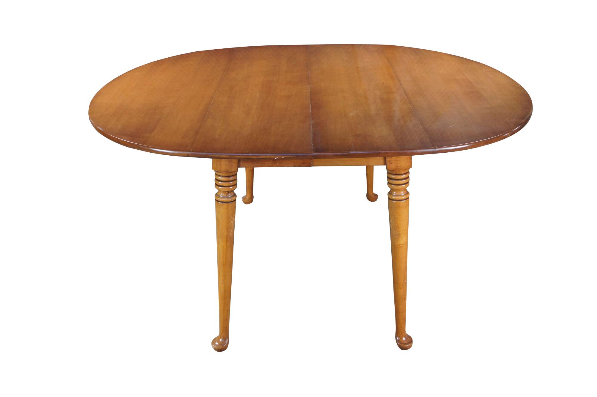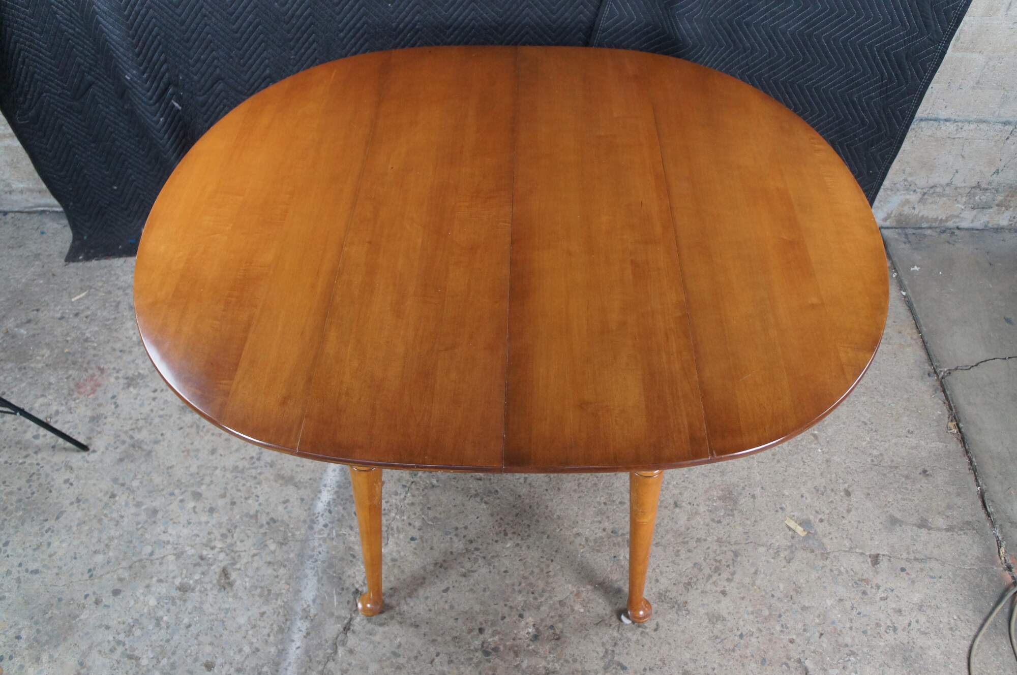 Mid century Early American Colonial style extendable country farmhouse drop leaf dining table. Made of maple featuring long turned legs with Queen Anne pad foot. Includes to leaves. Rike-Kumler Co, Dayton Ohio. Fact 460, style 825-55, Maple.