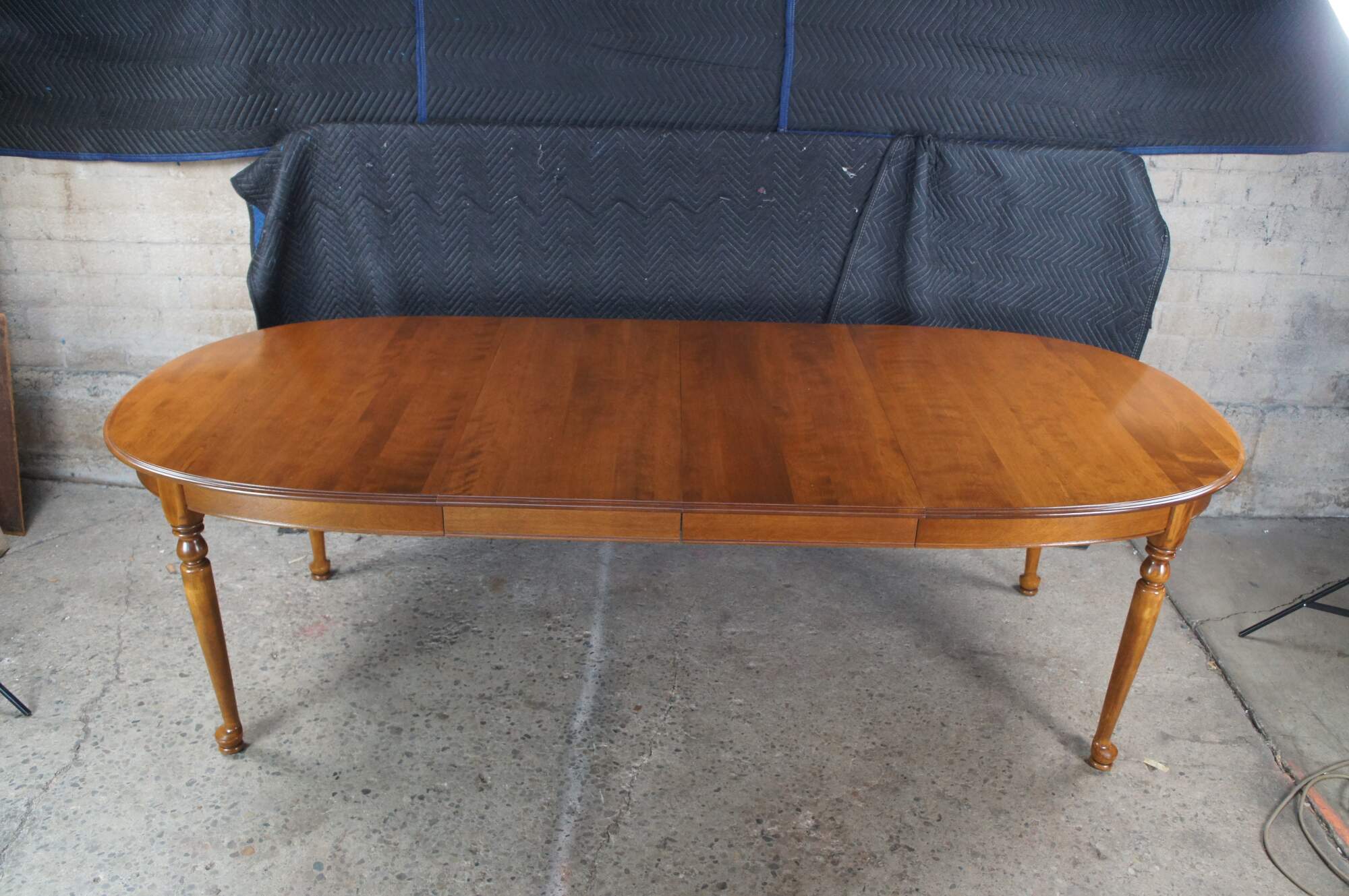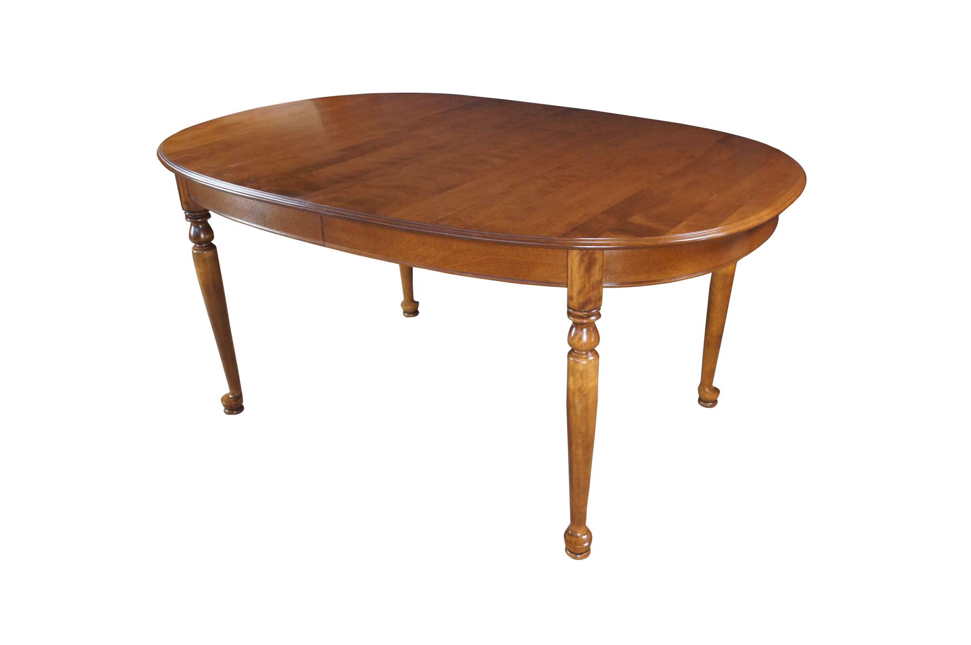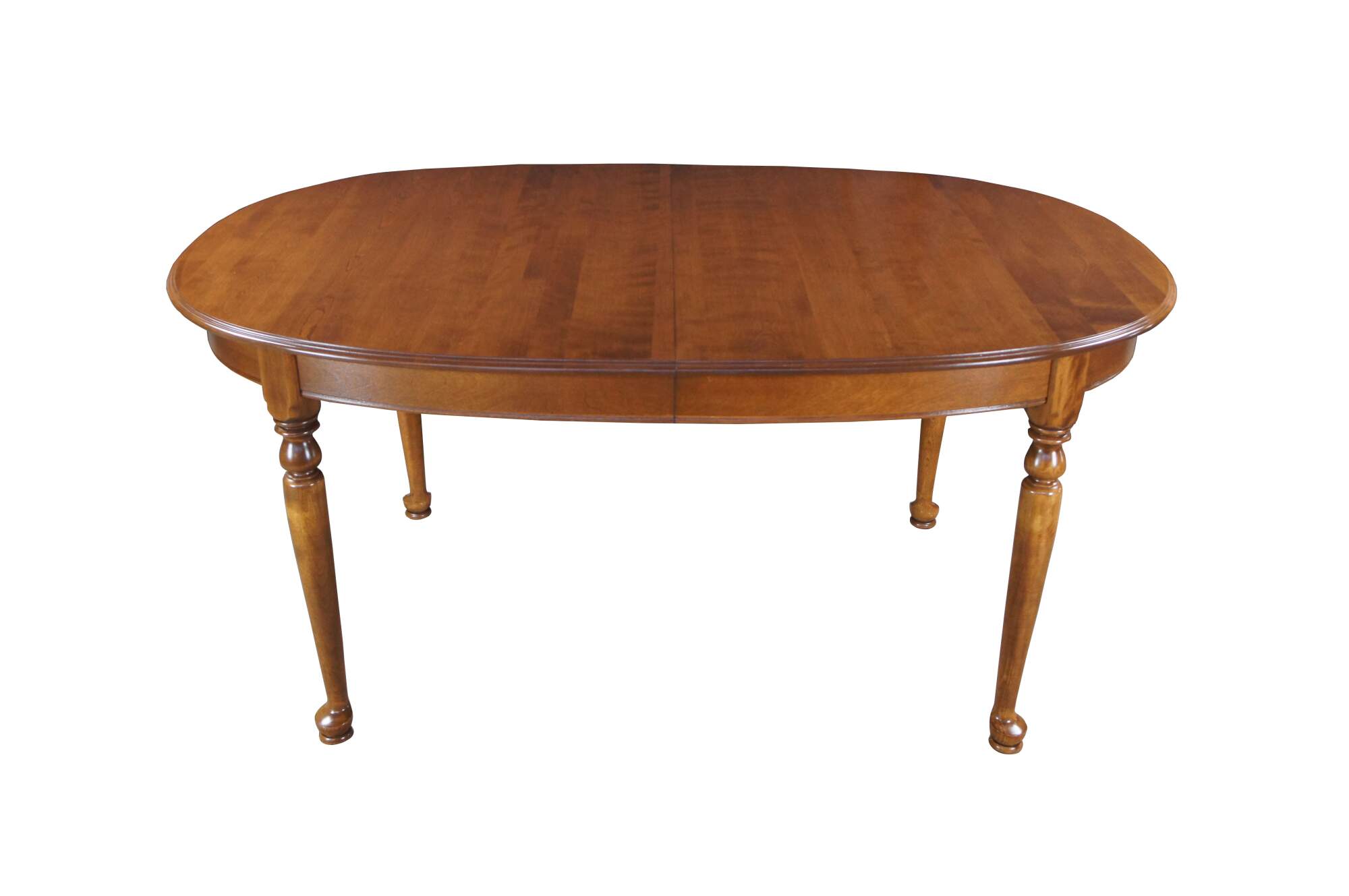 Vintage Ethan Allen Heirloom Collection Spoonfoot Oval Extension Table 10-6114. Made of Nutmeg Maple featuring oval form with extendable leaves and turned legs with pad feet. Includes two 18" leaves and table pads.