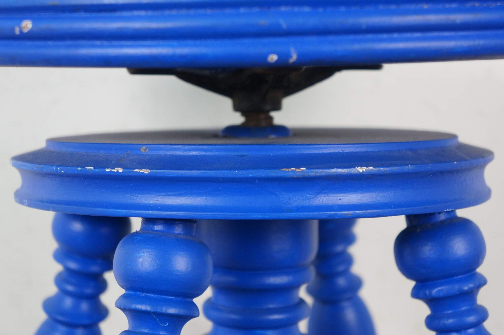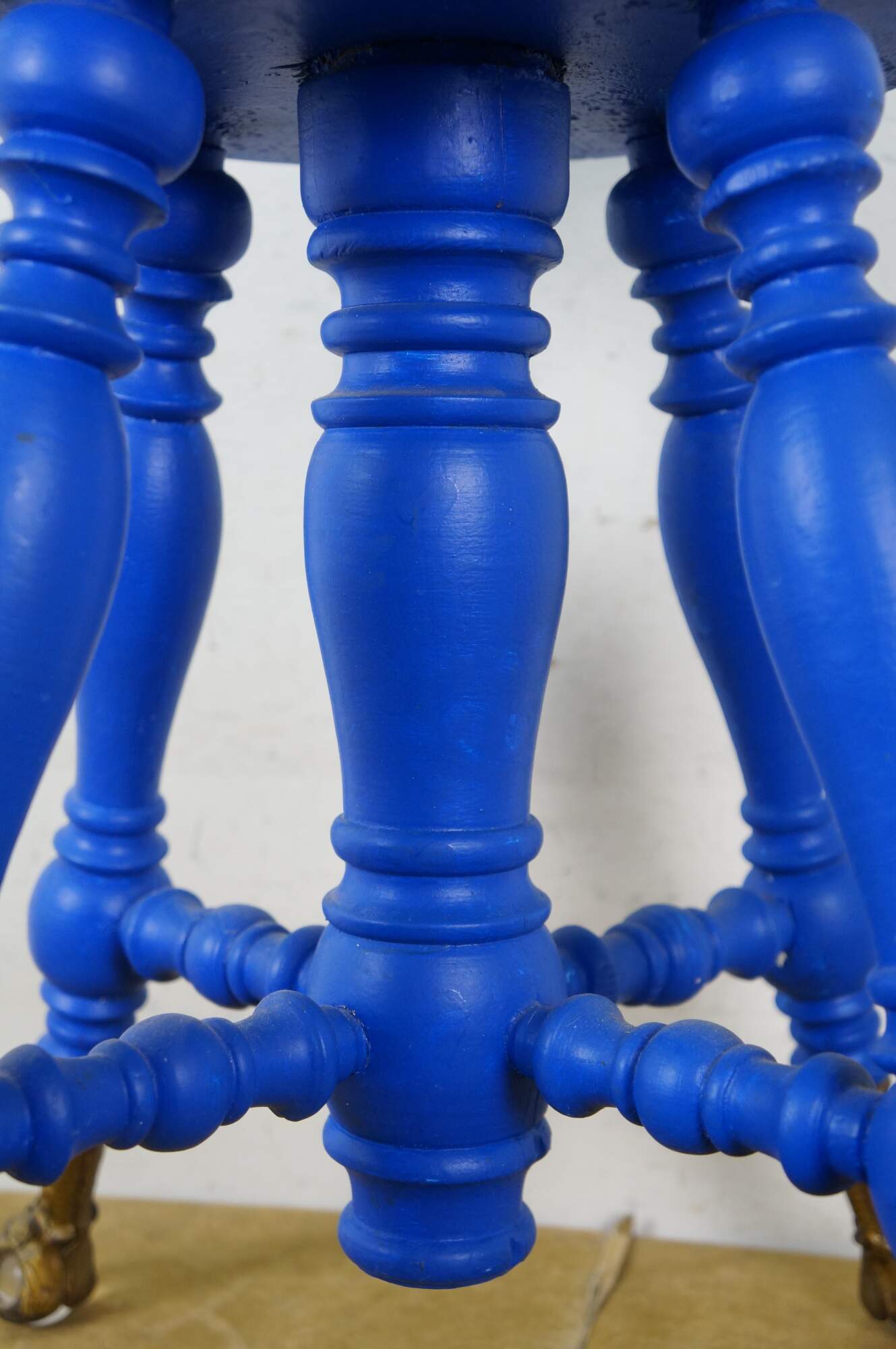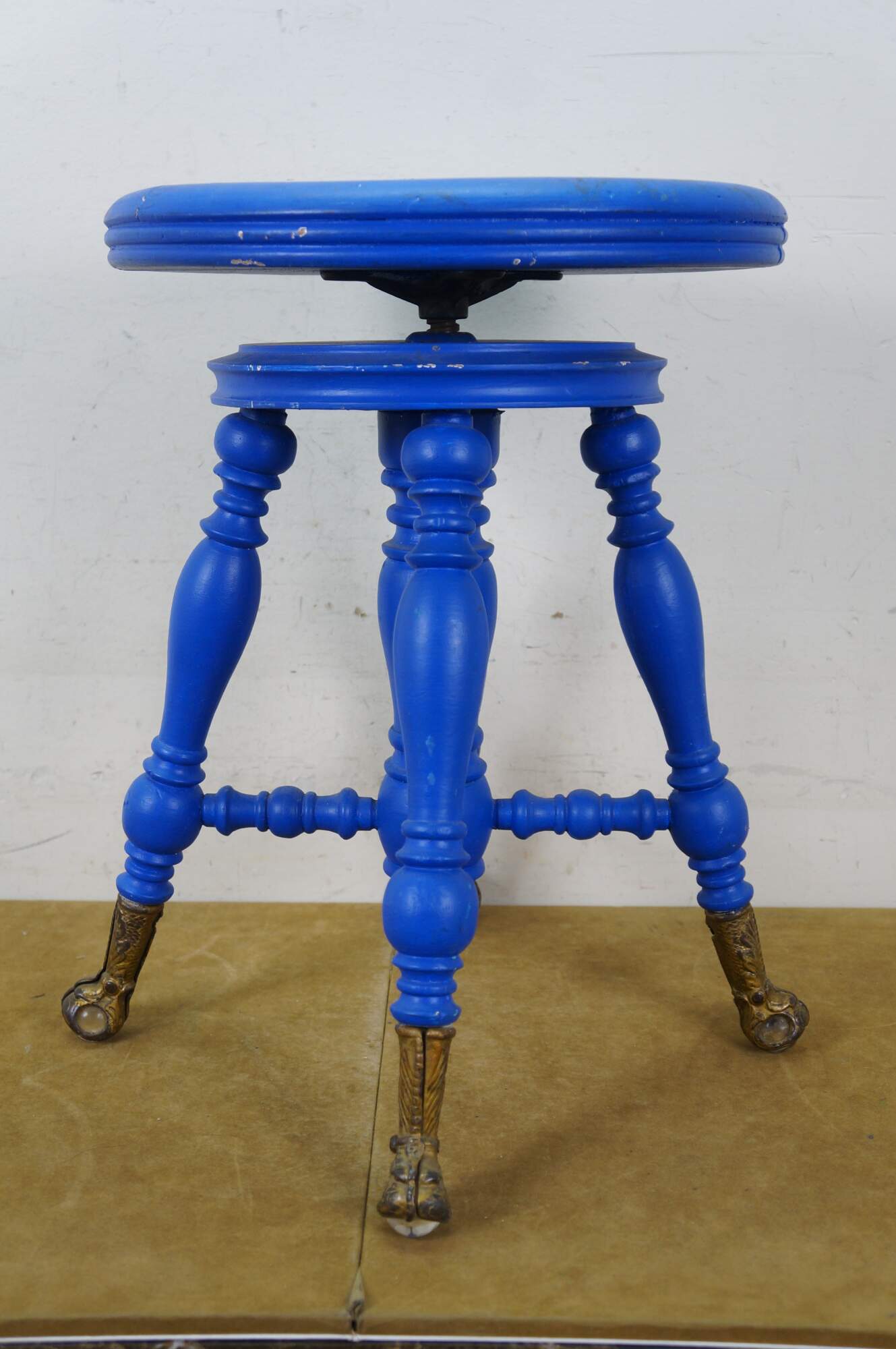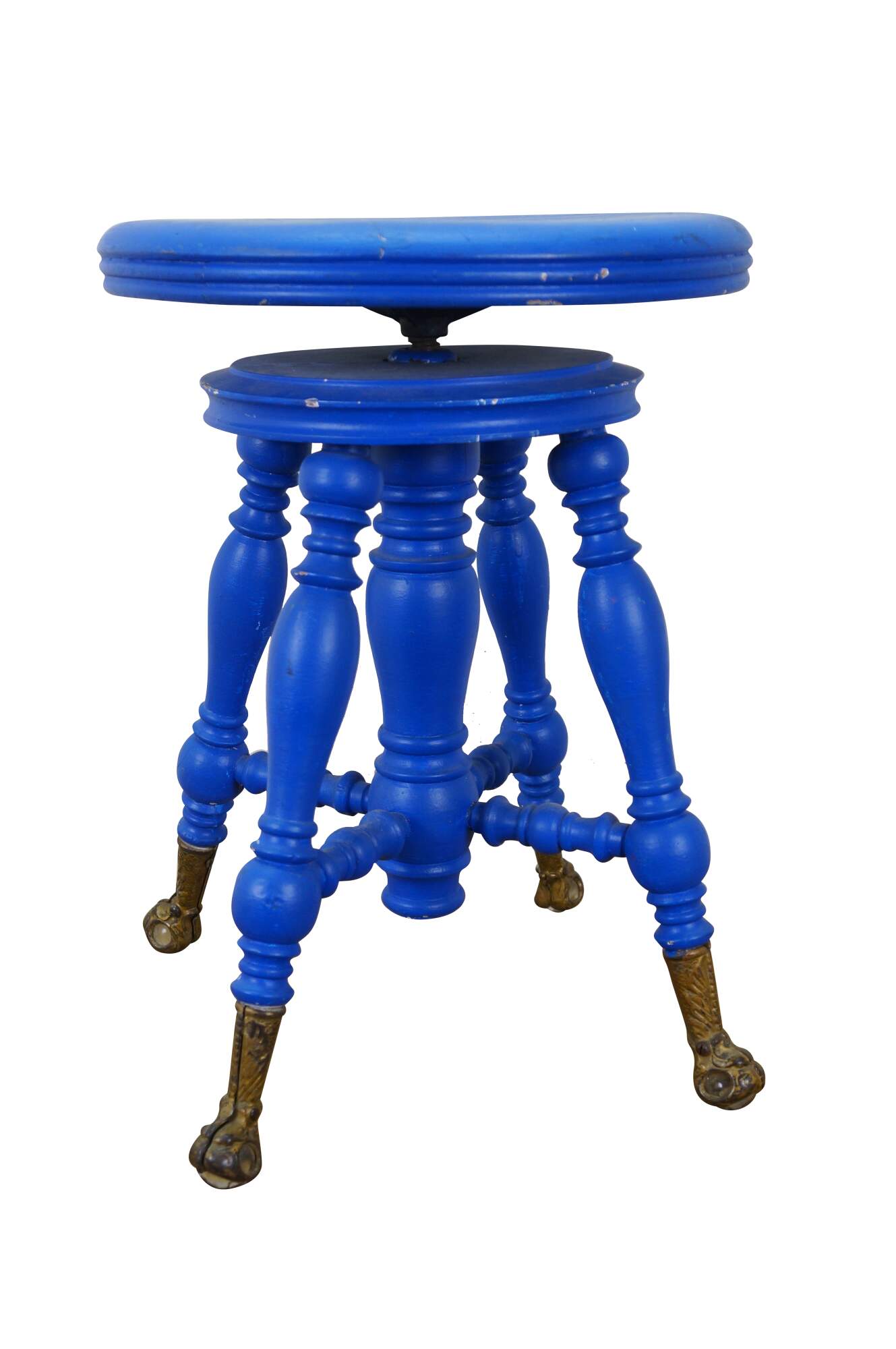Late 19th century Victorian era piano stool - round top with turned stretchers and legs, capped with patterned brass claw feet clutching glass balls. Originally height would have been adjustable by turning the top on the center screw. Painted bright blue. Made by H. Holtzman & Sons of Columbus, Ohio.