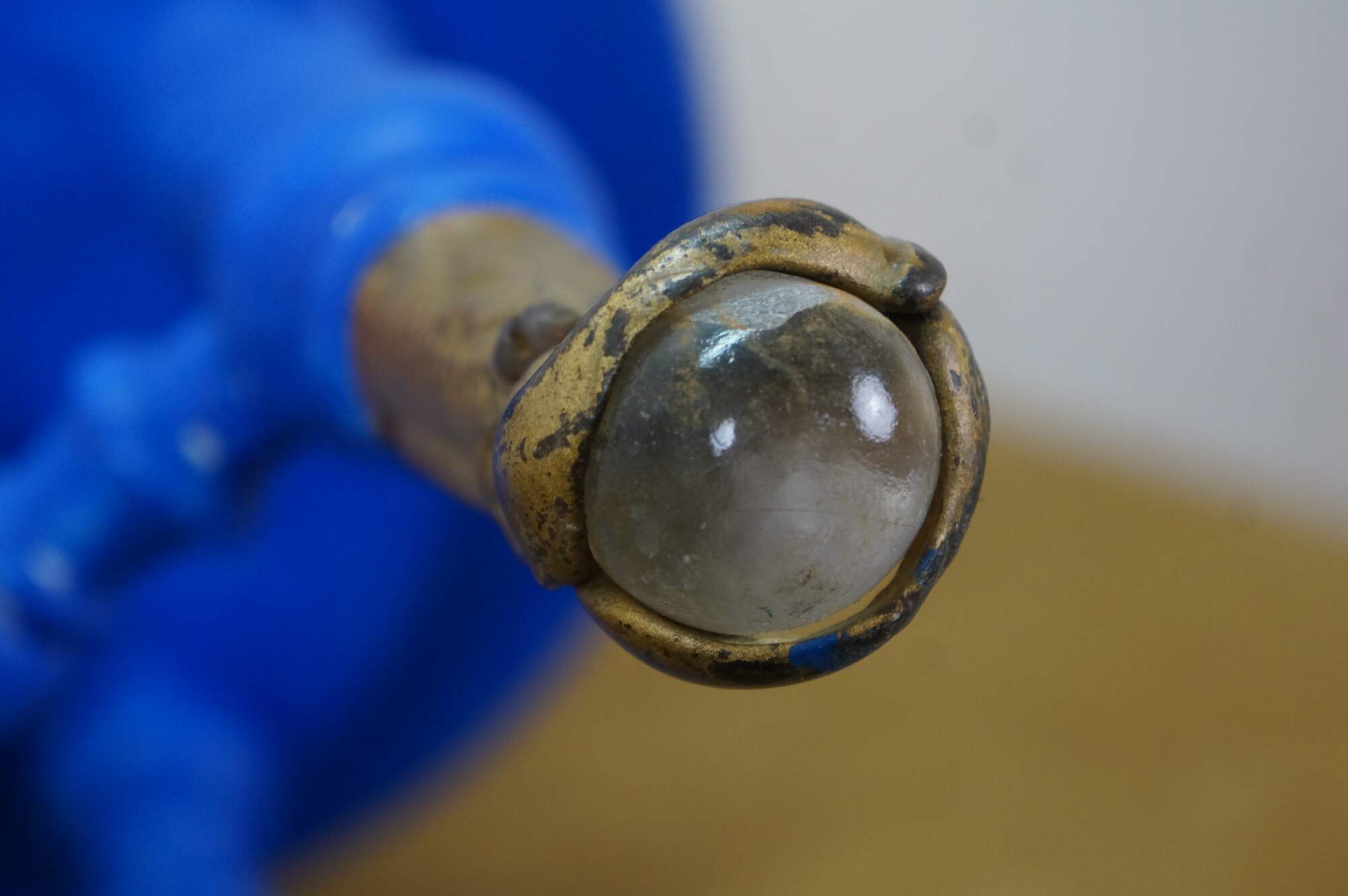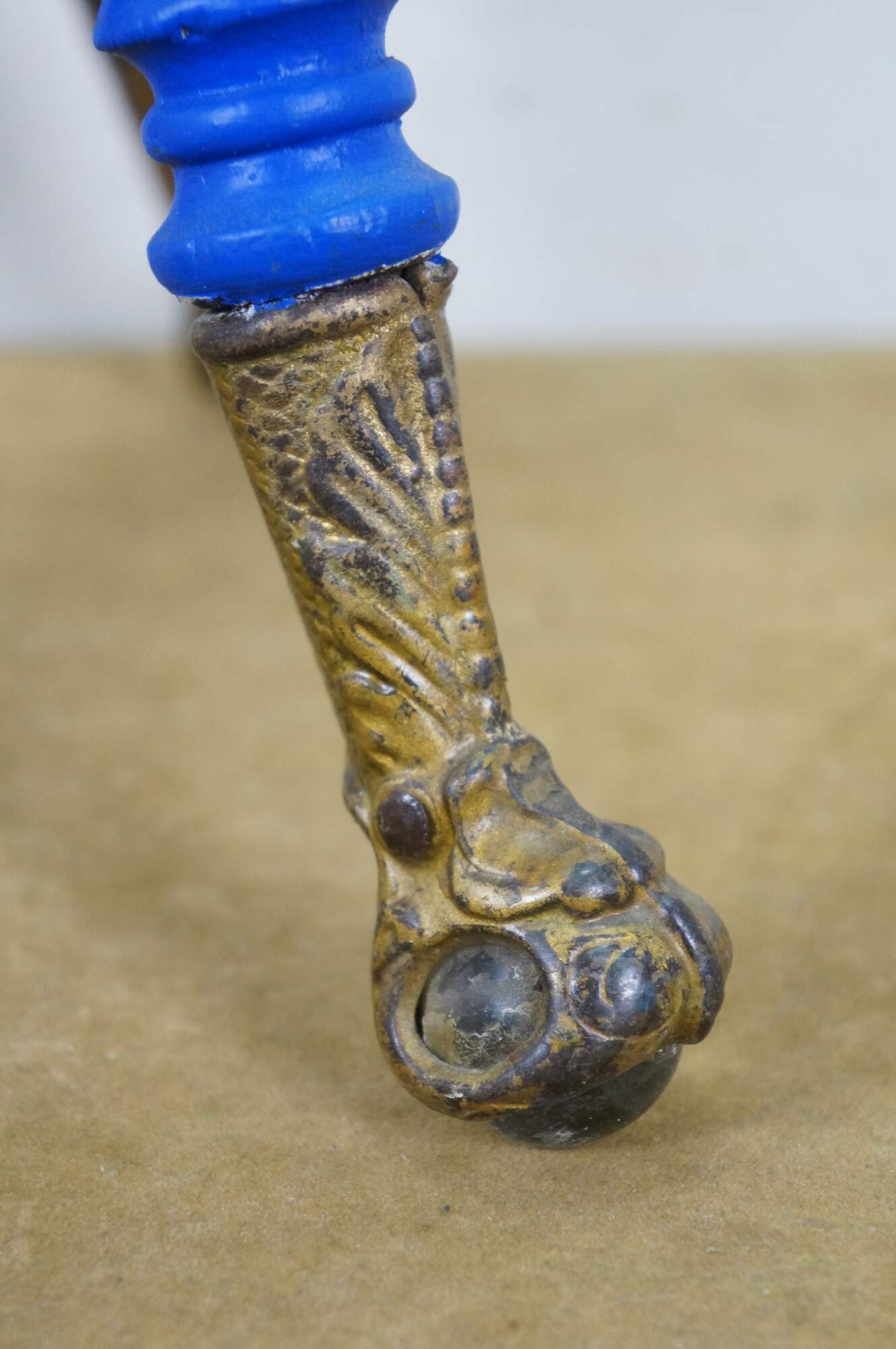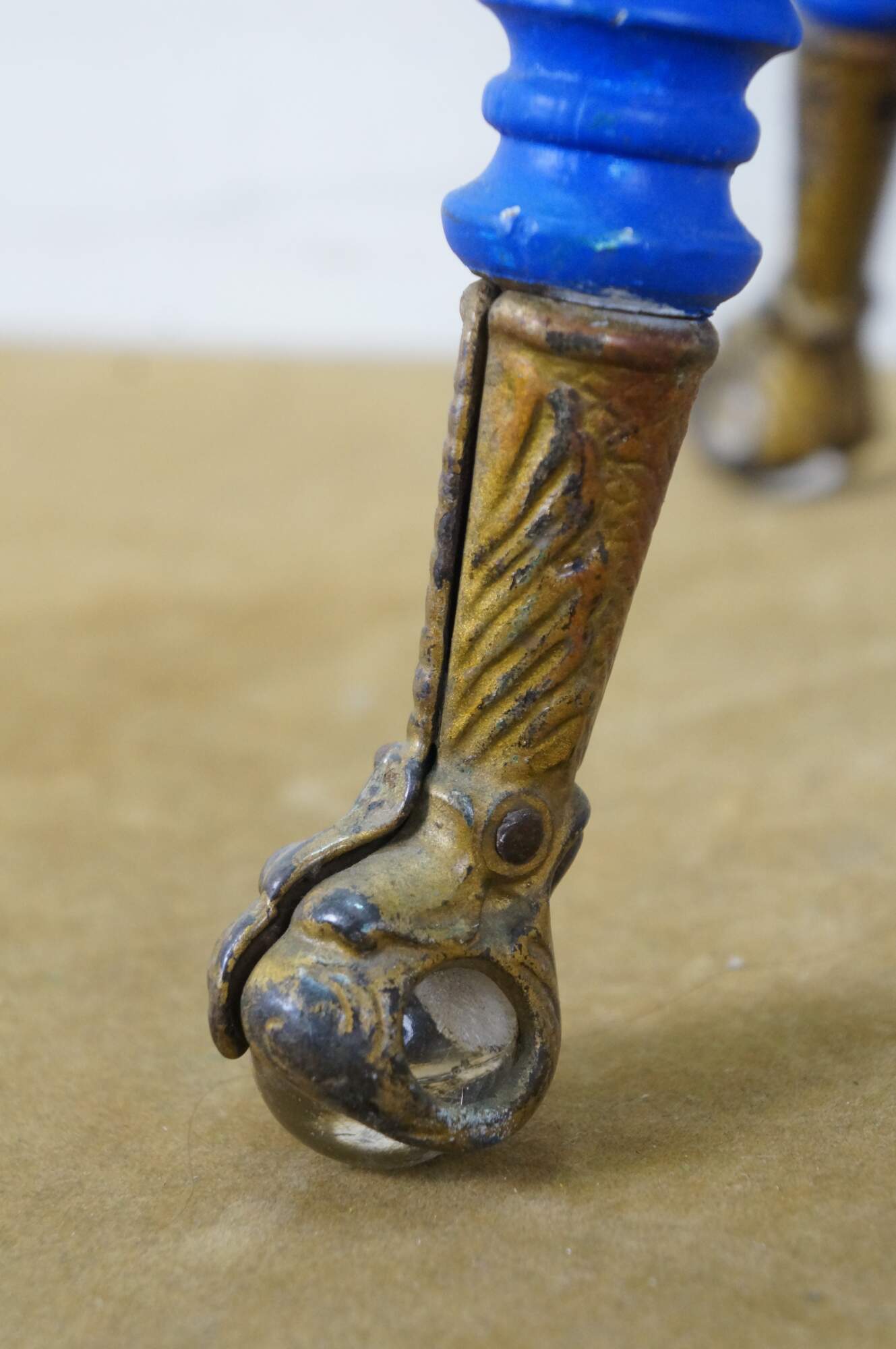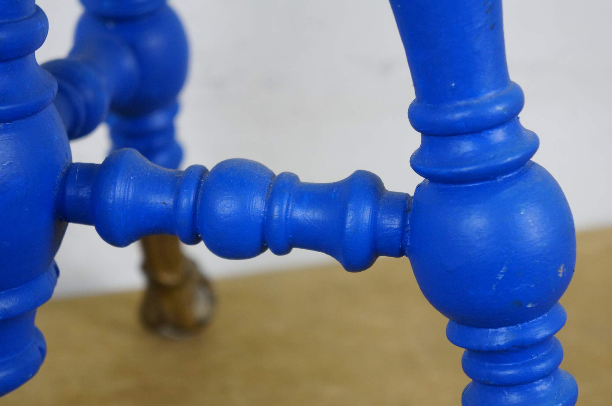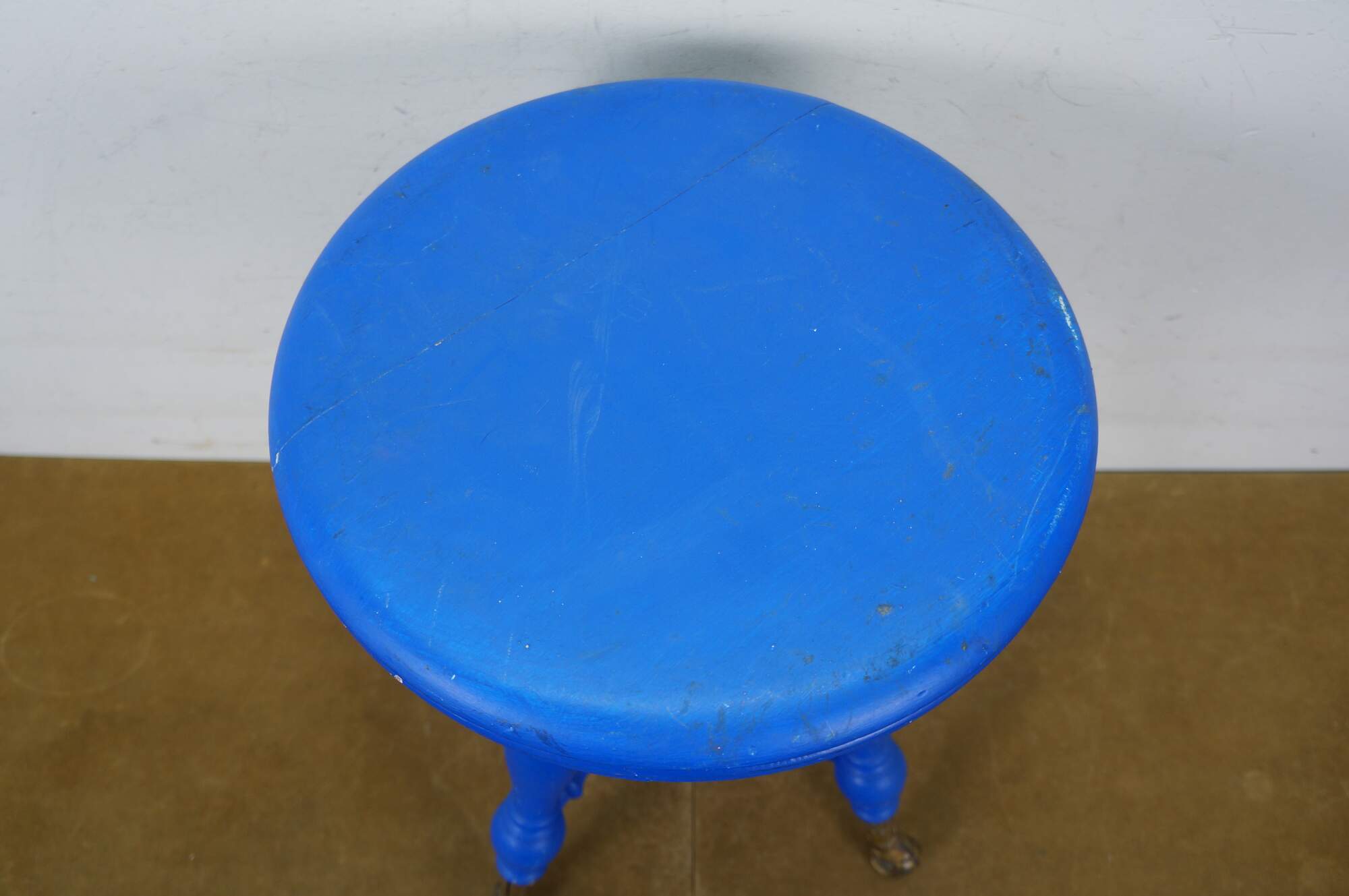 Late 19th century Victorian era piano stool - round top with turned stretchers and legs, capped with patterned brass claw feet clutching glass balls. Originally height would have been adjustable by turning the top on the center screw. Painted bright blue. Made by H. Holtzman & Sons of Columbus, Ohio.