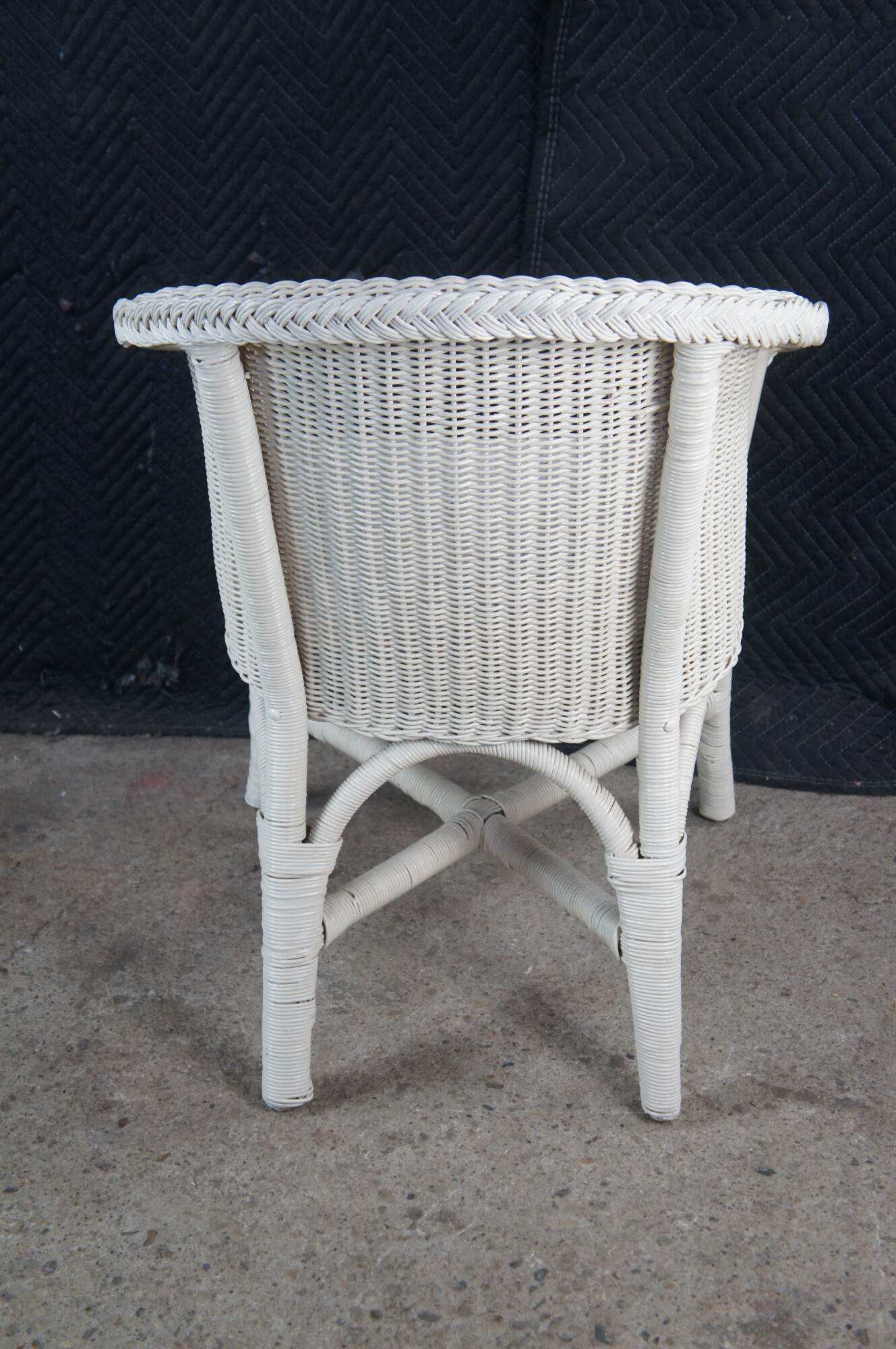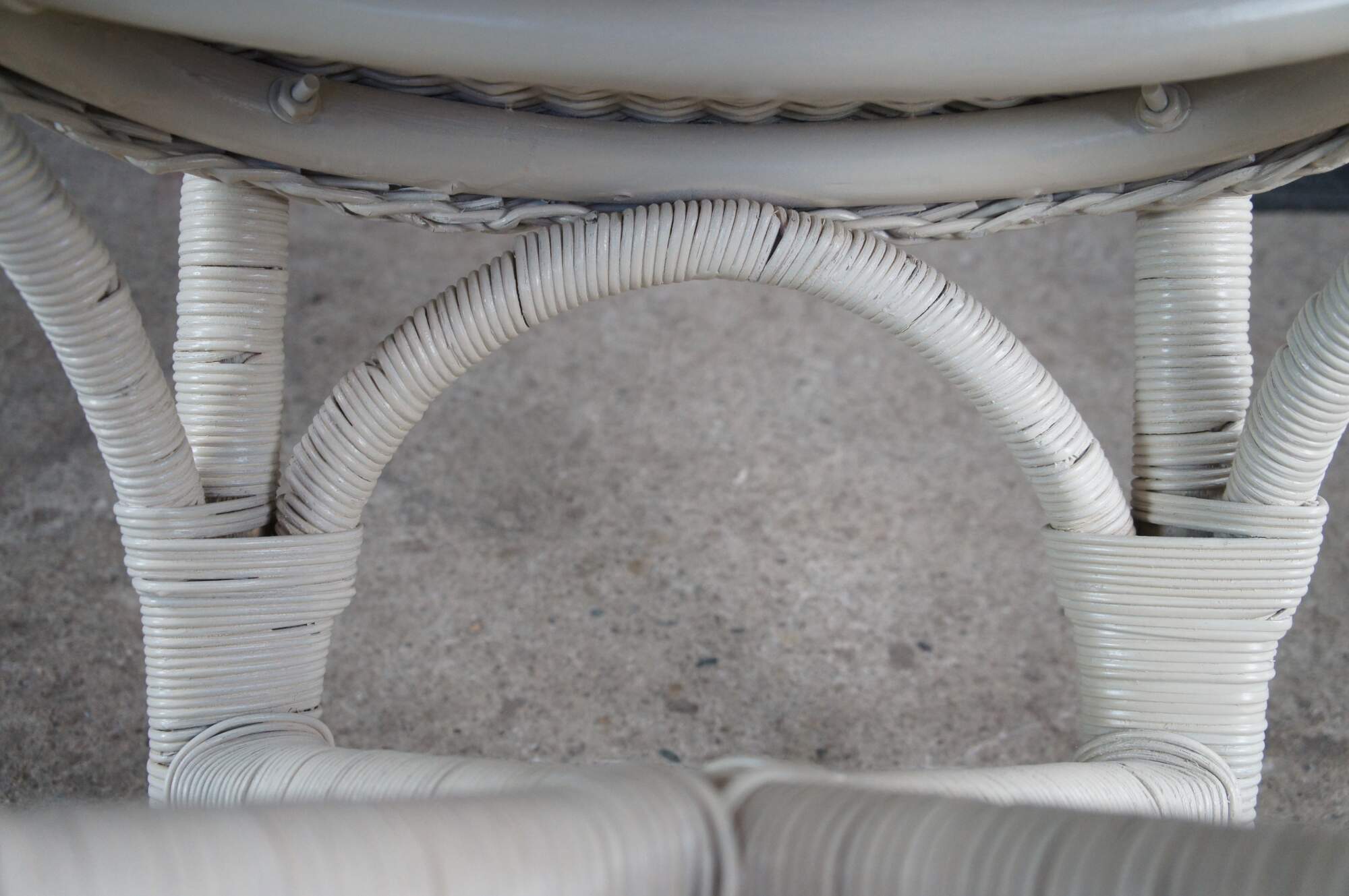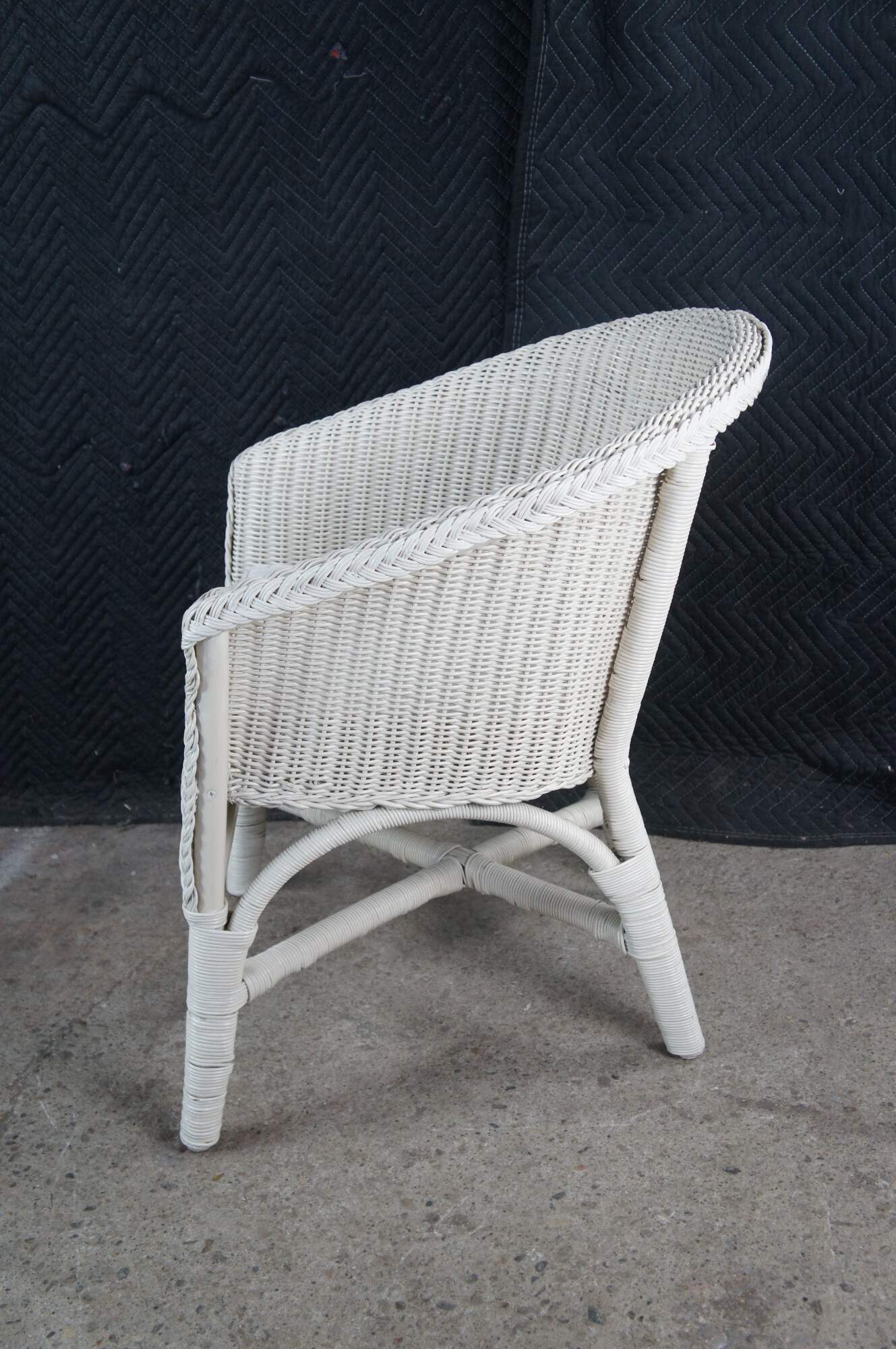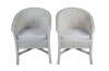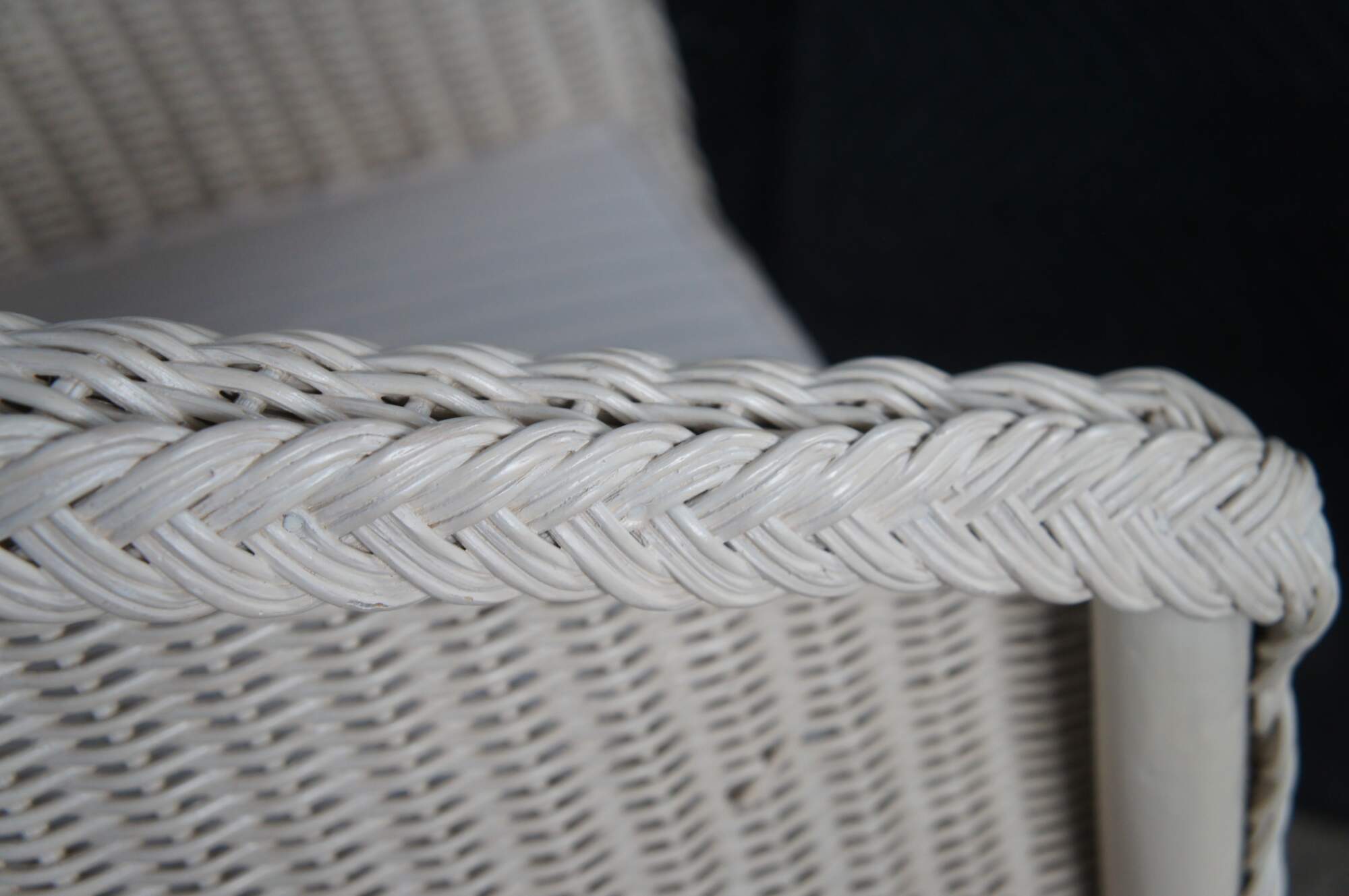 Two vintage white wicker arm chairs featuring a woven and braided design with sloped arms and striped seat cushions.
