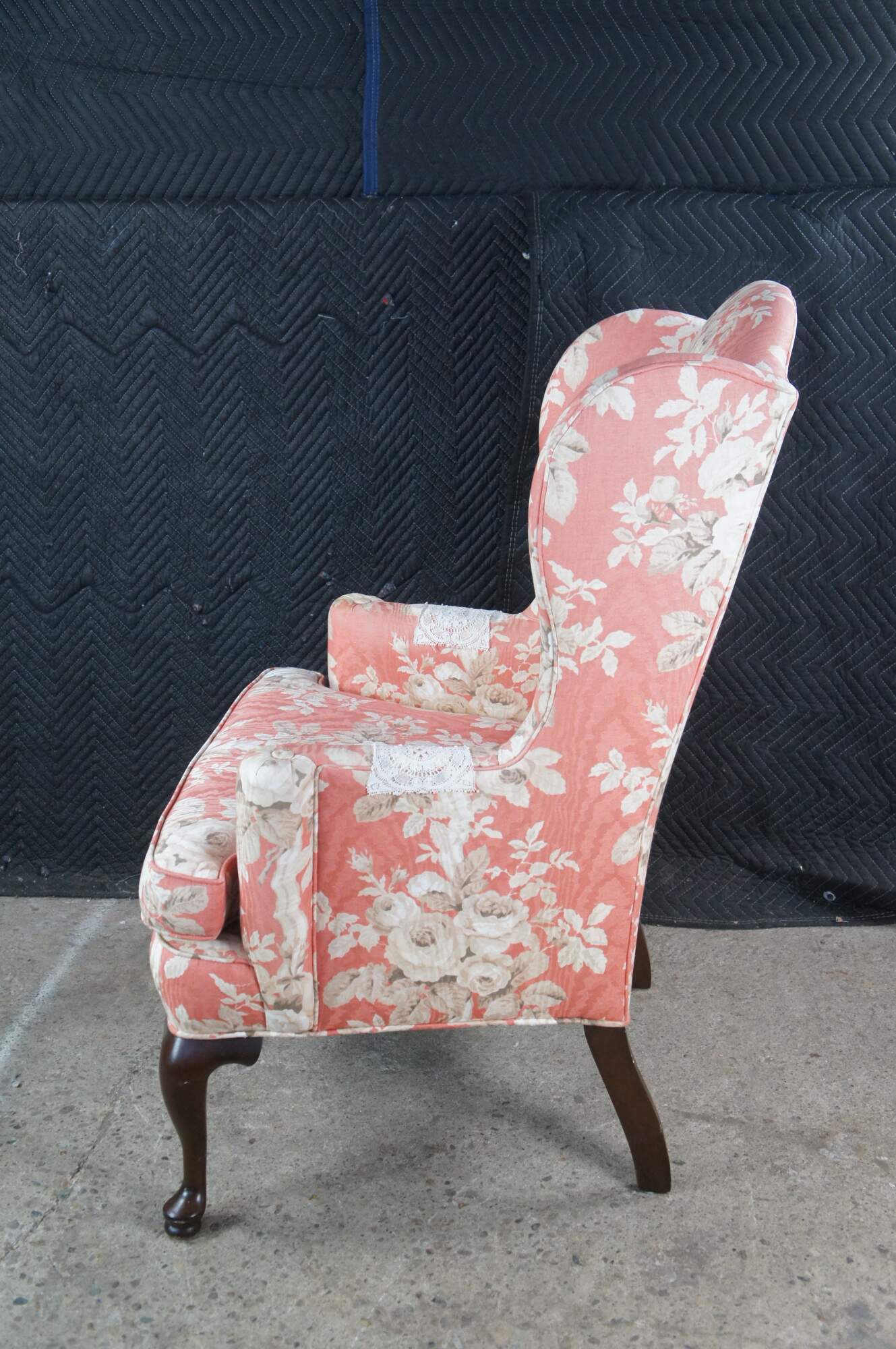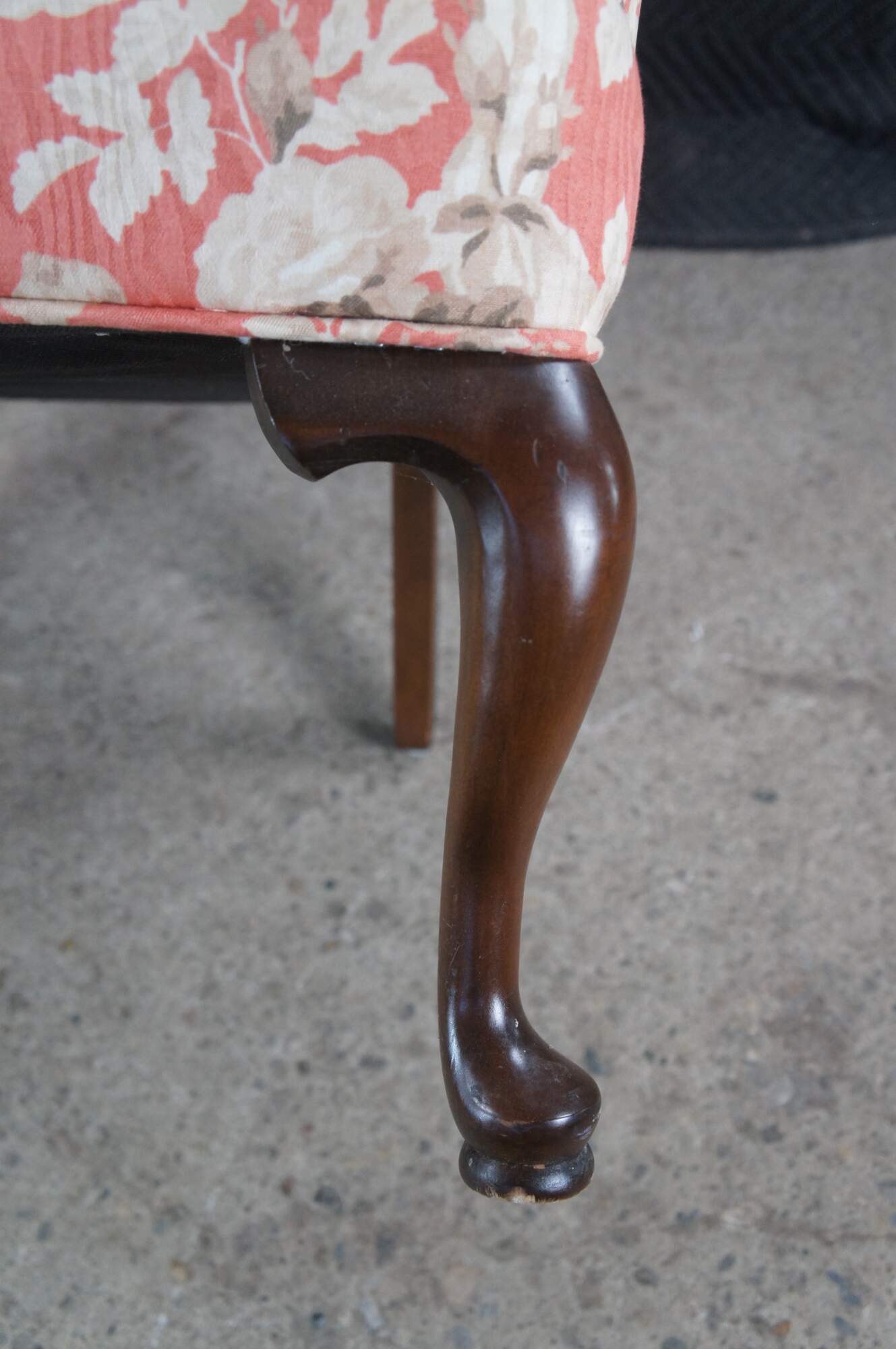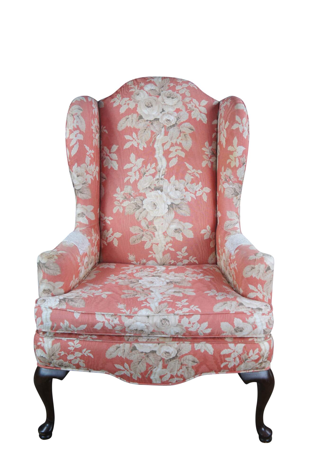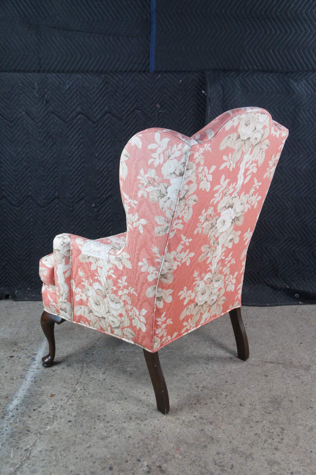 Vintage Ethan Allen Queen Anne / Georgian style arm chair featuring a wingback design supported by mahogany legs.