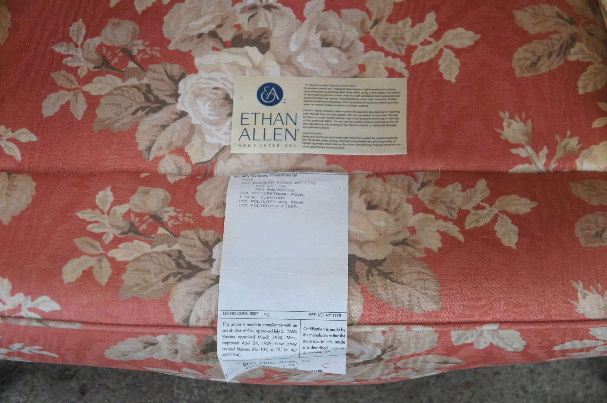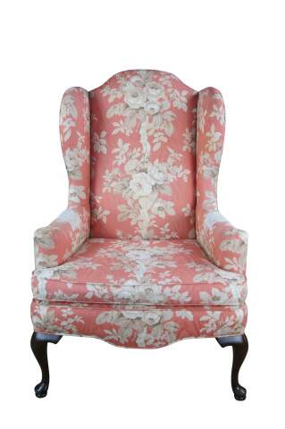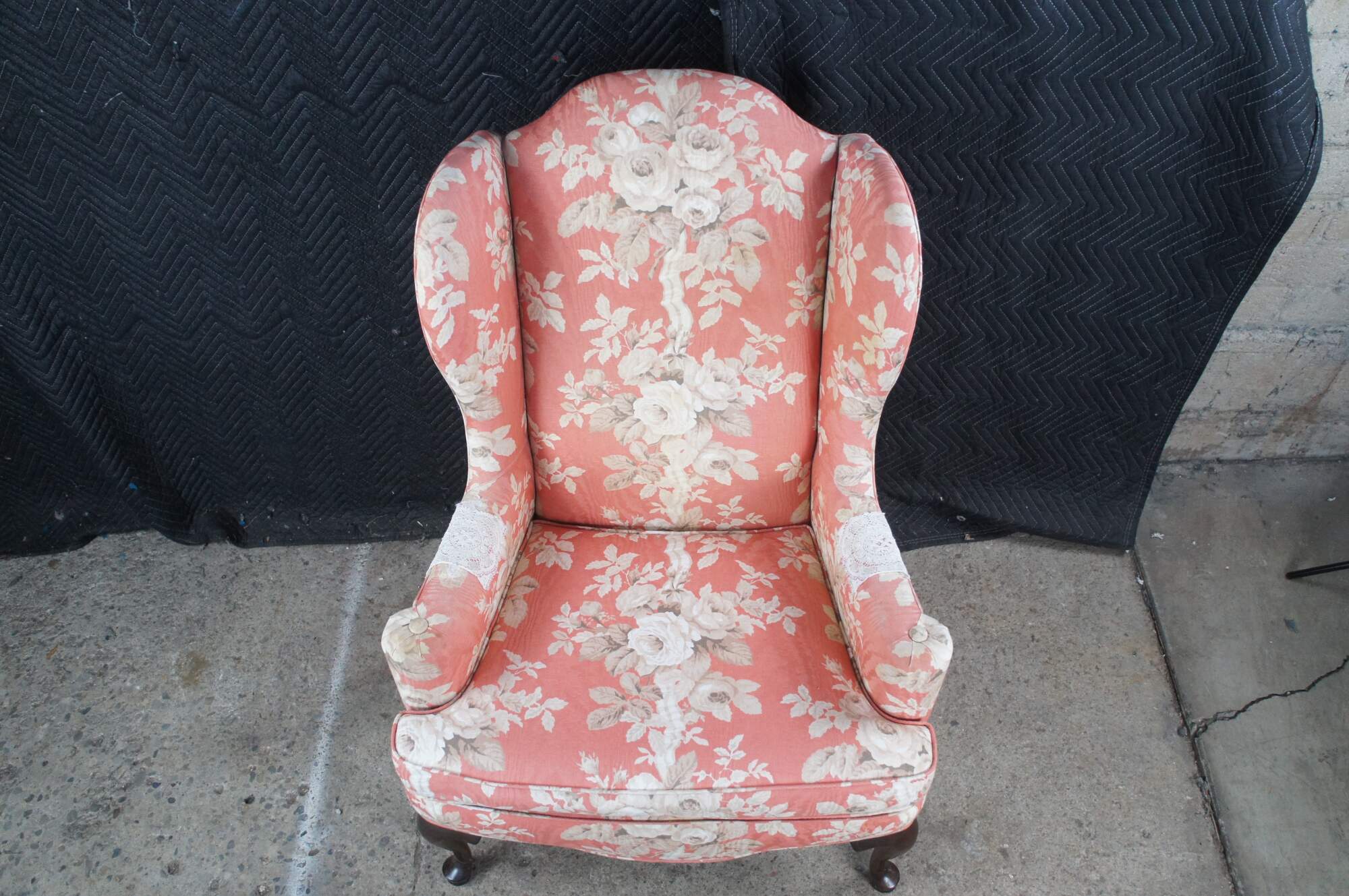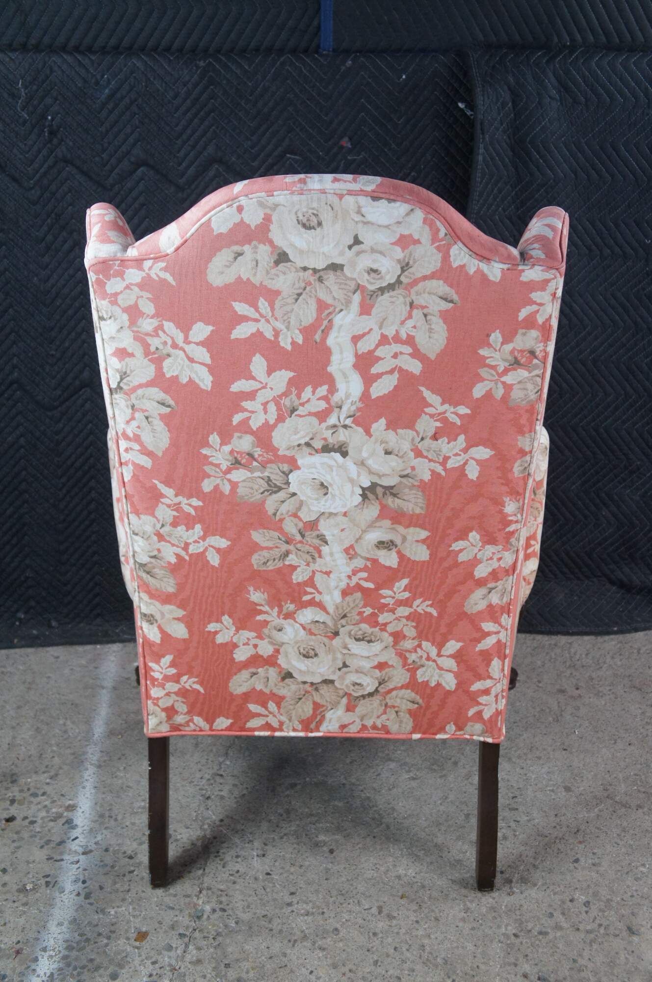 Vintage Ethan Allen Queen Anne / Georgian style arm chair featuring a wingback design supported by mahogany legs.