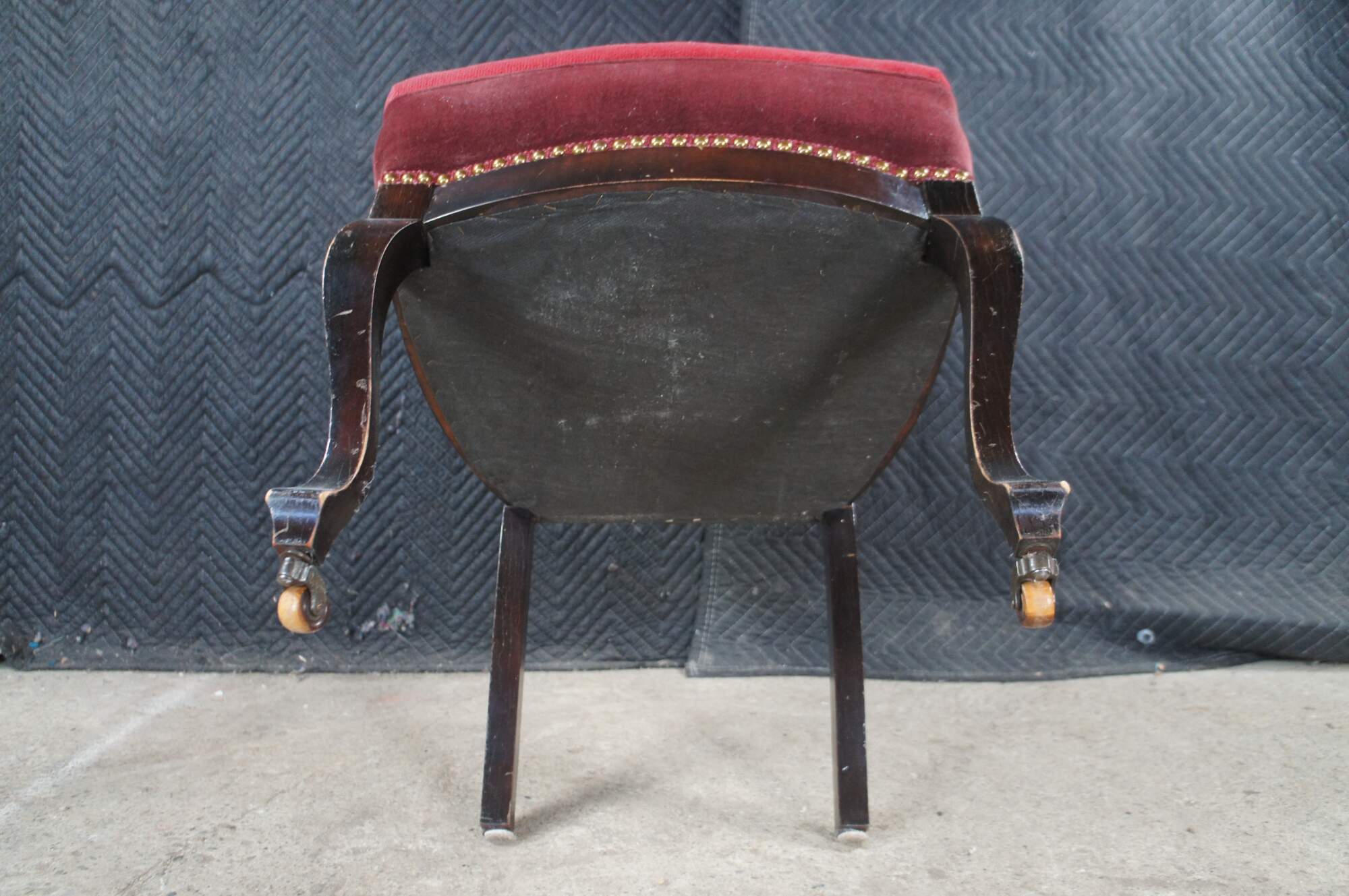 Antique English Edwardian vanity / desk / parlor side chair. Made of mahogany featuring a Neoclassical floral needlepoint design with nailhead trim and serpentine front legs with castors.