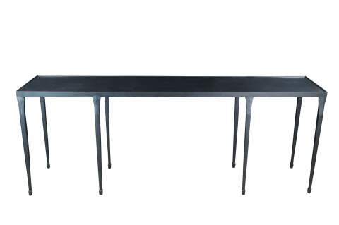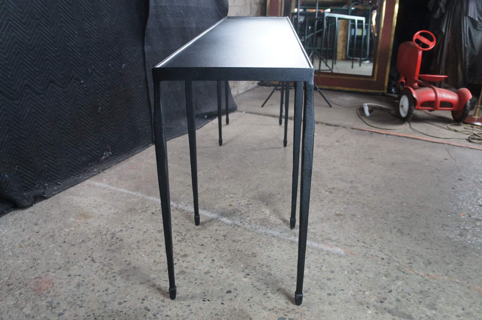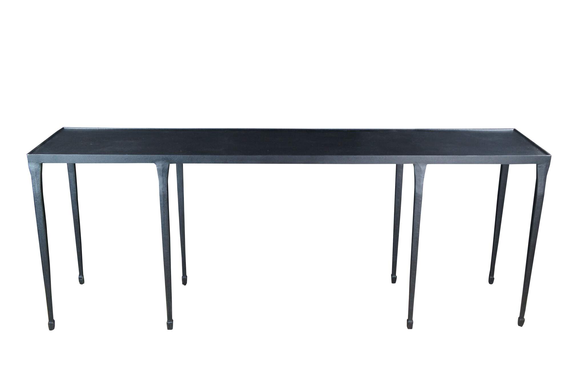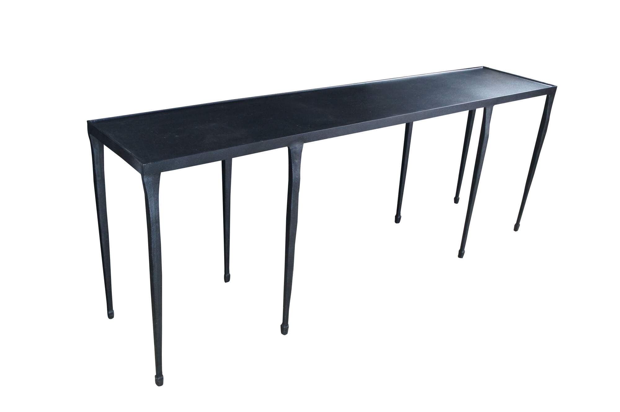Inspired by modernist art, the Bernhardt Silviano entry console table refines the rustic character of cast iron and steel. It features sculptural detailing with eight attenuated tapered legs supporting the long textured metal top. Made in Mexico.