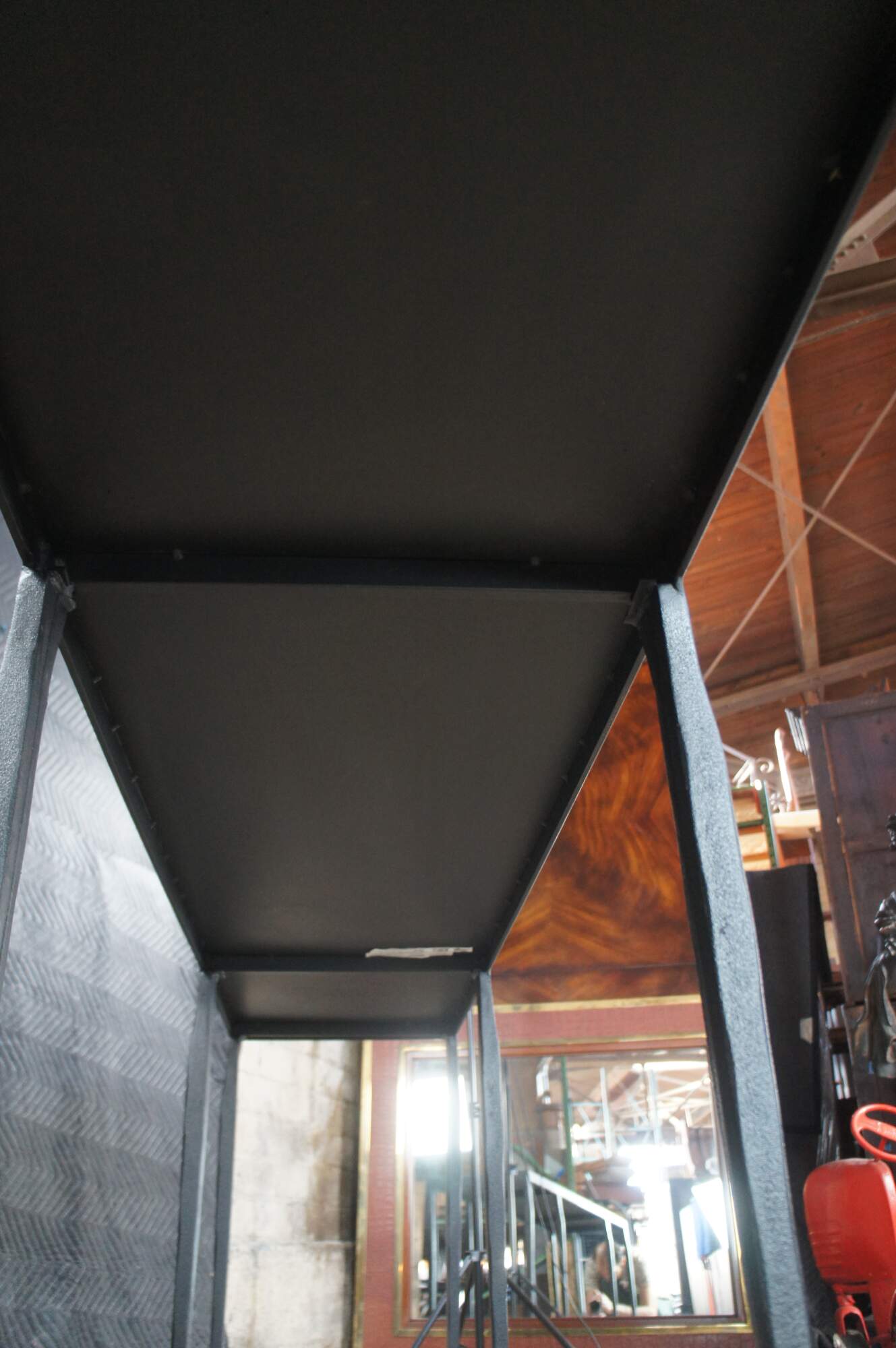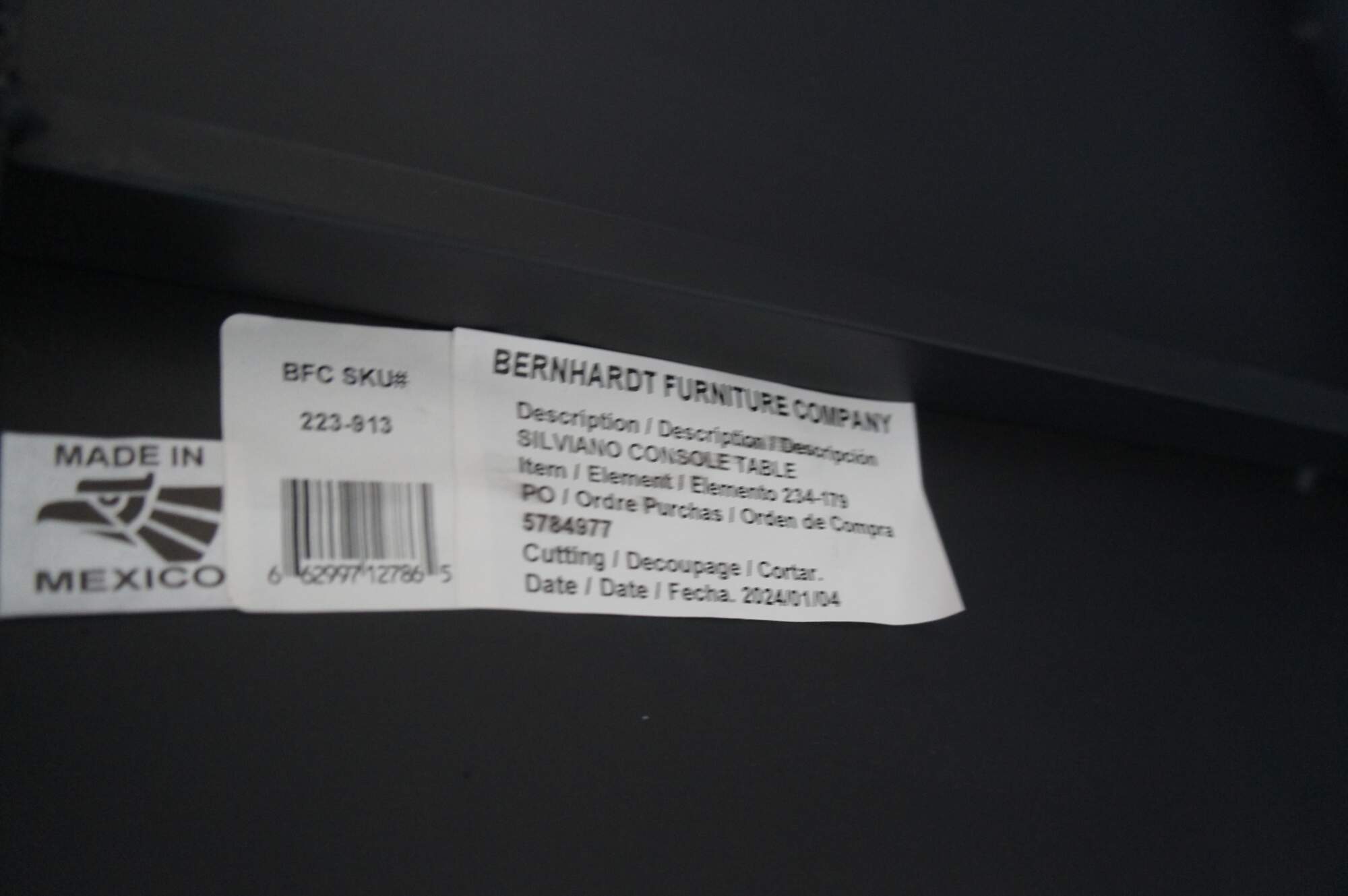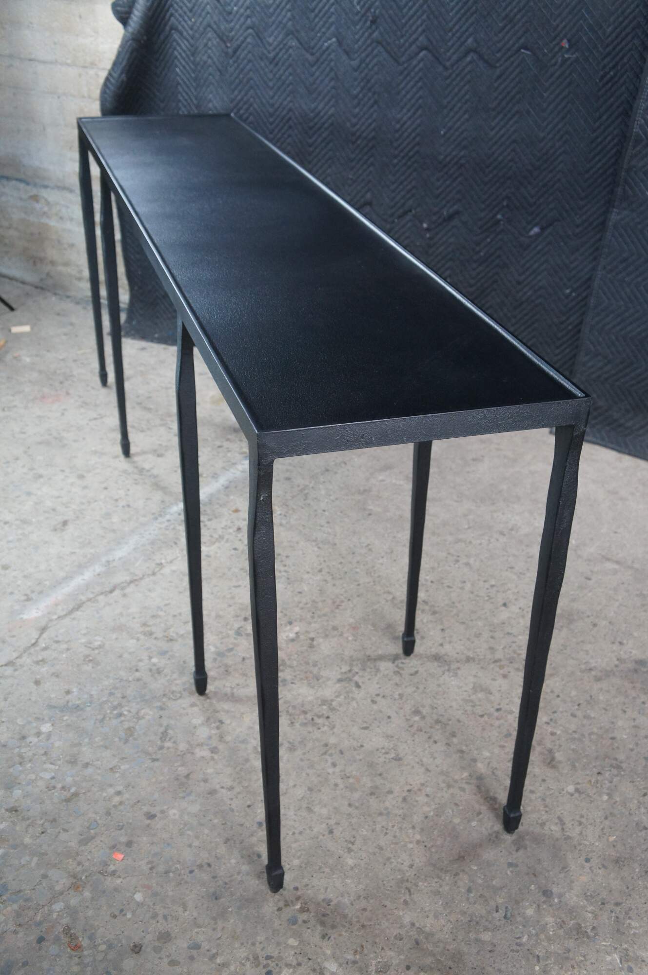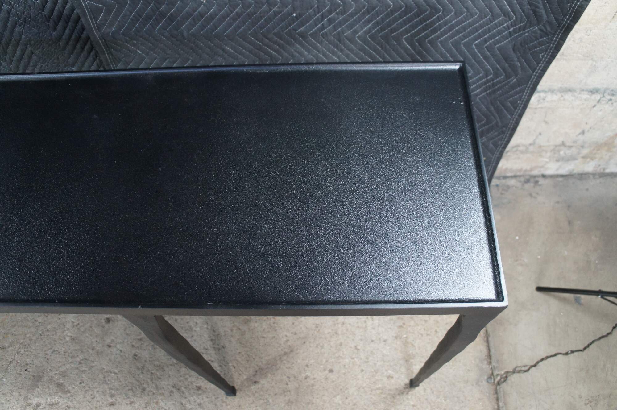 Inspired by modernist art, the Bernhardt Silviano entry console table refines the rustic character of cast iron and steel. It features sculptural detailing with eight attenuated tapered legs supporting the long textured metal top. Made in Mexico.
