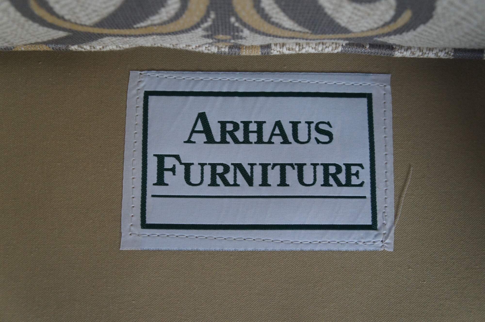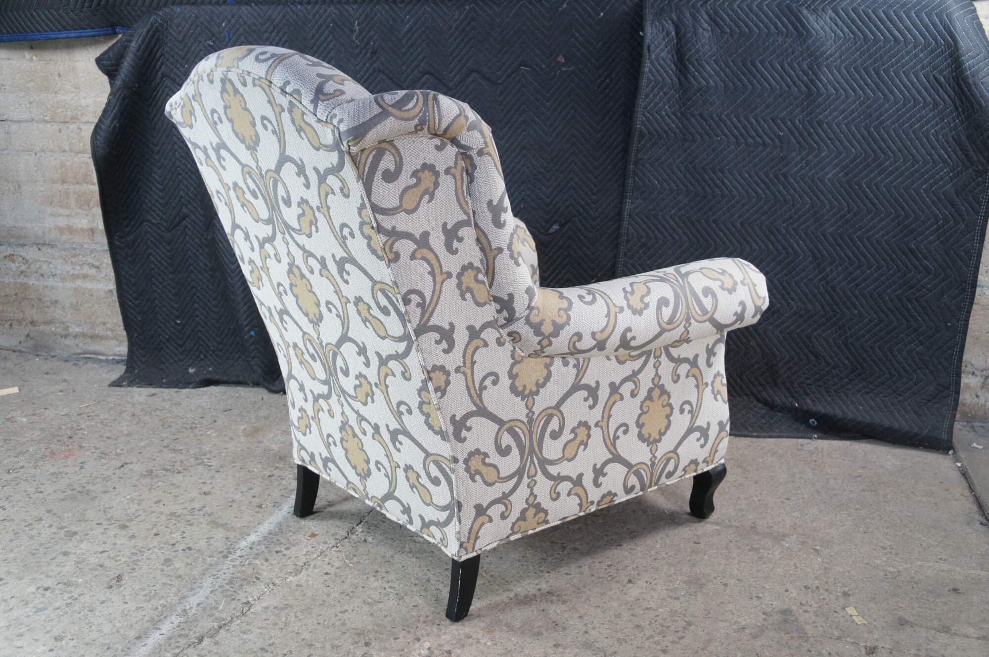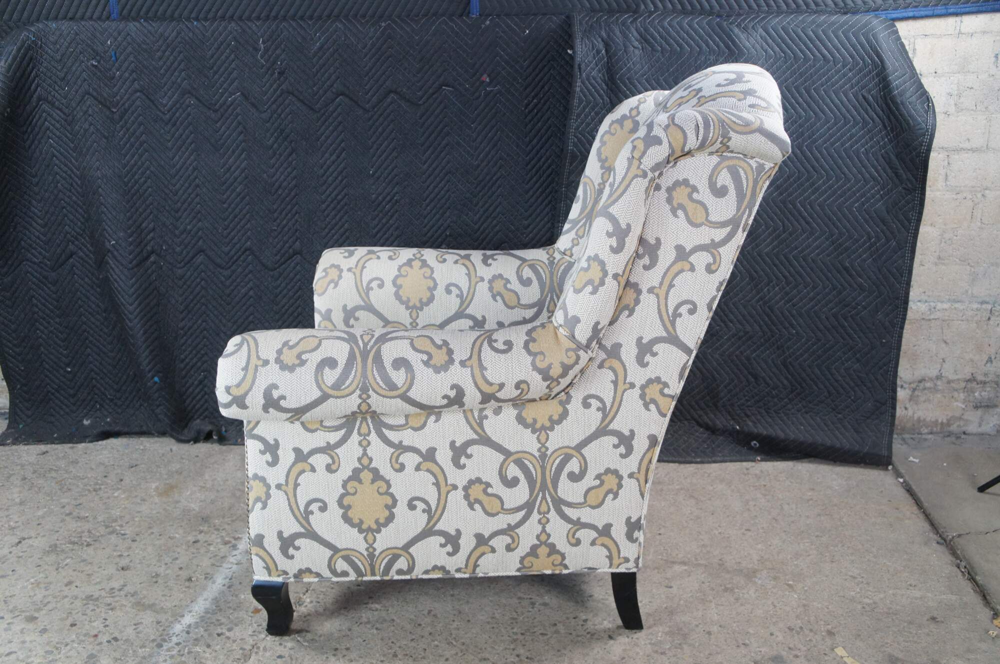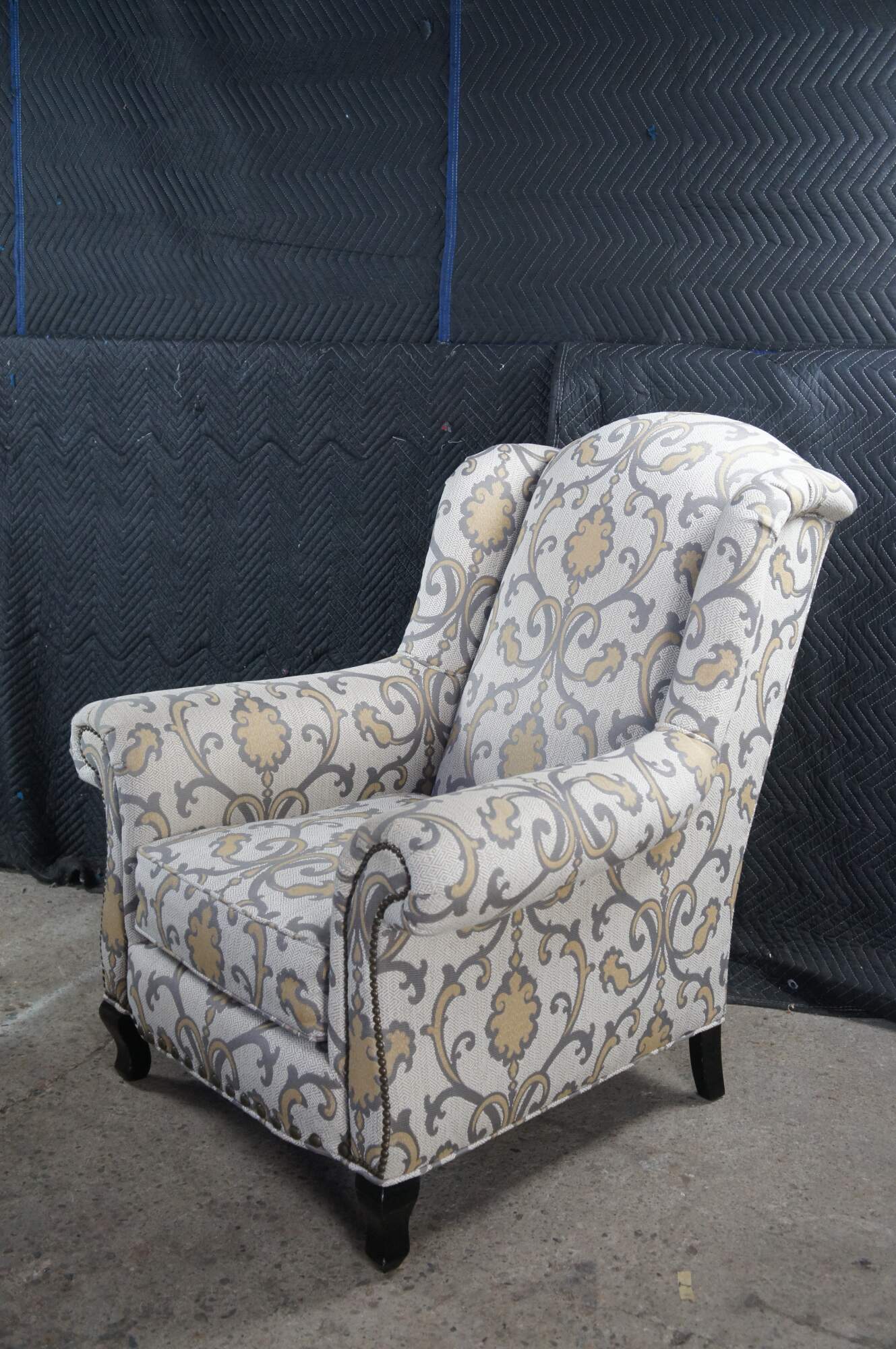 Vintage Arhaus Furniture Cambridge oversized arm chairs. Traditional styling with shallow wings, rolled arms, and a floral acanthus upholstery with nailhead accents