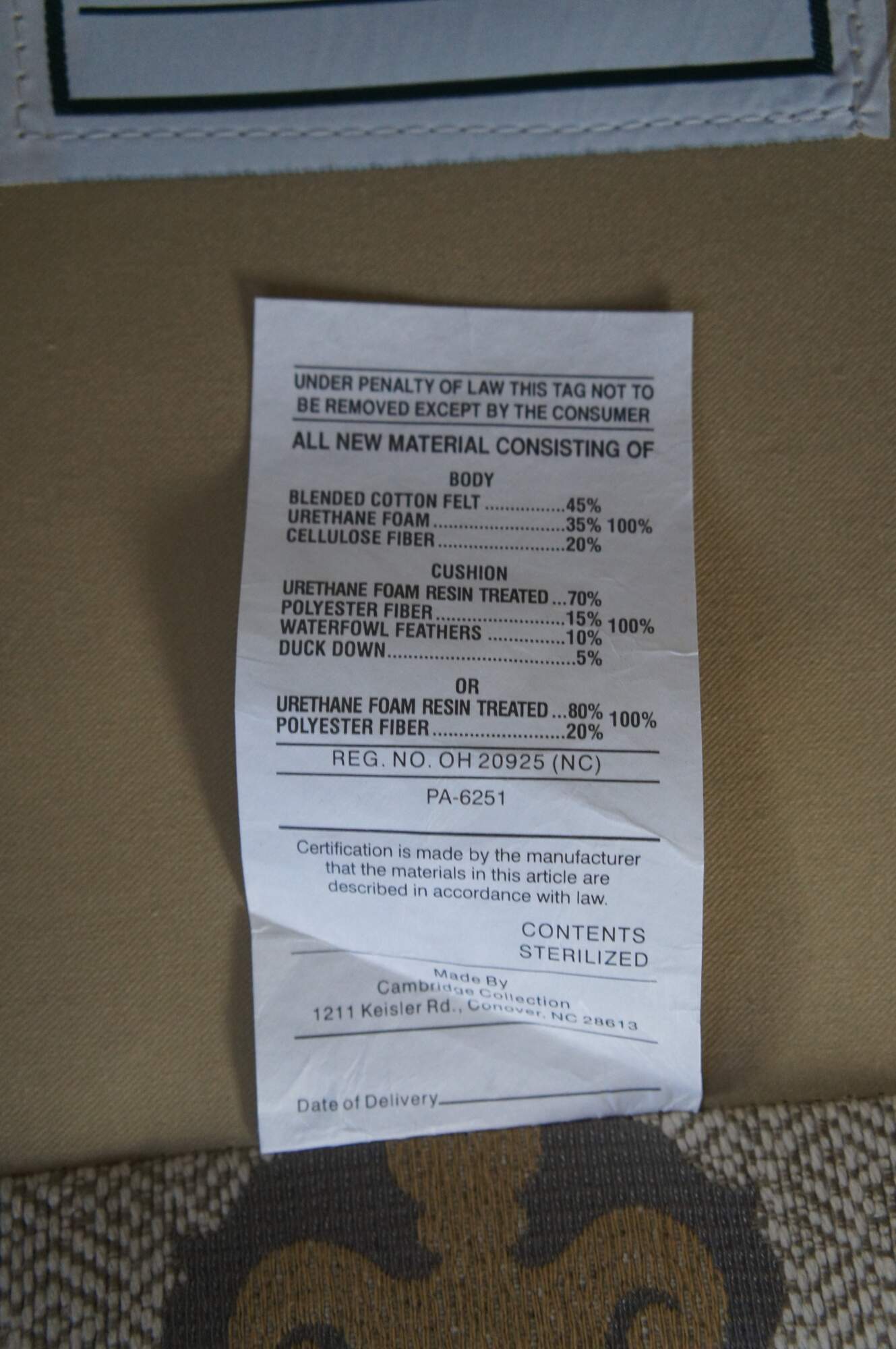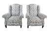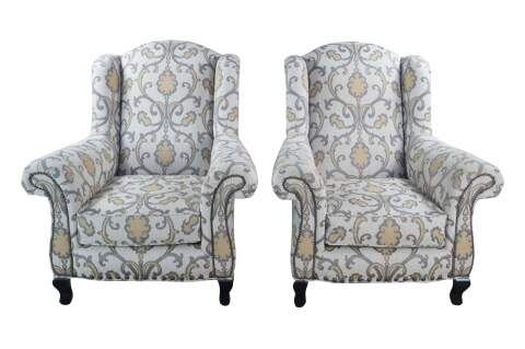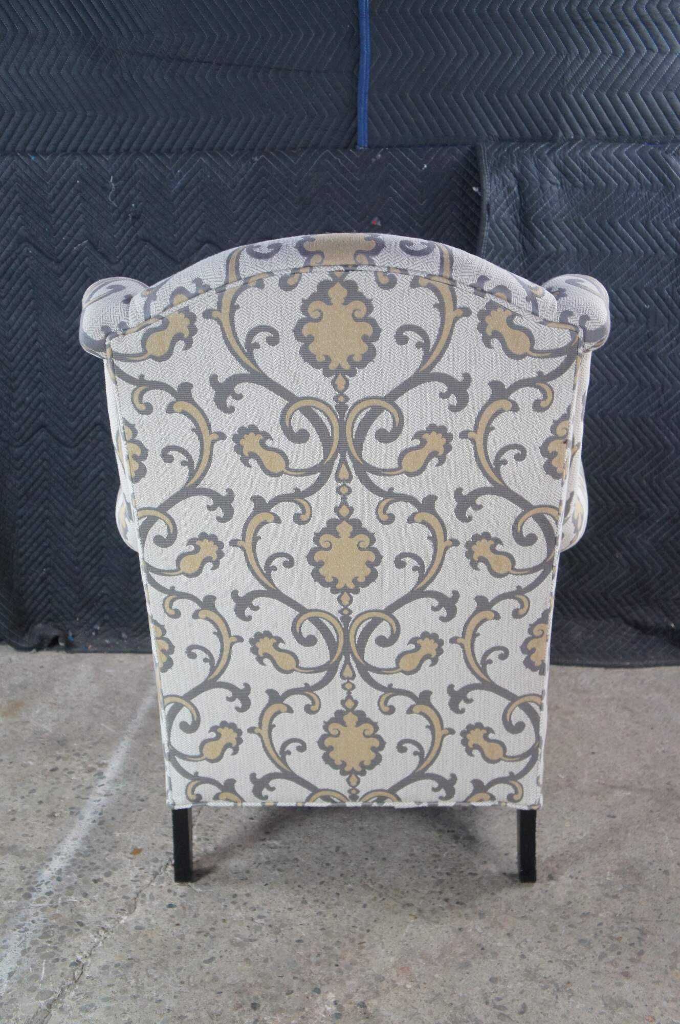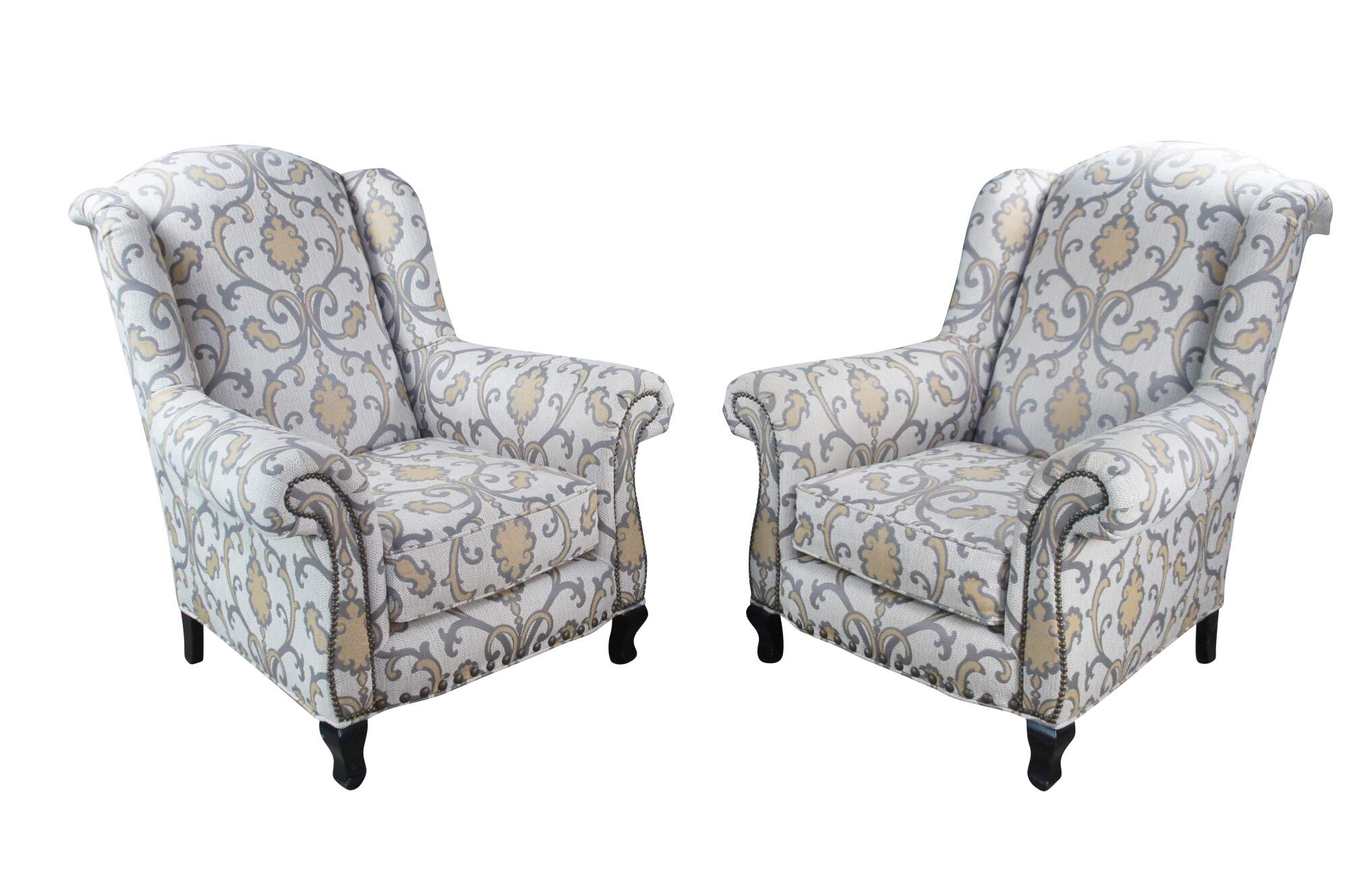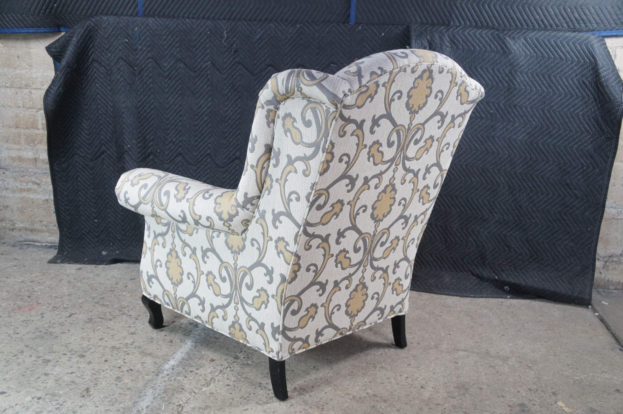 Vintage Arhaus Furniture Cambridge oversized arm chairs. Traditional styling with shallow wings, rolled arms, and a floral acanthus upholstery with nailhead accents