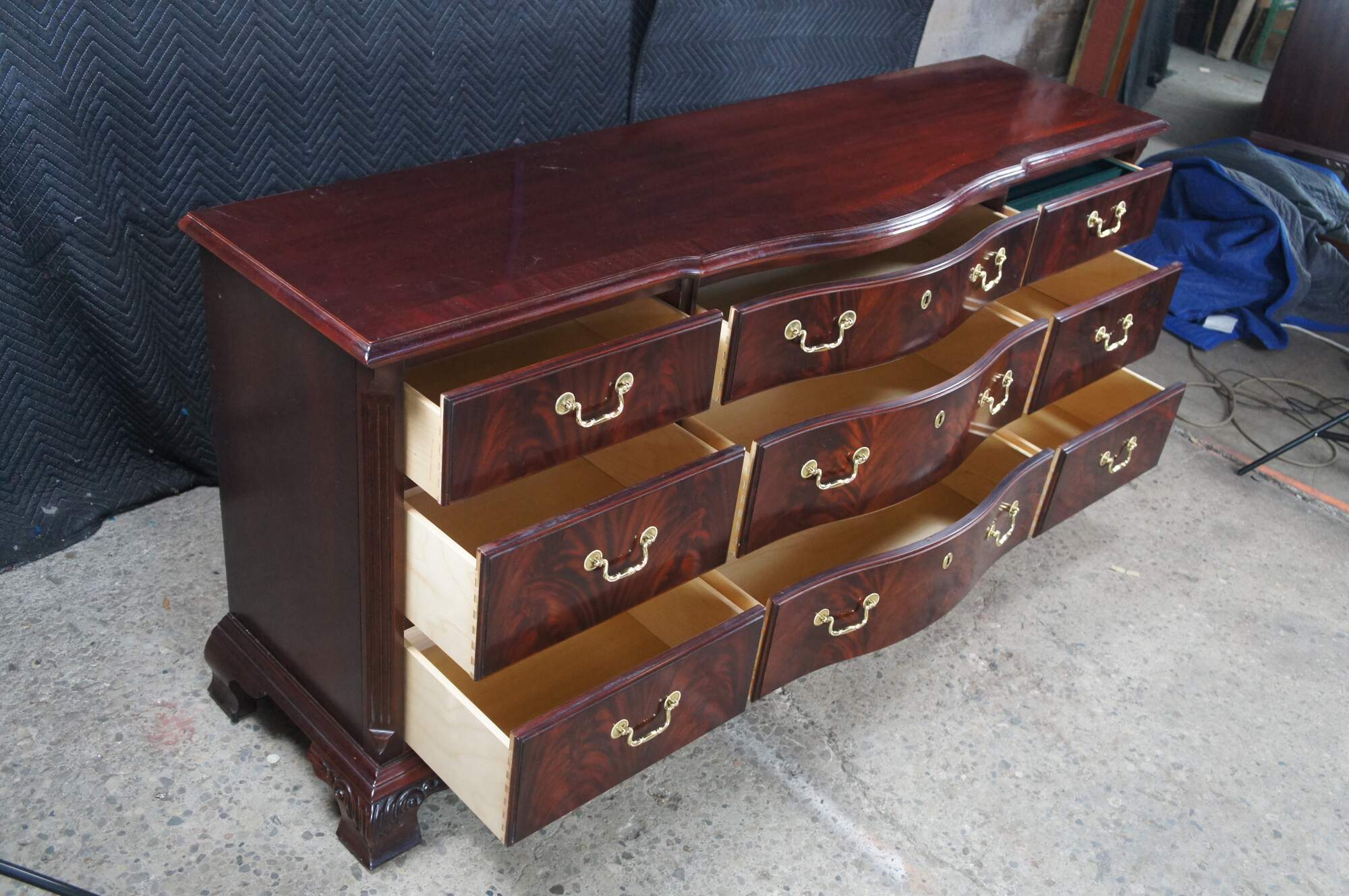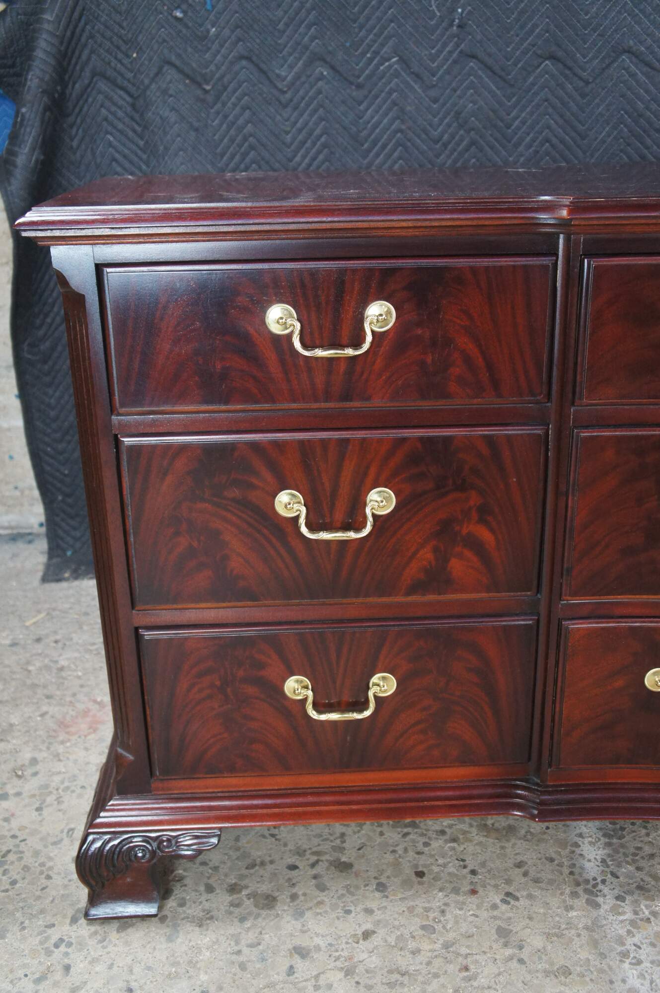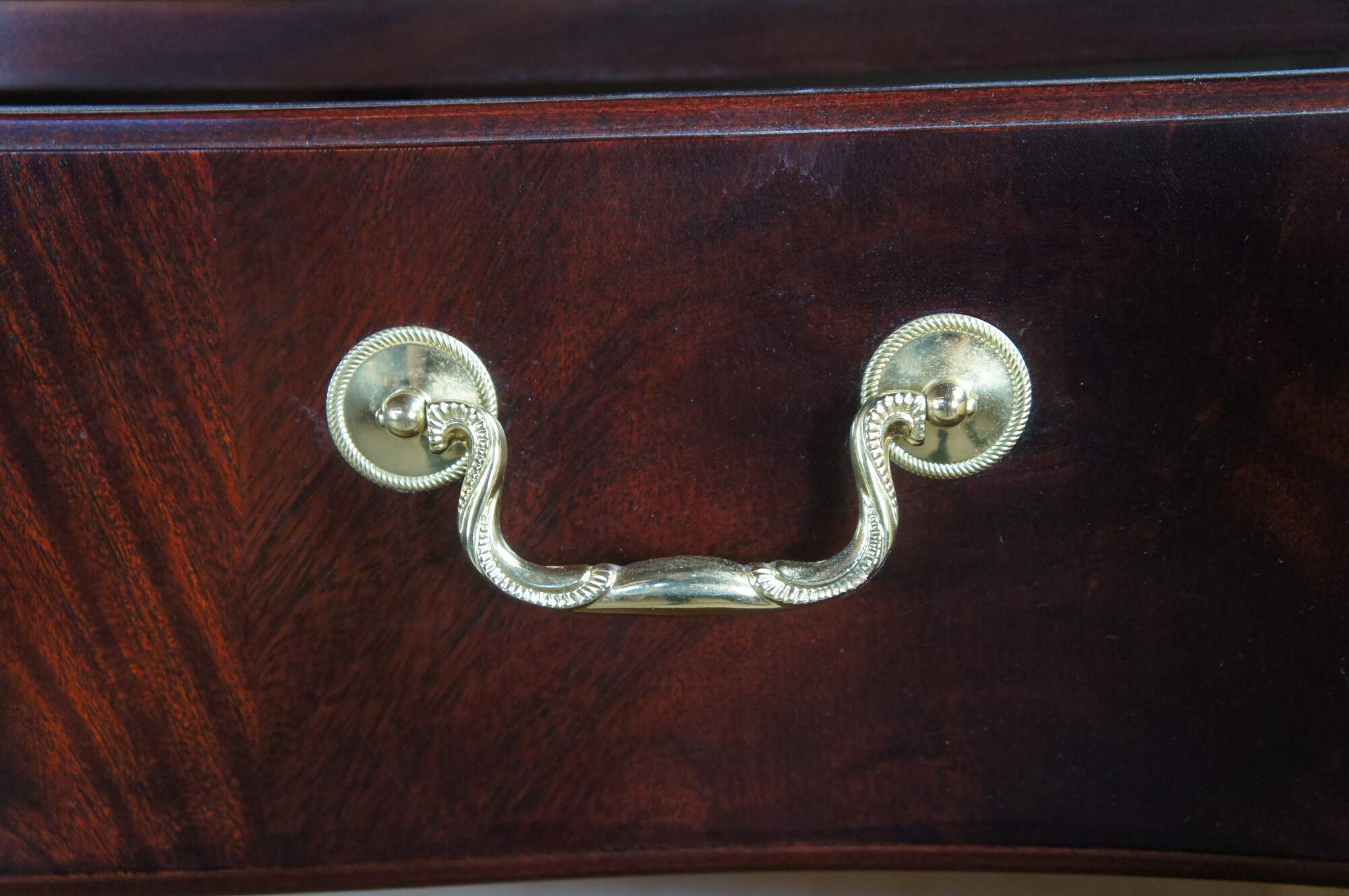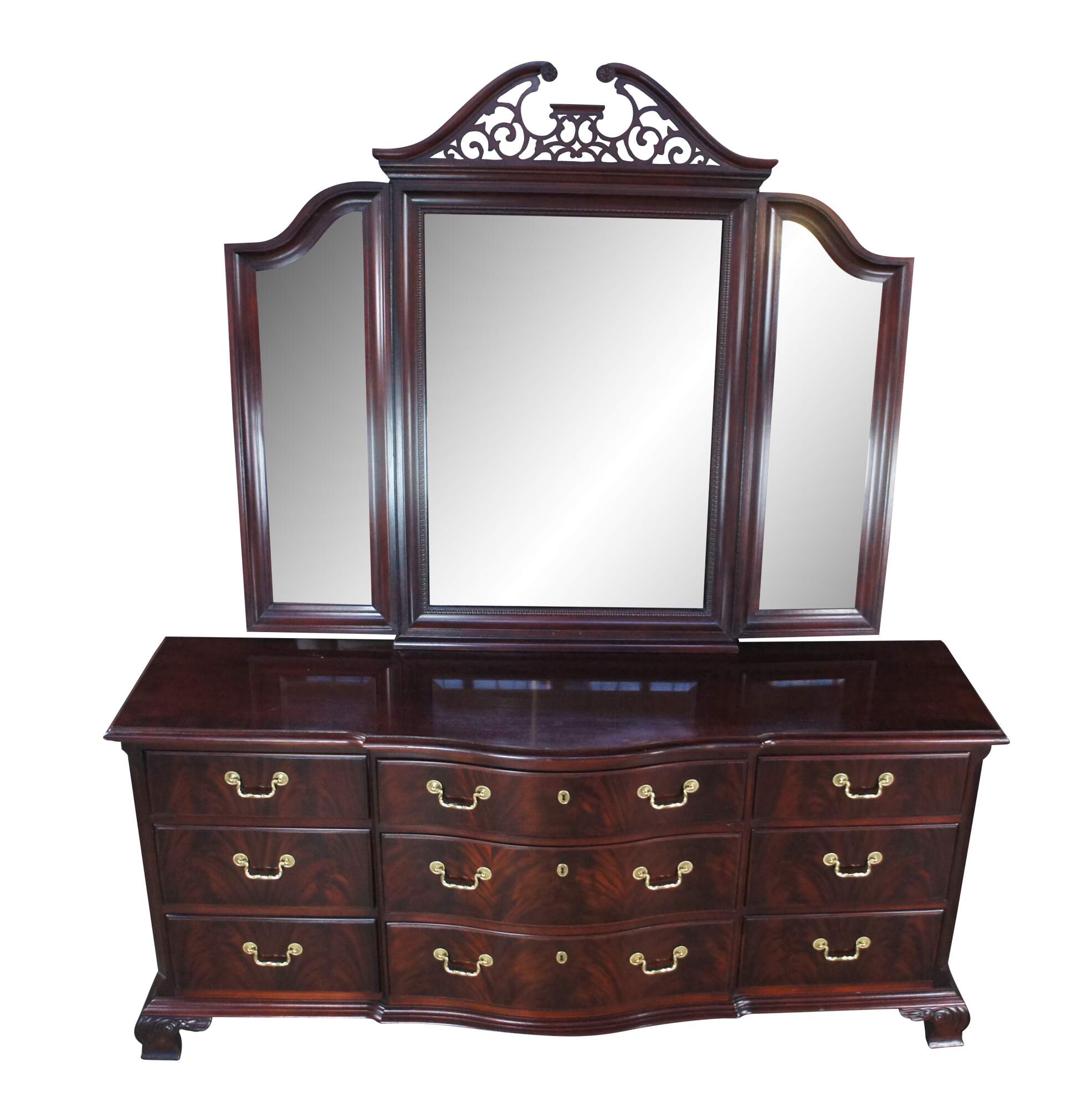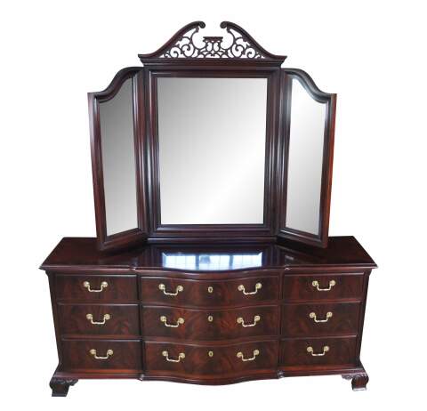 Vintage Thomasville 18th century collection flame mahogany nine drawer bow front dresser with trifold mirror and hidden jewelry storage. The central mirror opens to reveal storage.