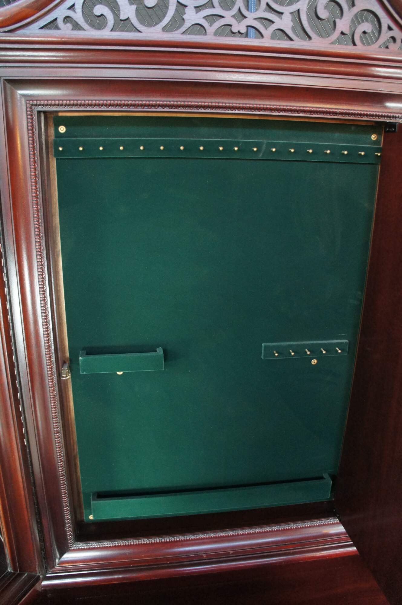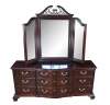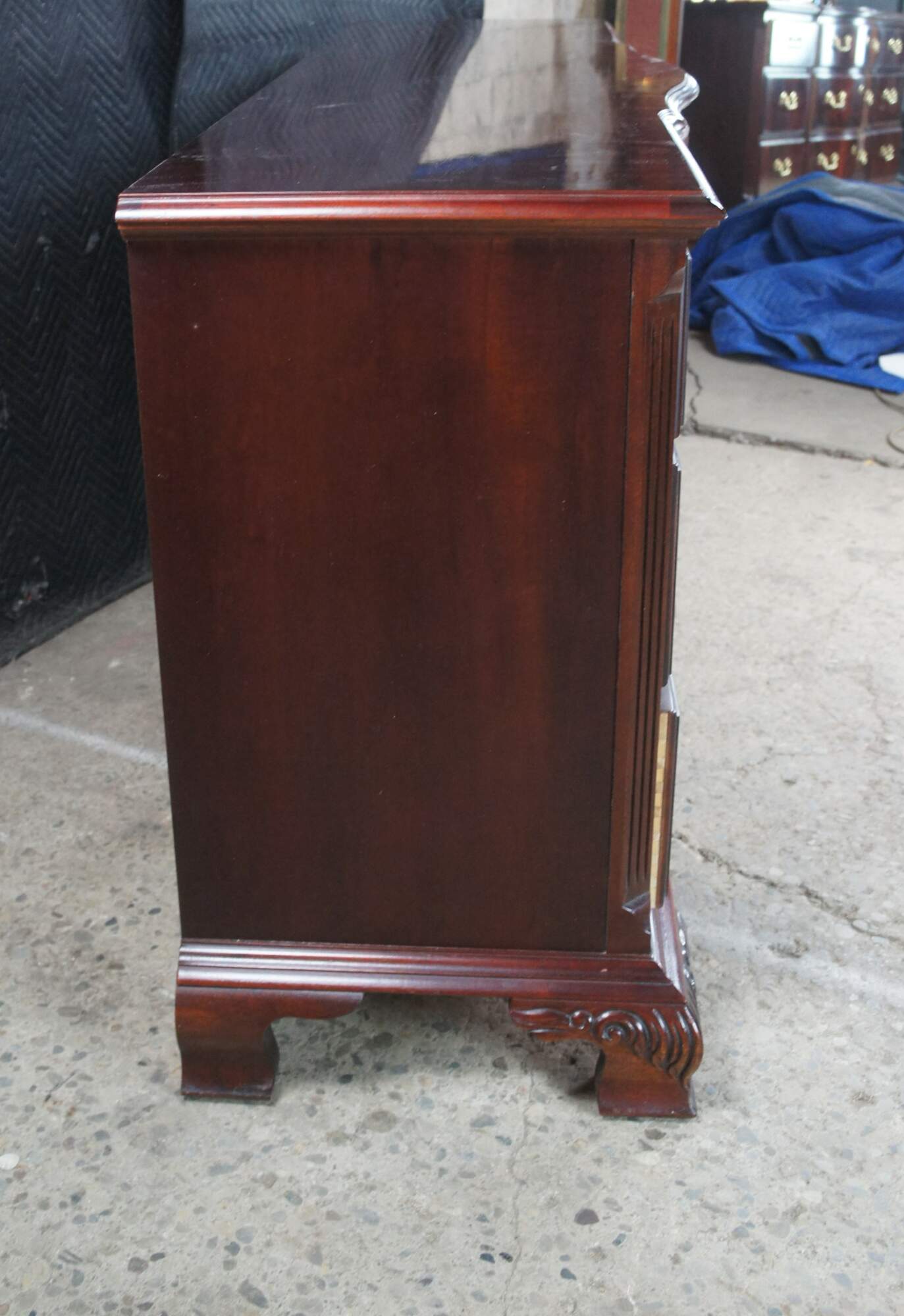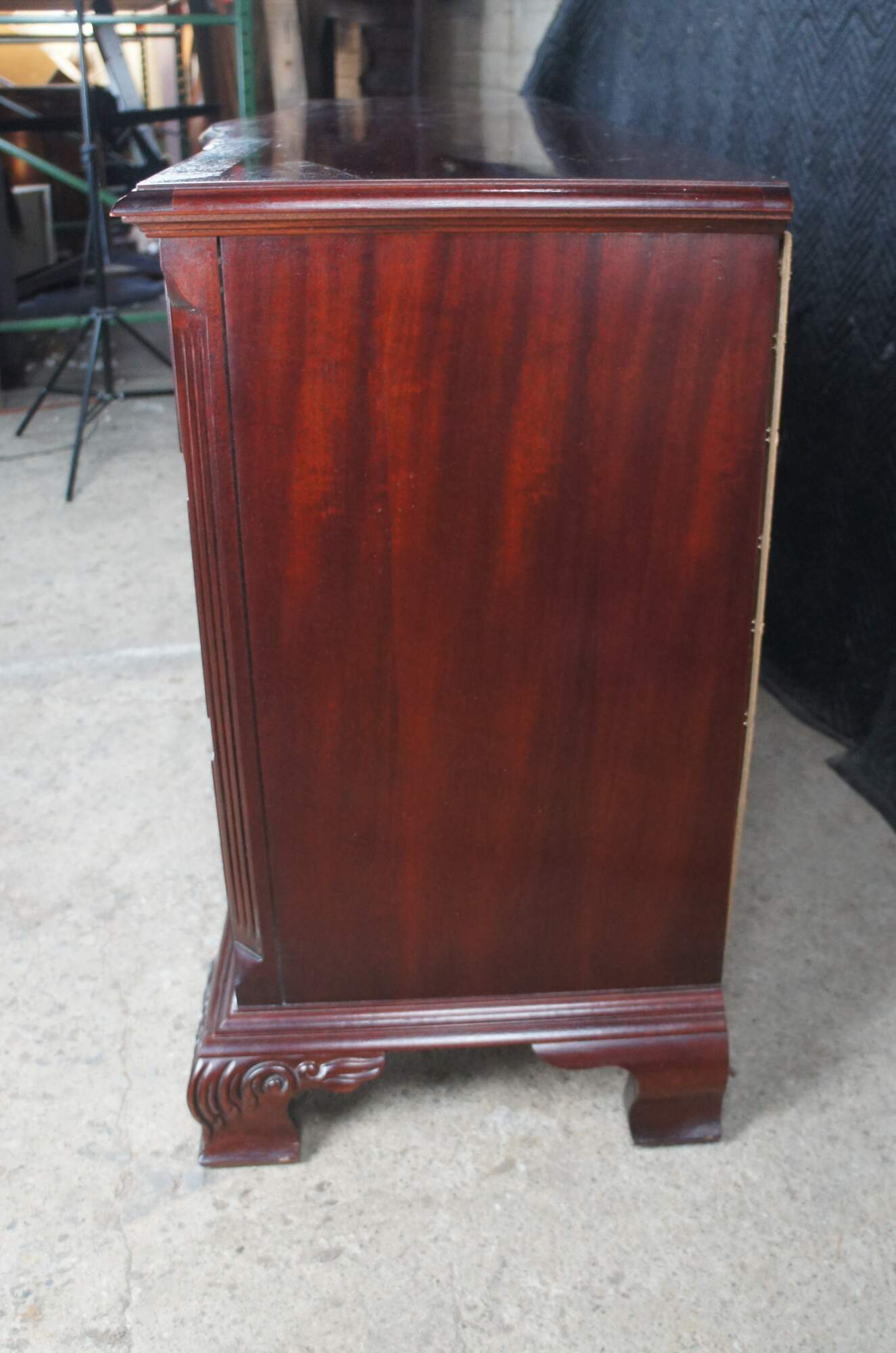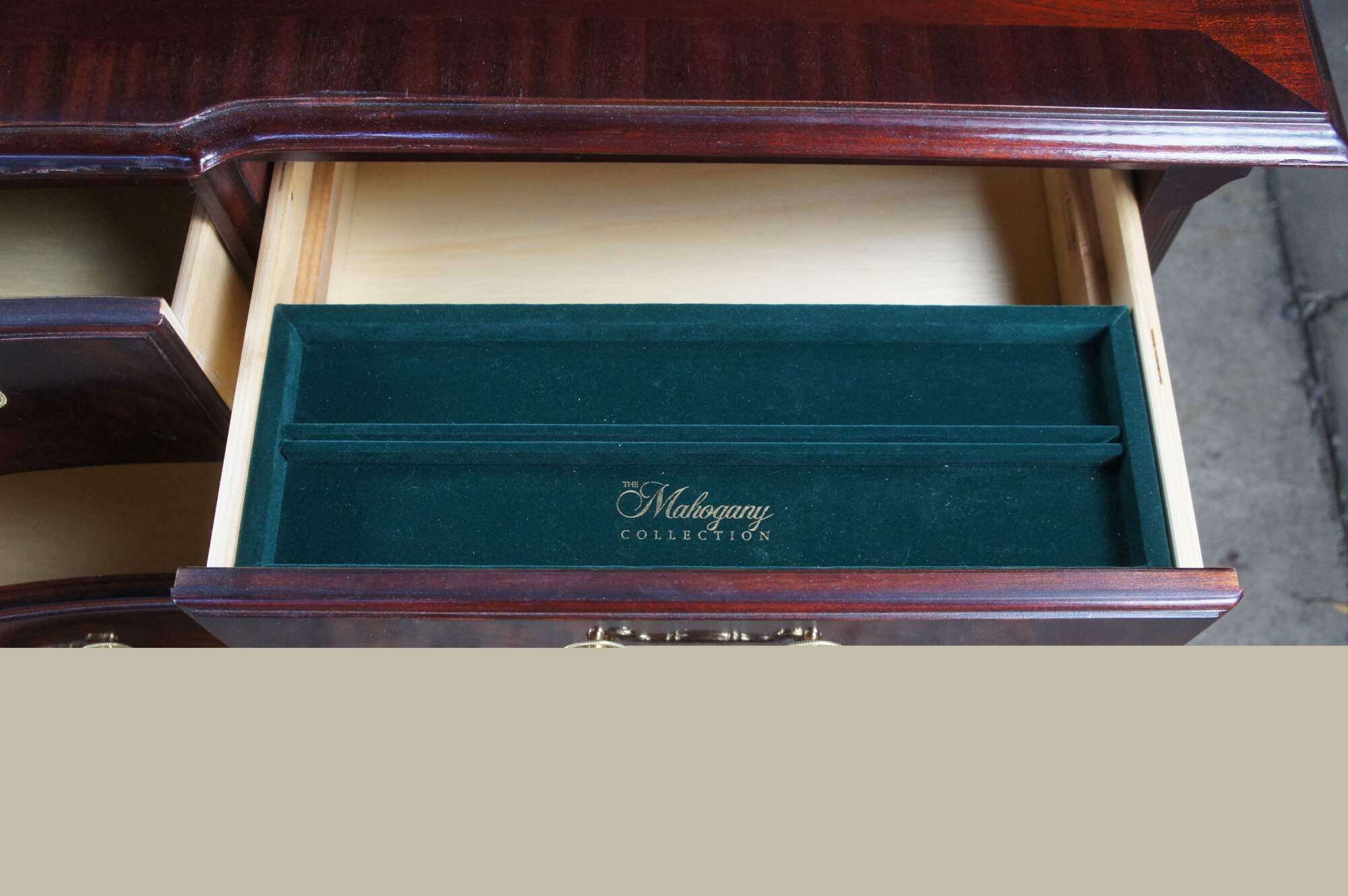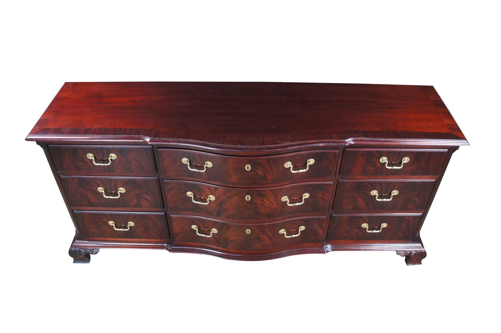 Vintage Thomasville 18th century collection flame mahogany nine drawer bow front dresser with trifold mirror and hidden jewelry storage. The central mirror opens to reveal storage.