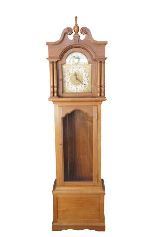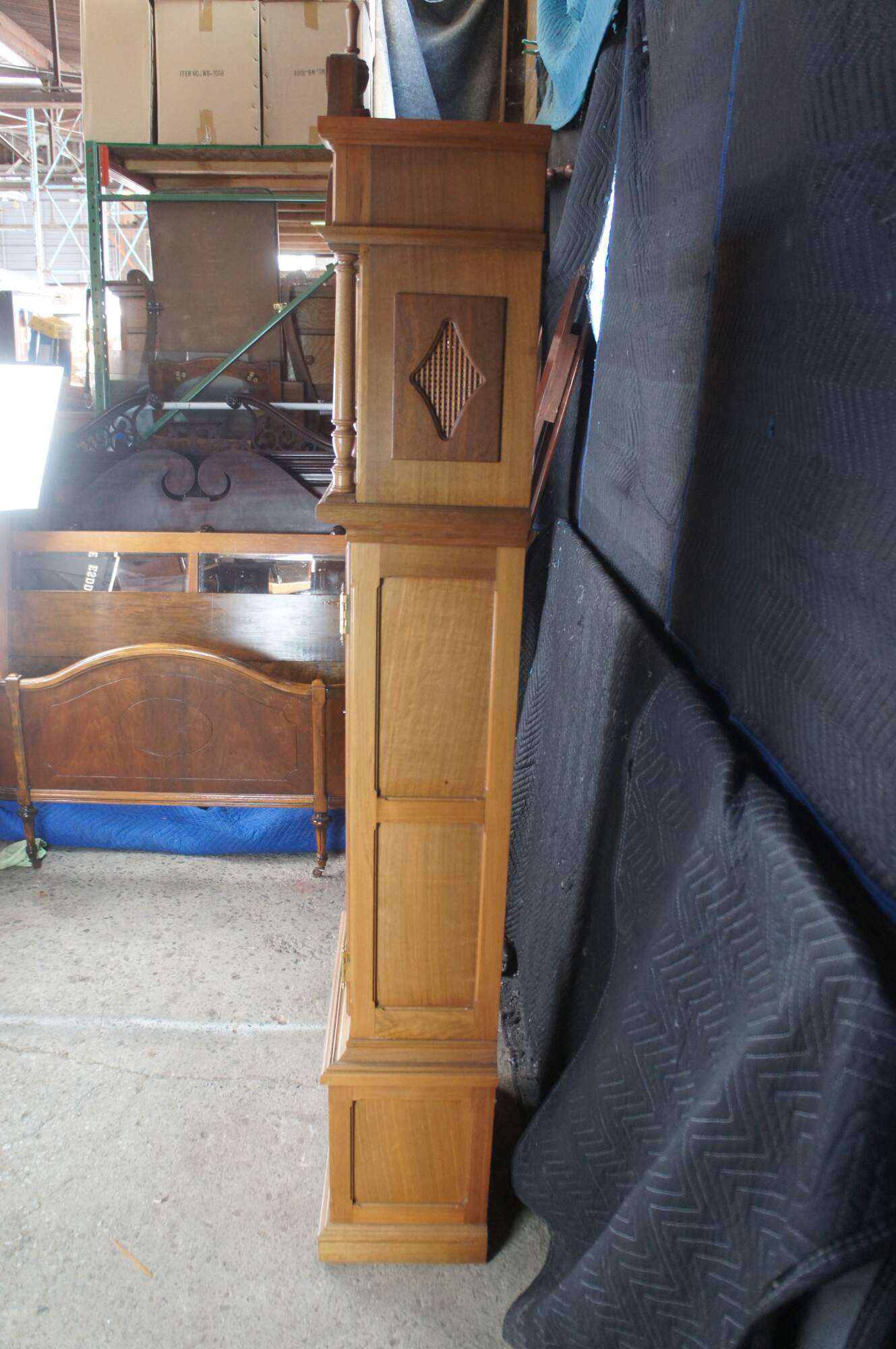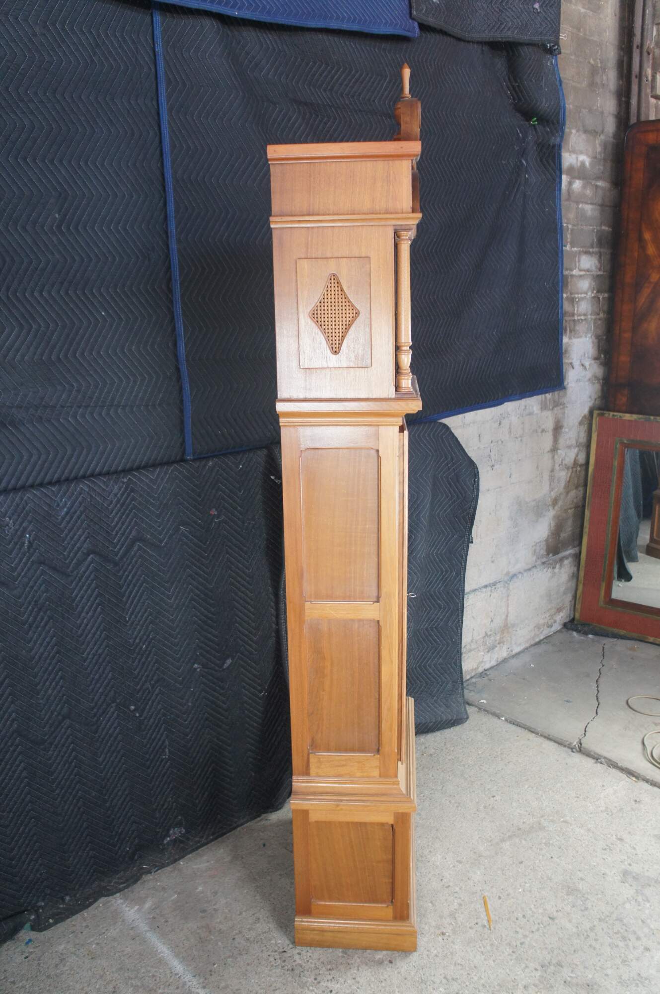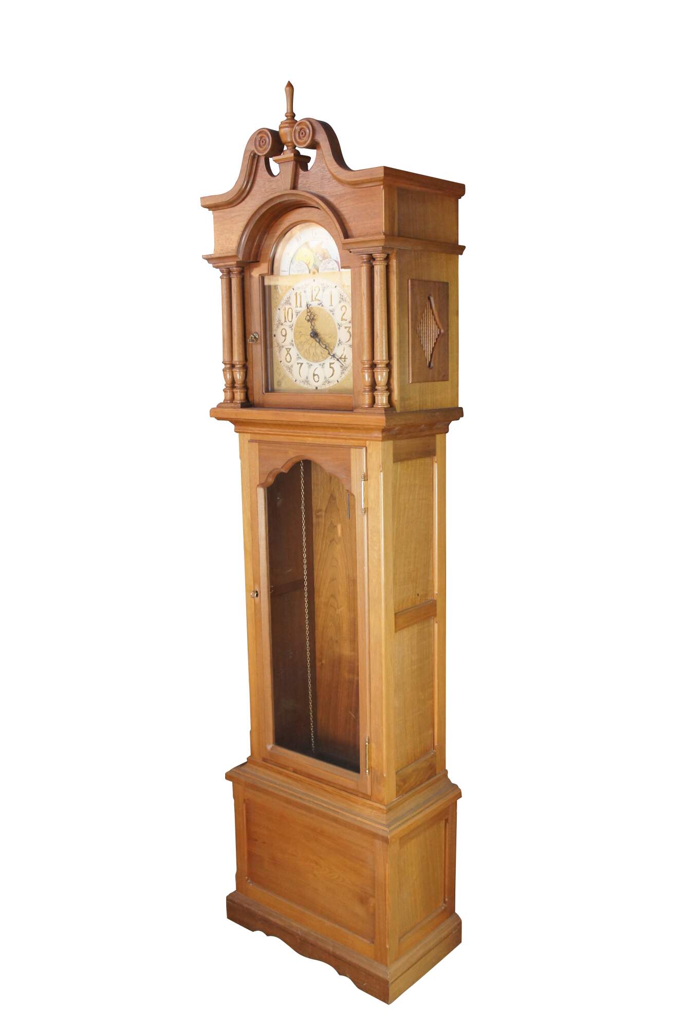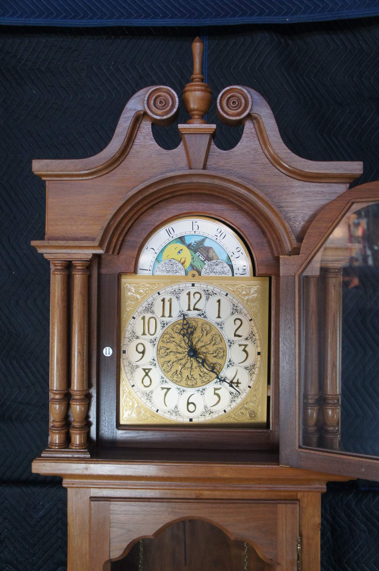 Vintage Colonial / Chippendale style oak tall case grandfather clock featuring German movement with a sun / moon phase rotating landscape dial and open pediment top with flanking scrolls and trophy finial.