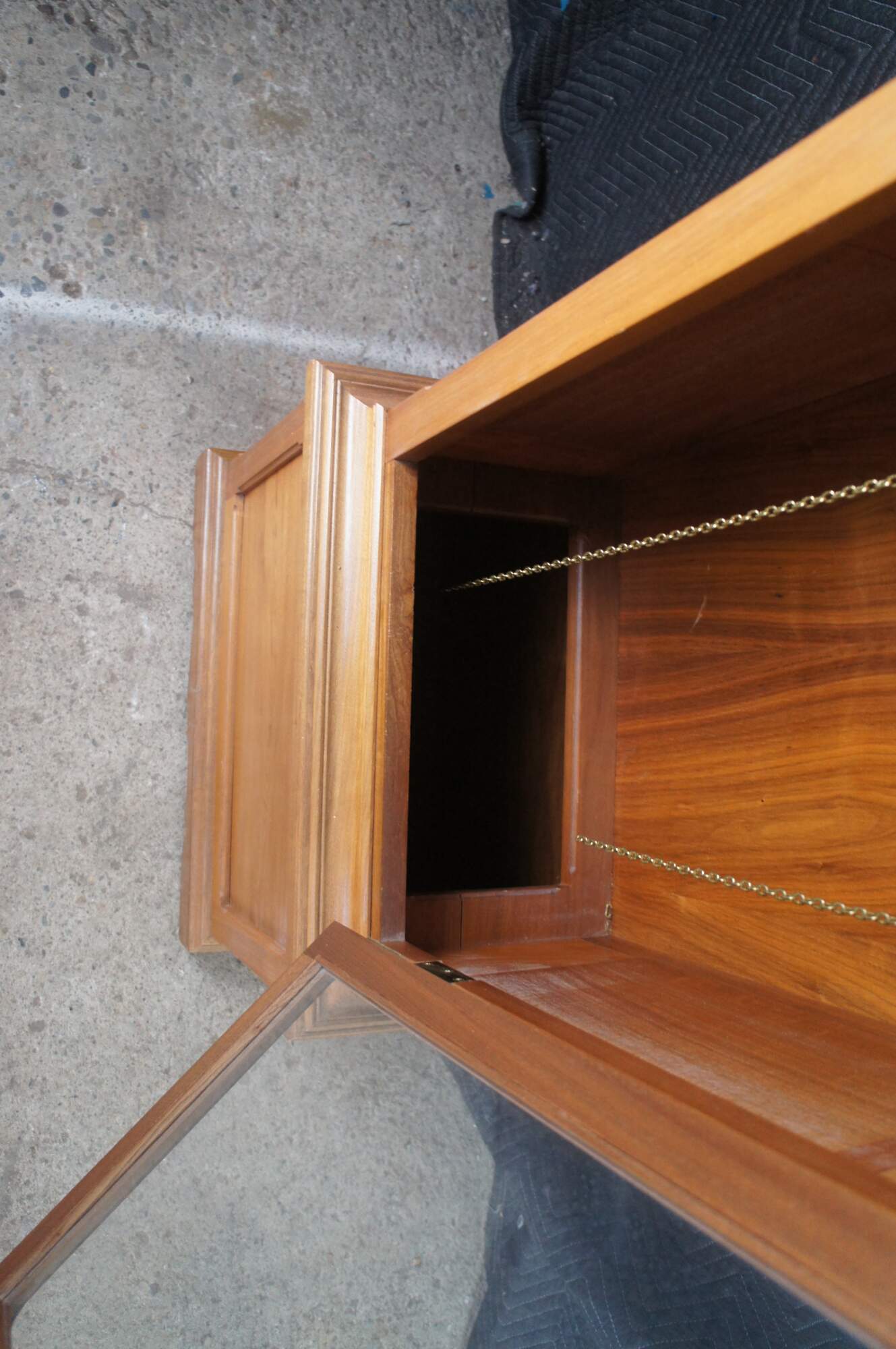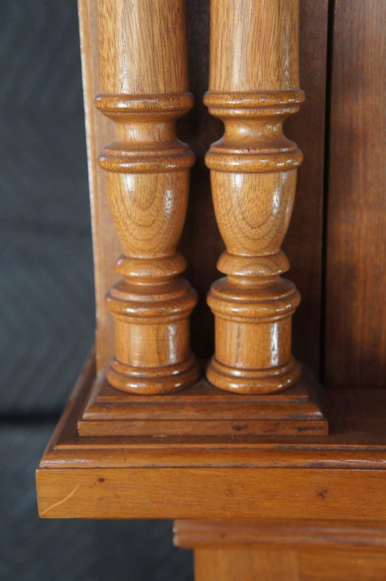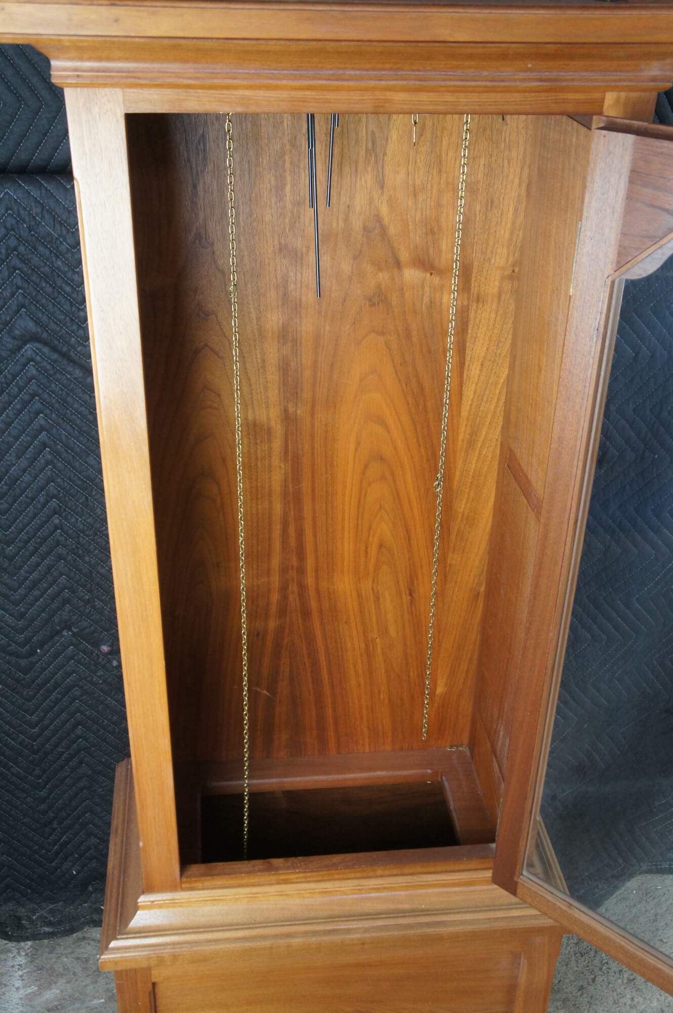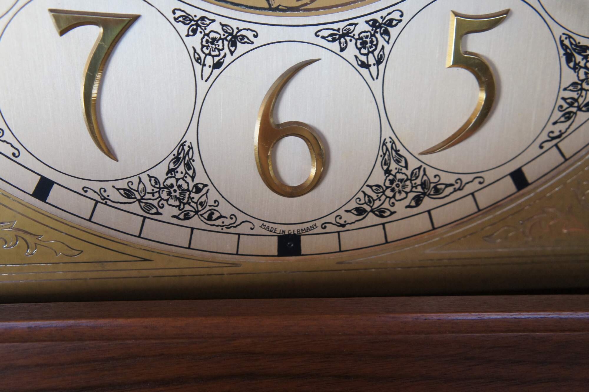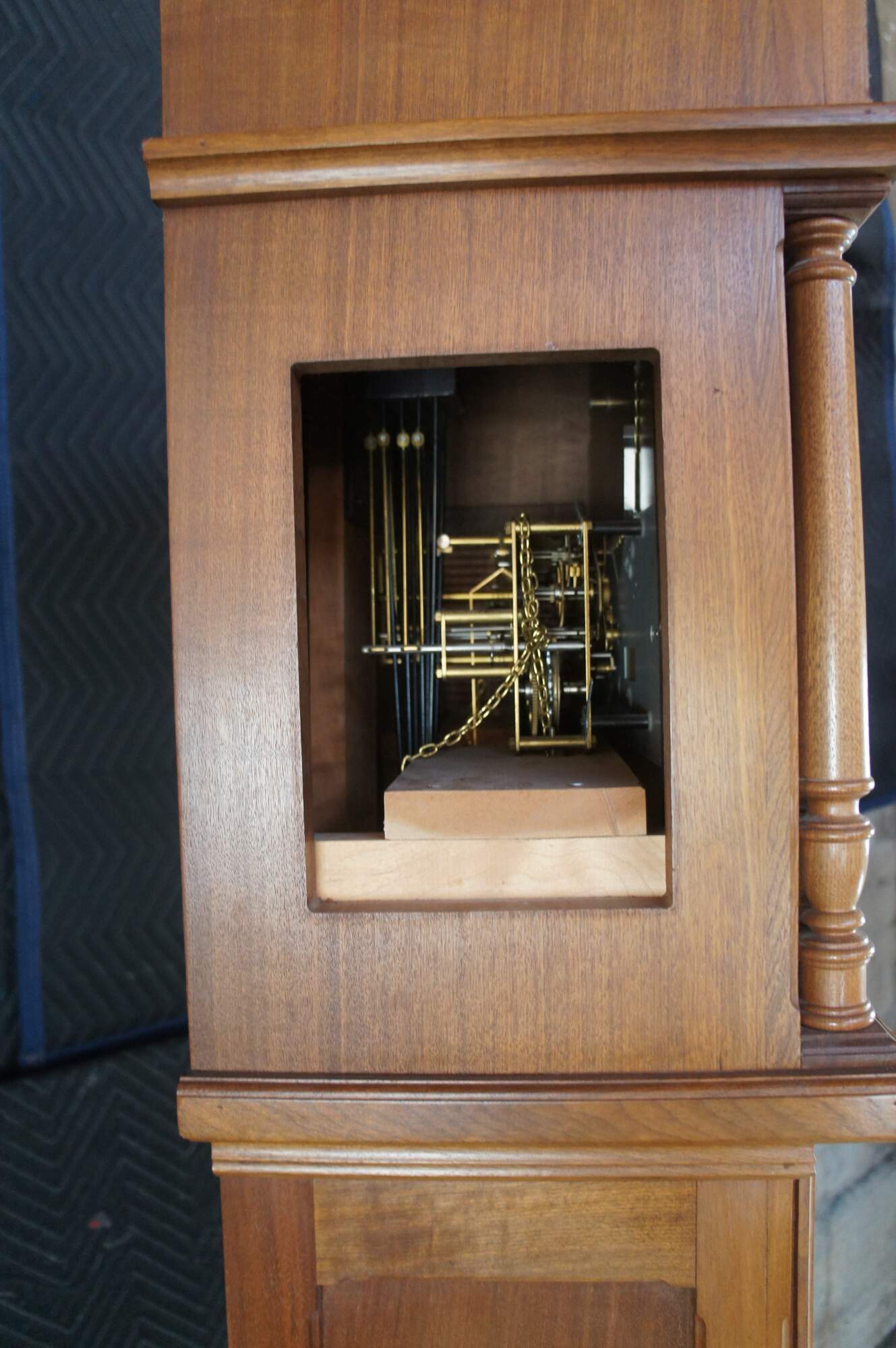 Vintage Colonial / Chippendale style oak tall case grandfather clock featuring German movement with a sun / moon phase rotating landscape dial and open pediment top with flanking scrolls and trophy finial.