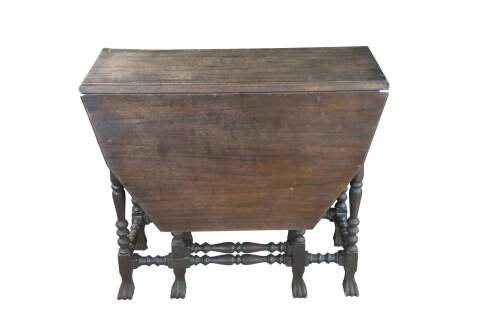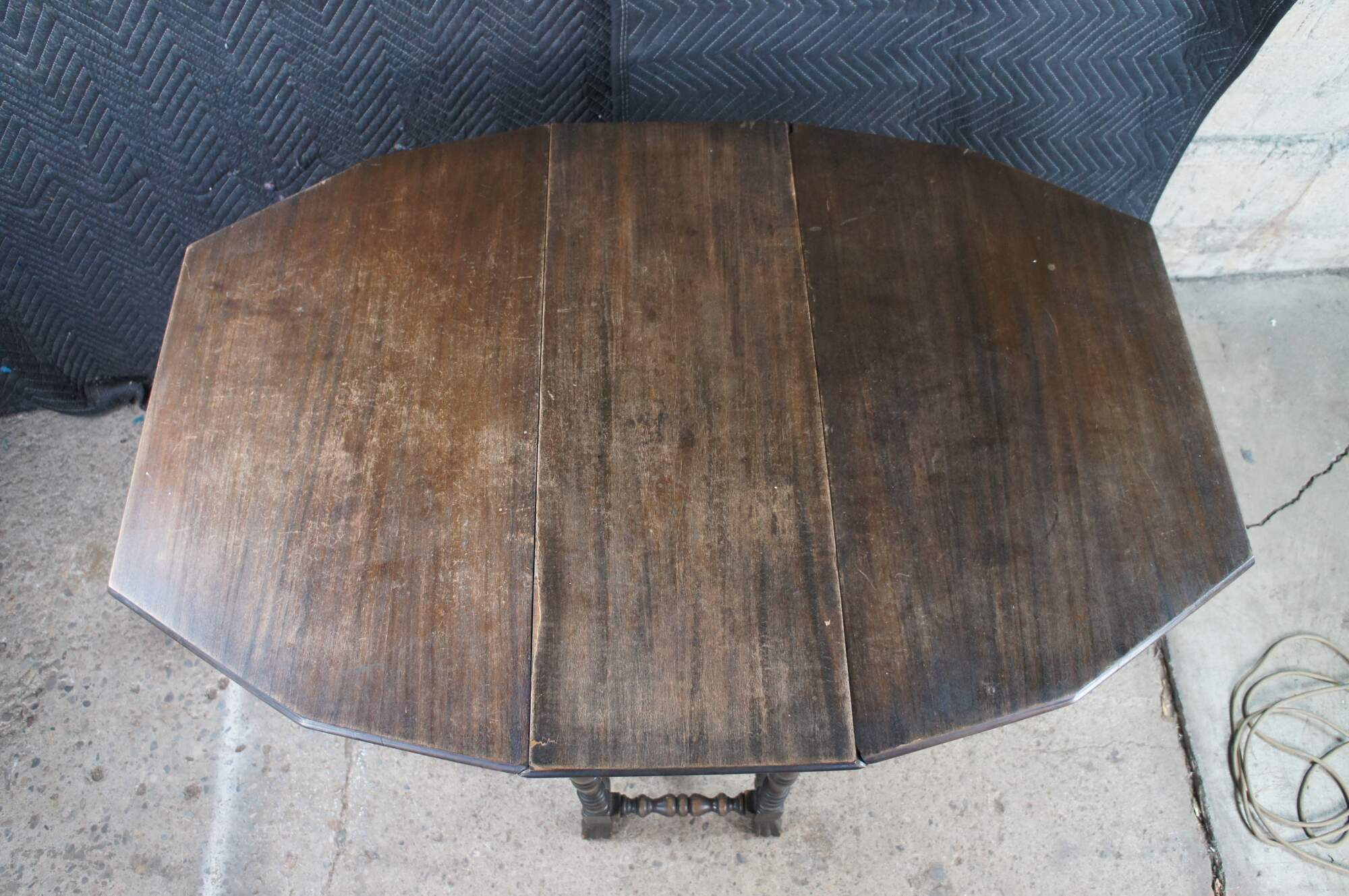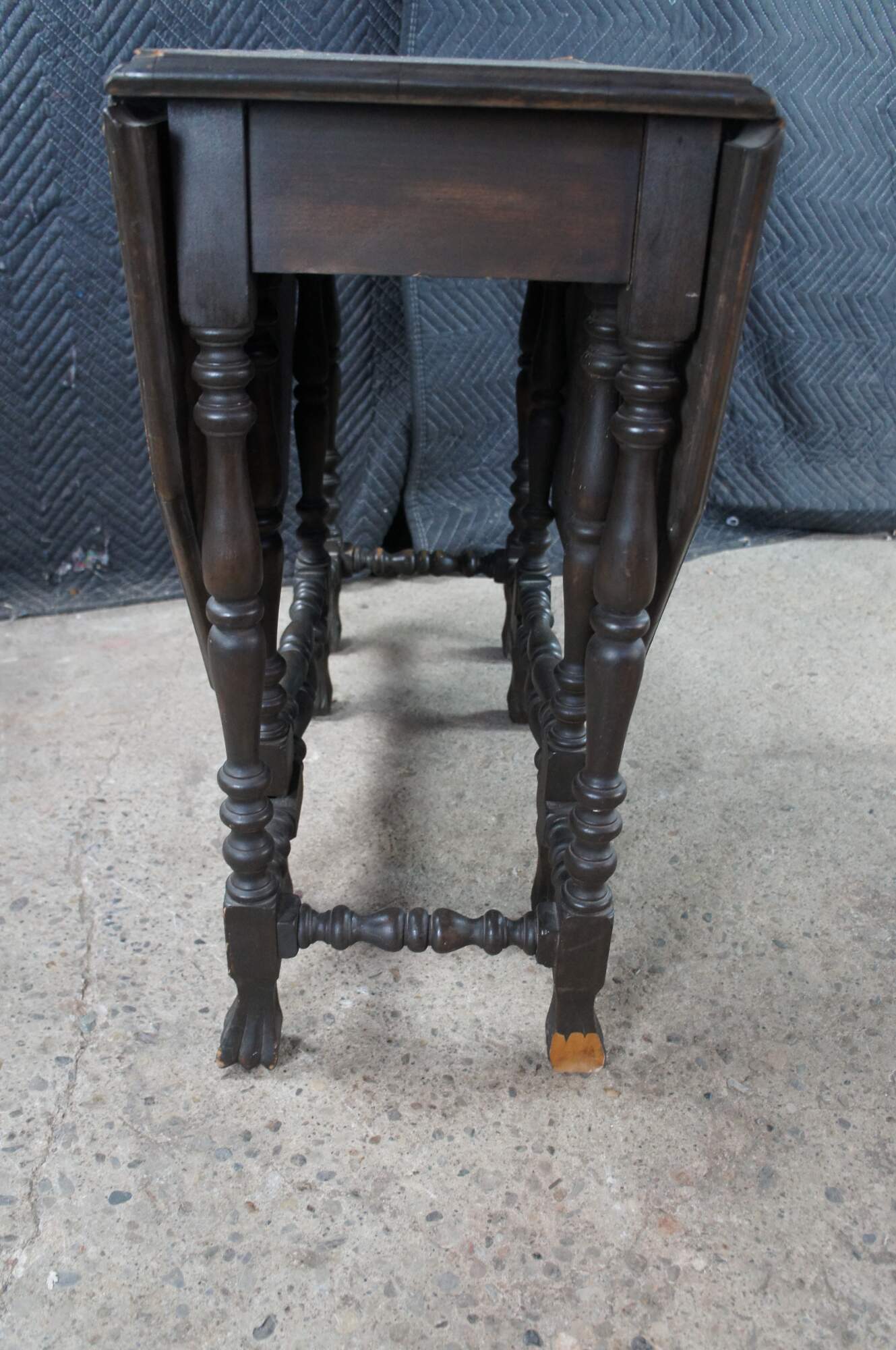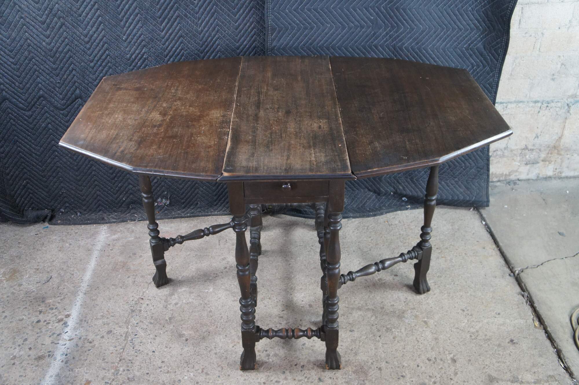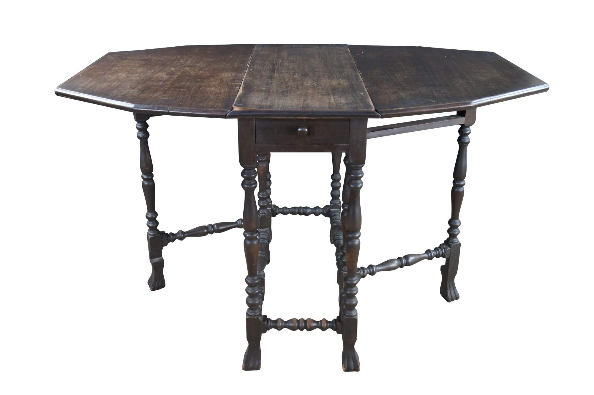 Antique William and Mary style dropleaf gateleg console / hall / game or dining table. Made of walnut featuring a multi sided top, one long drawer, turned legs and posts, and a spanish paw feet.