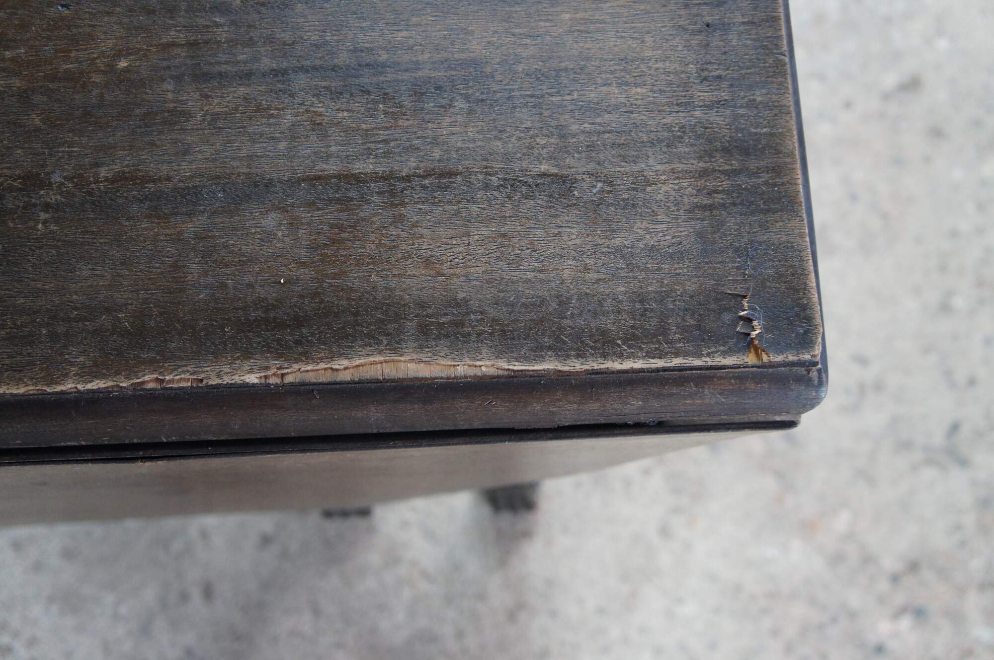 Poor condition, structurally solid, heavy wear and distressing, fading, finish loss, veneer splitting and lifting, missing part of foot, edge wear / chipping, water damage, spots, marking.