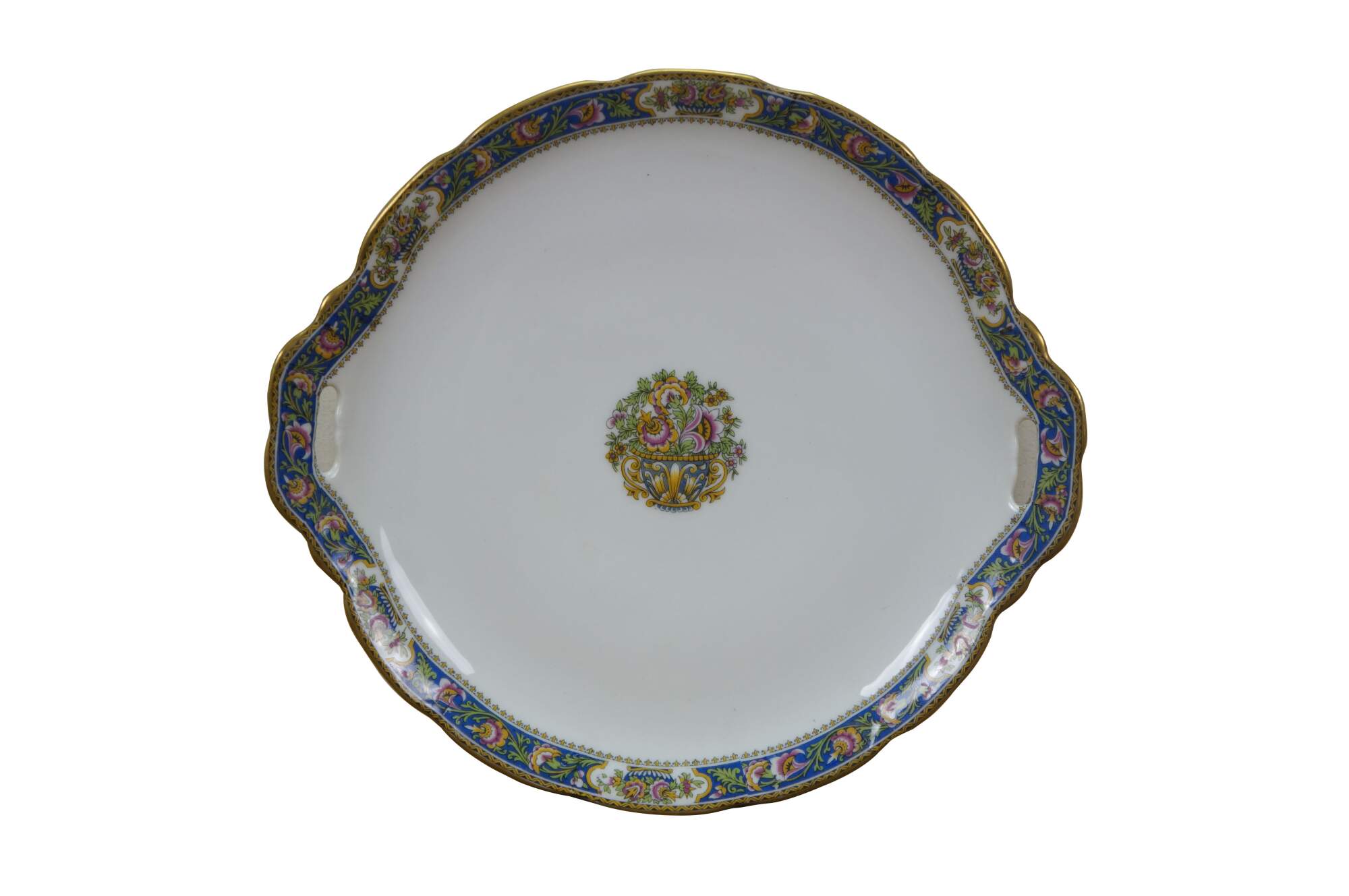 11 pieces of early 20th century Art Deco French Limoges porcelain plates by T.L.B. (Touze, Lemaître Frères & Blancher). White porcelain with gold gilt details and folk art style floral pattern in blue, pink, and yellow. Includes: 1 Serving Plate, 5 Bread Plates, 5 Saucers.