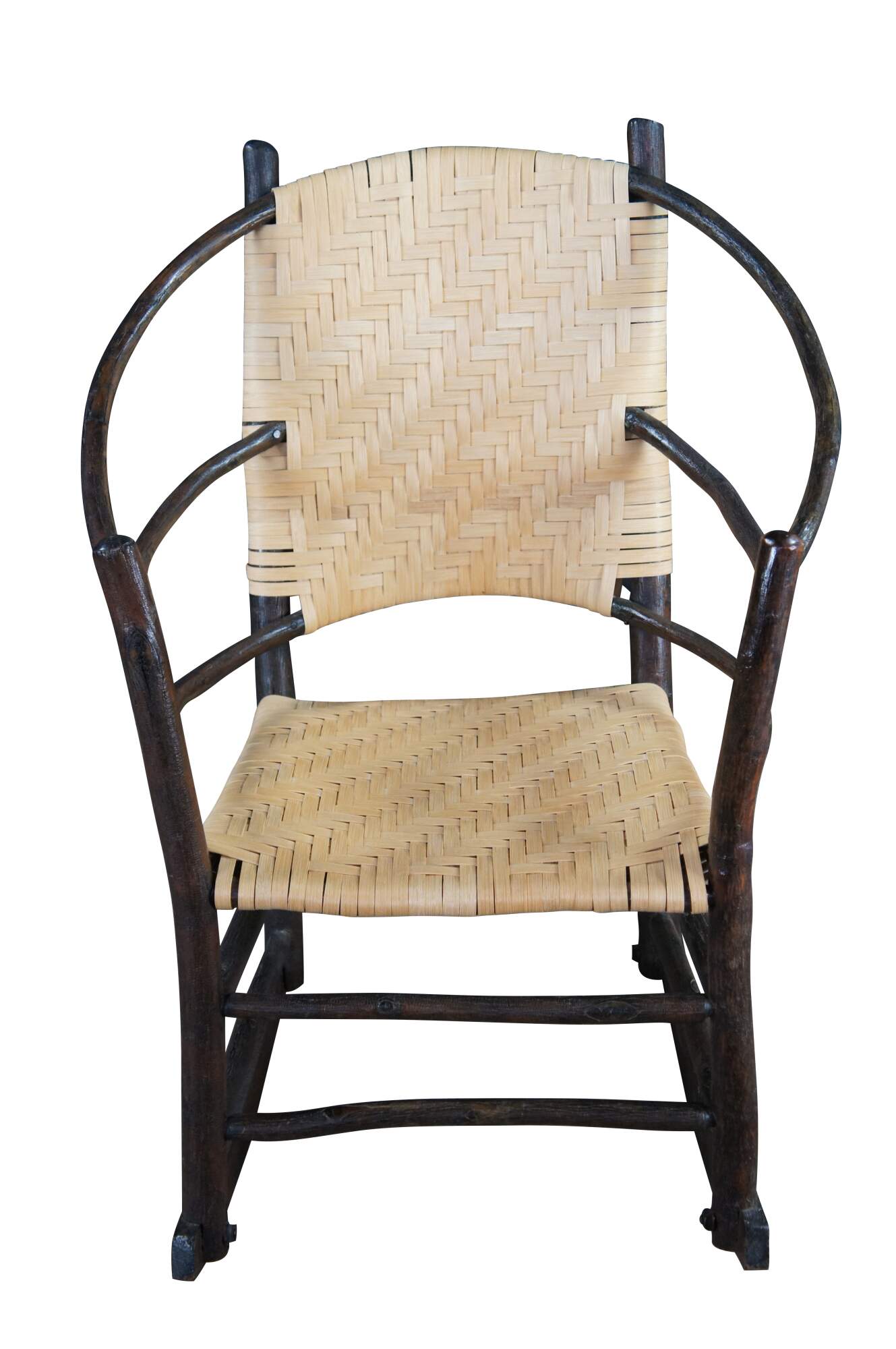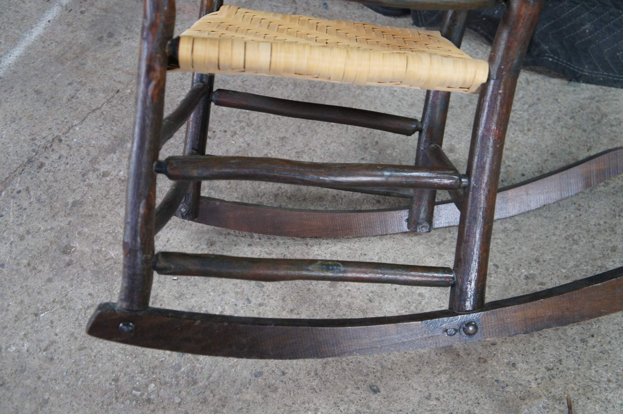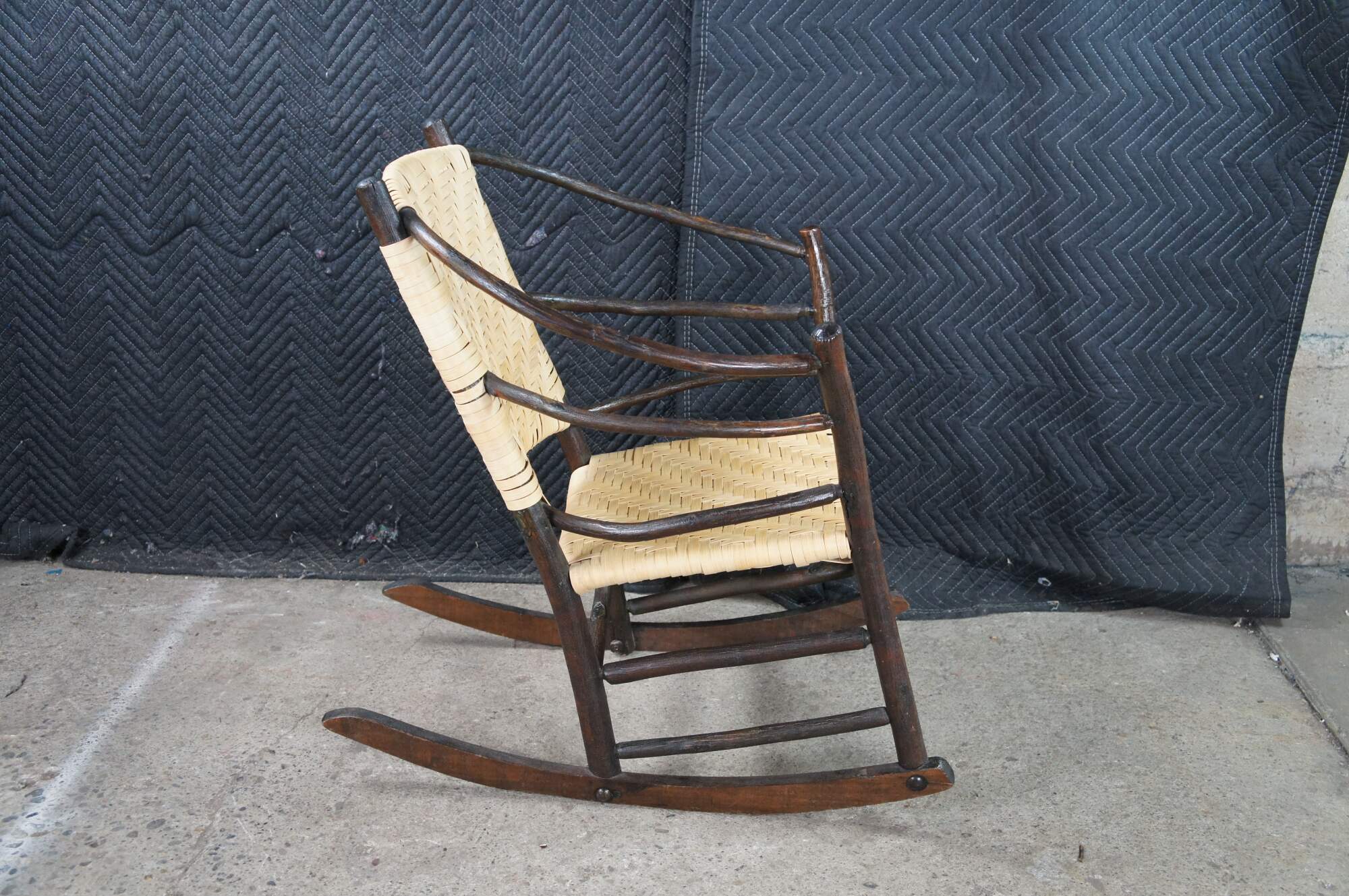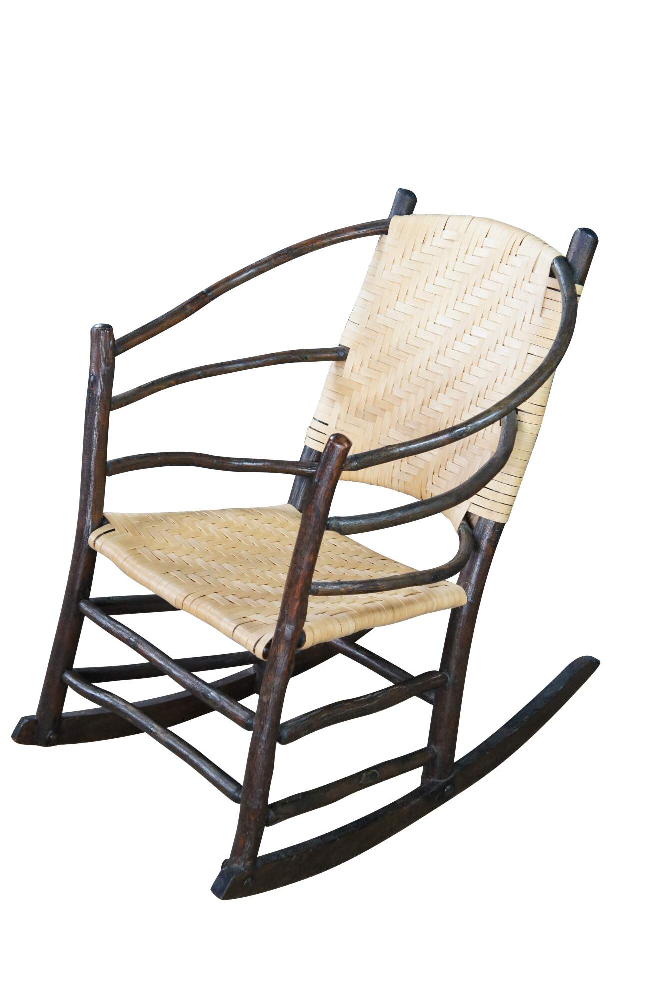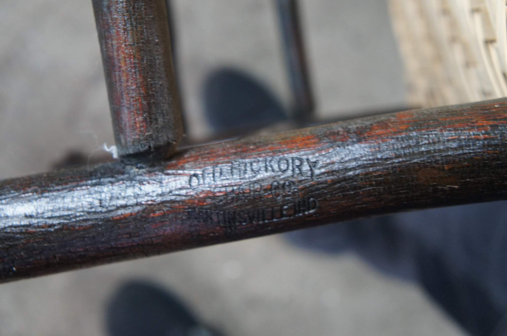 Antique signed Old Hickory Chair Co. Andrew Jackson rocking chair / rocker. Classic rustic design made from bentwood hickory saplings / tree branches, known for its distinctive hoop back and strong, natural look. Named for President Andrew Jackson (nicknamed "Old Hickory") and a signature piece of the Old Hickory Furniture Company, handcrafted with woven rush seats and backs.