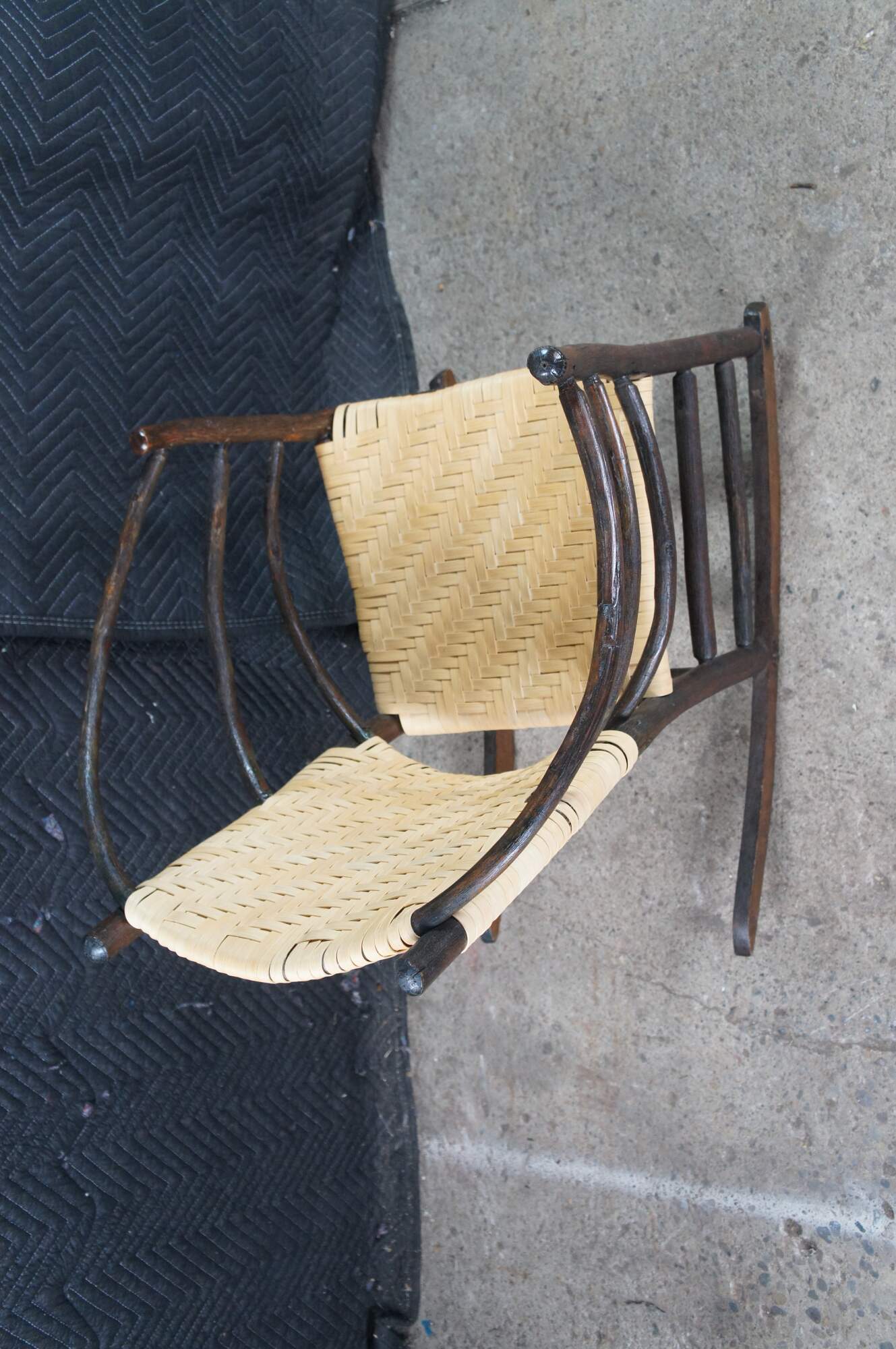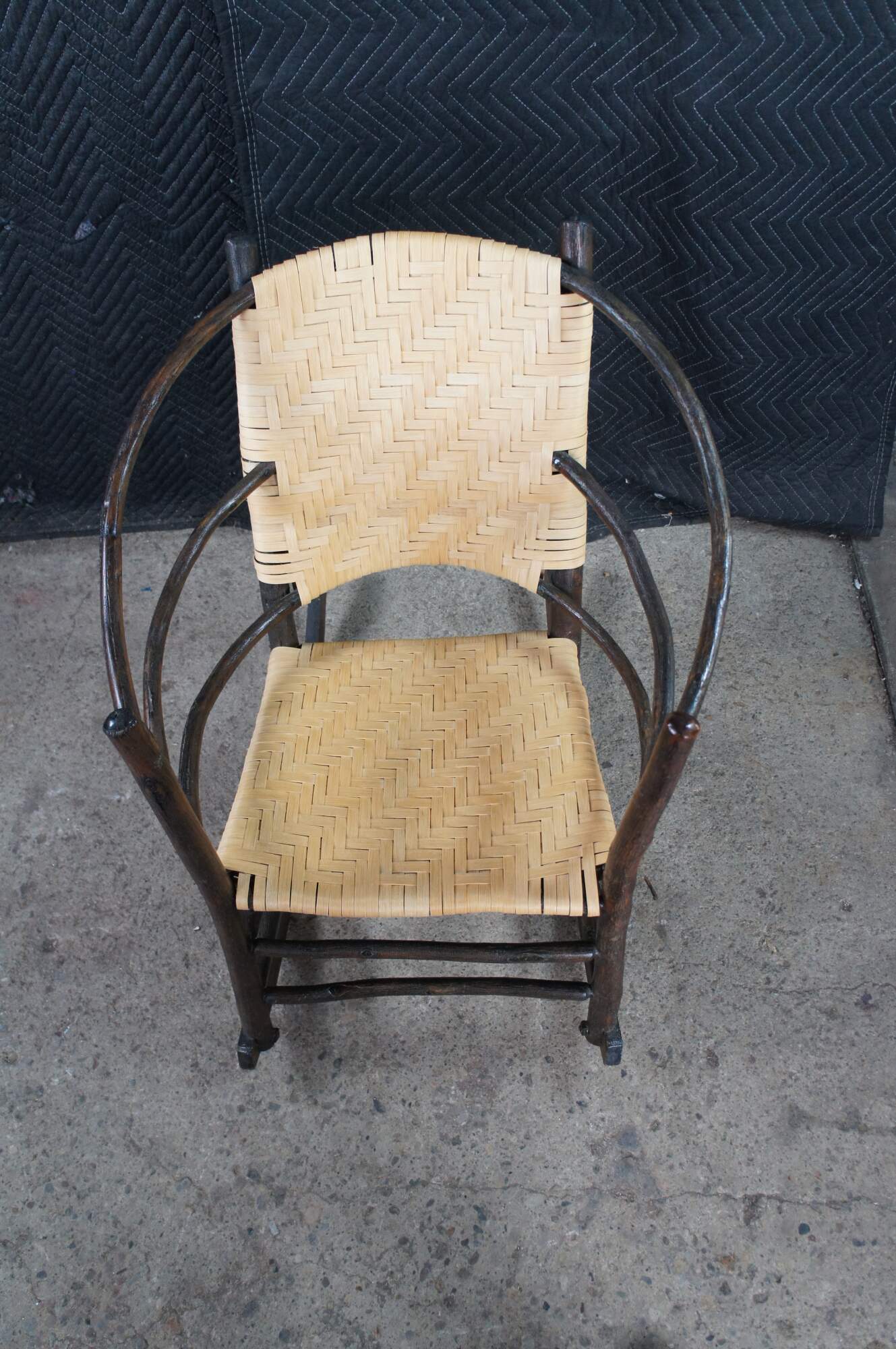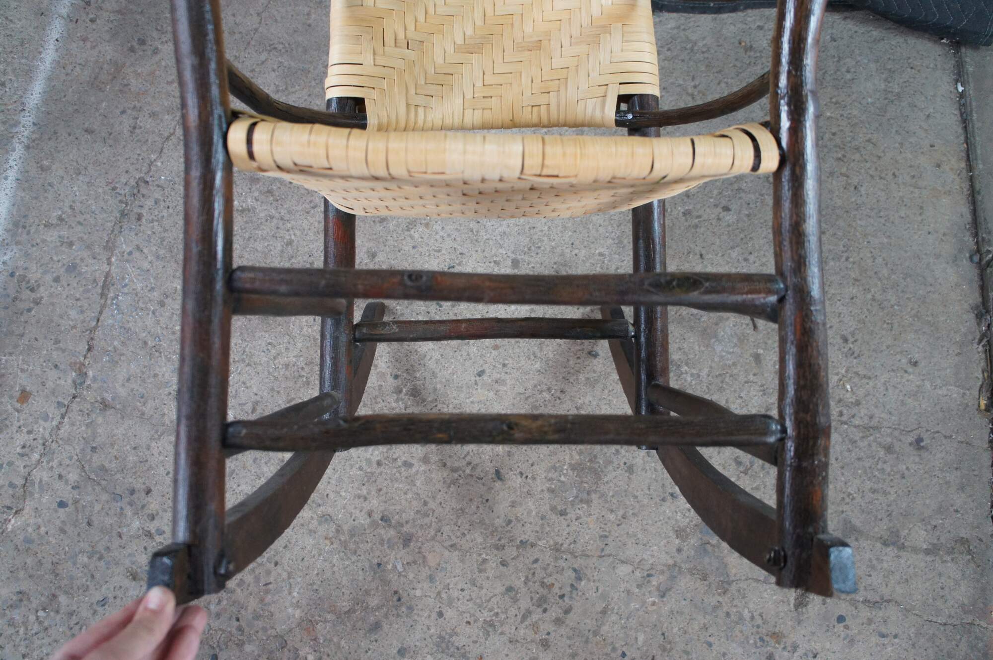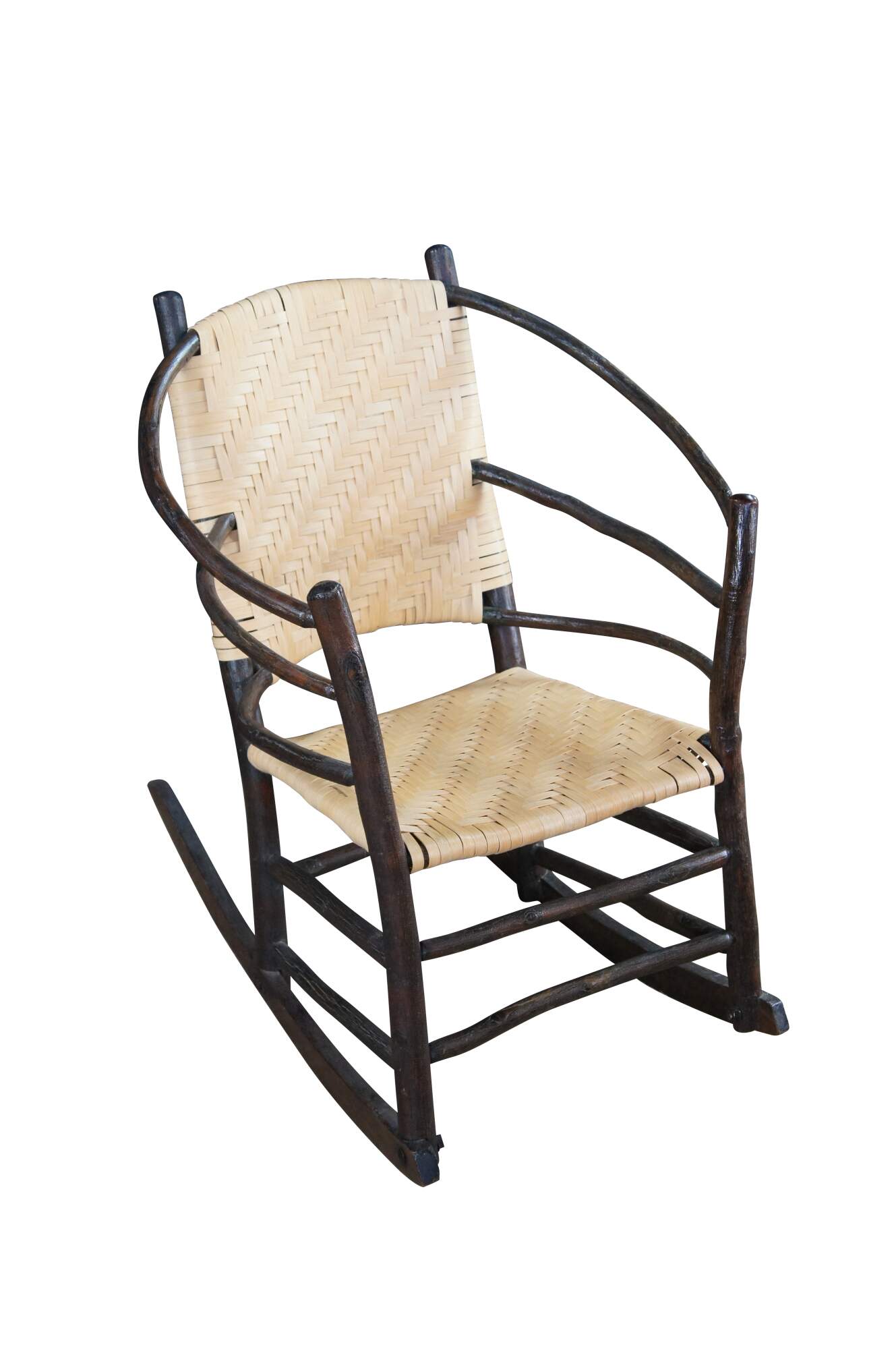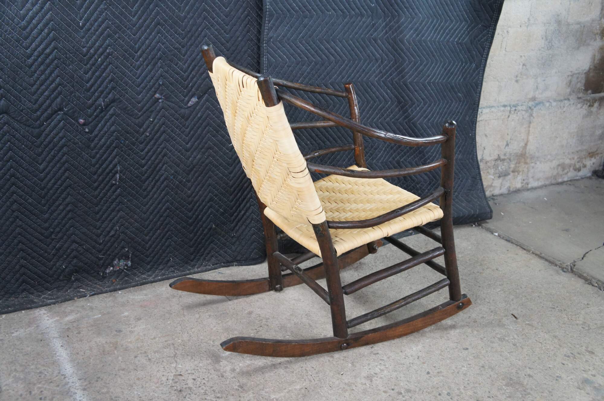 Antique signed Old Hickory Chair Co. Andrew Jackson rocking chair / rocker. Classic rustic design made from bentwood hickory saplings / tree branches, known for its distinctive hoop back and strong, natural look. Named for President Andrew Jackson (nicknamed "Old Hickory") and a signature piece of the Old Hickory Furniture Company, handcrafted with woven rush seats and backs.
