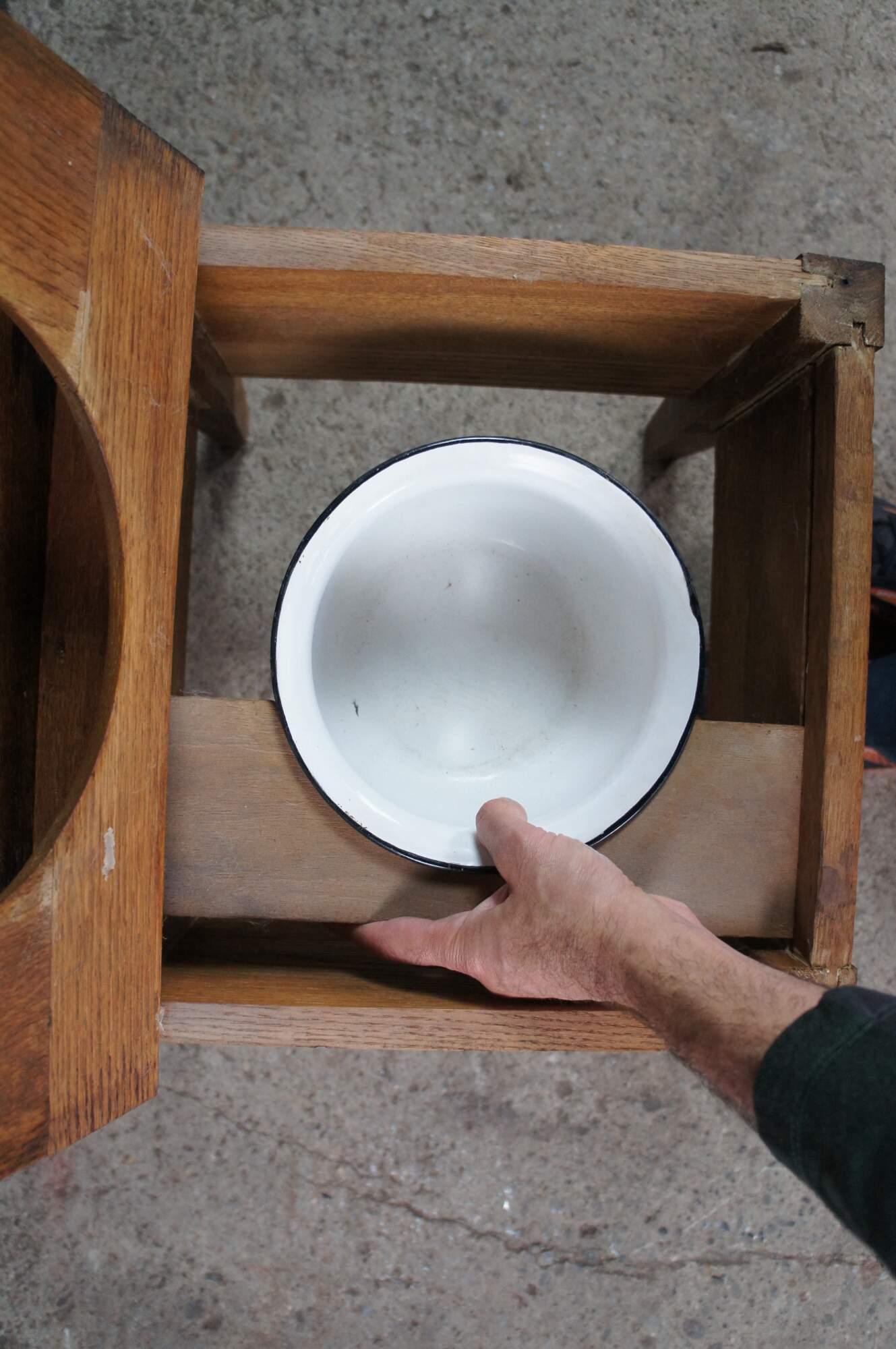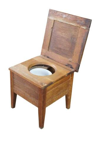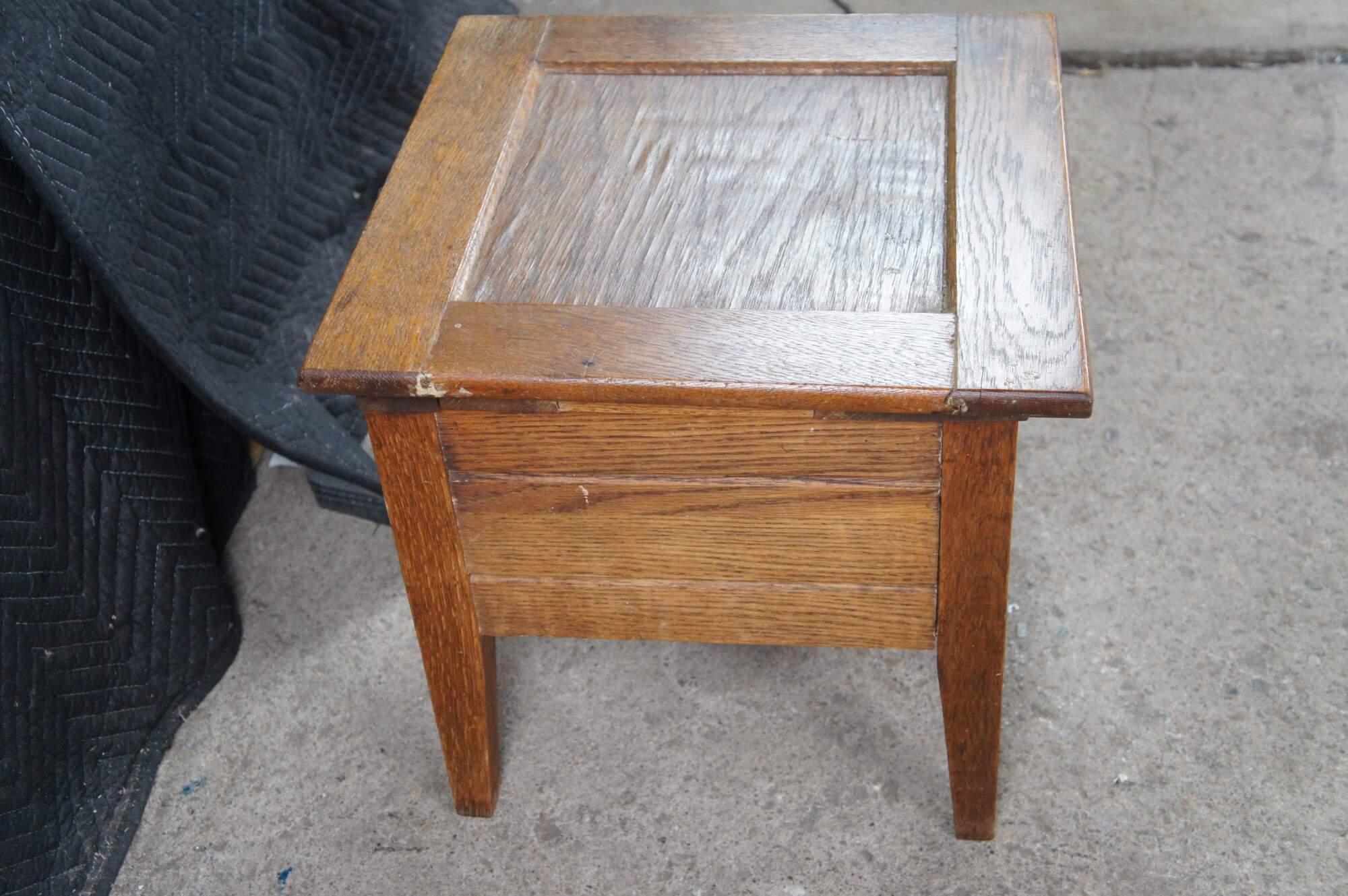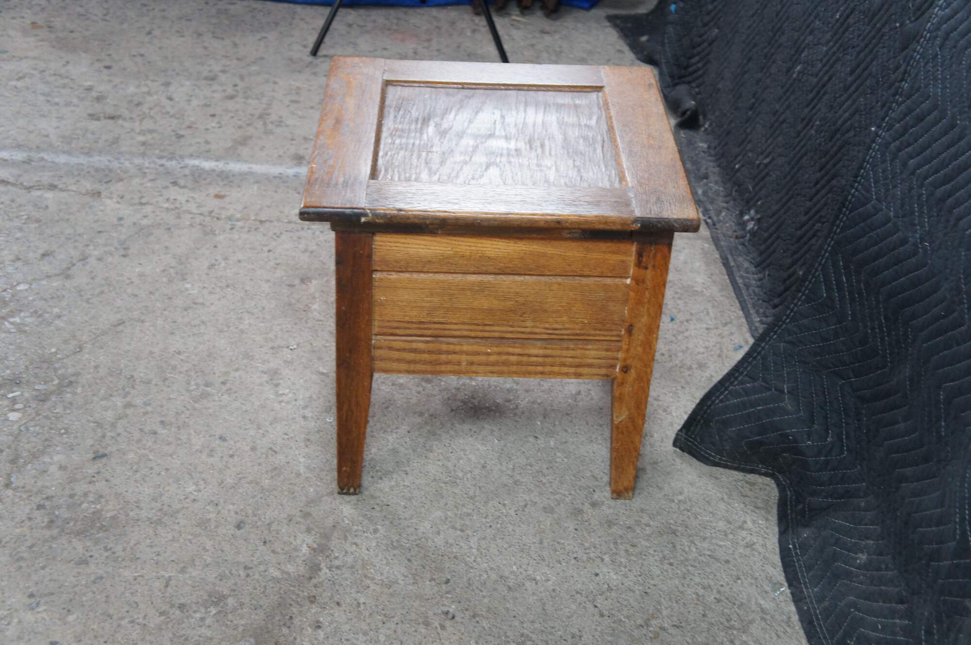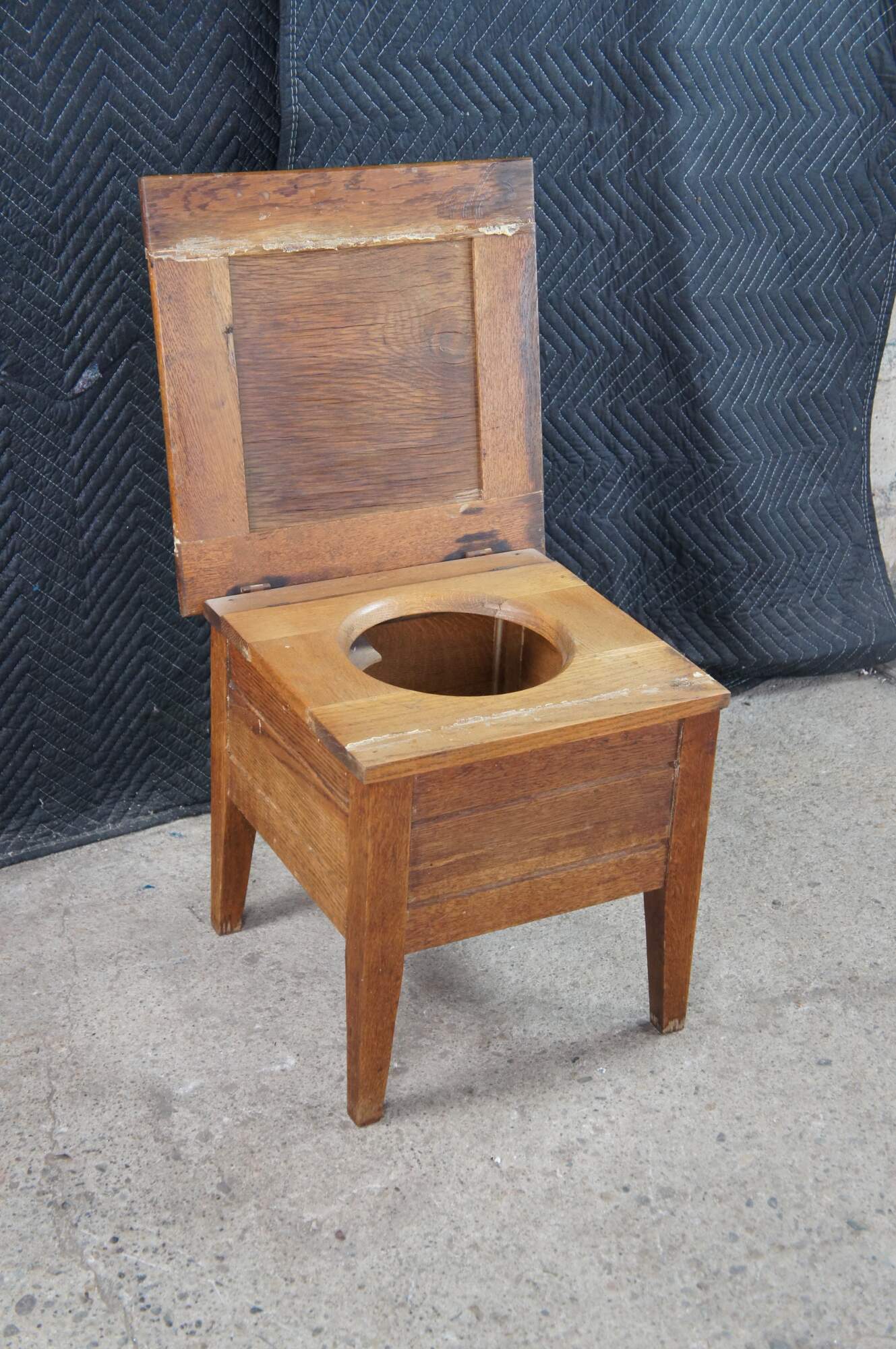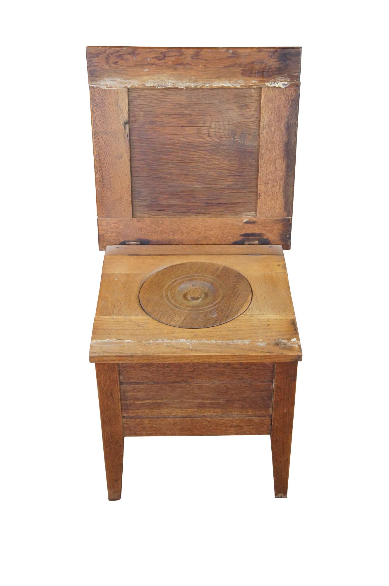 Antique 19th century Mission style chamber pot or commode. Made from quartered oak with a paneled top and square form. The top opens to a porcelain chamber with handle and lid, and is supported by simple tapered legs.