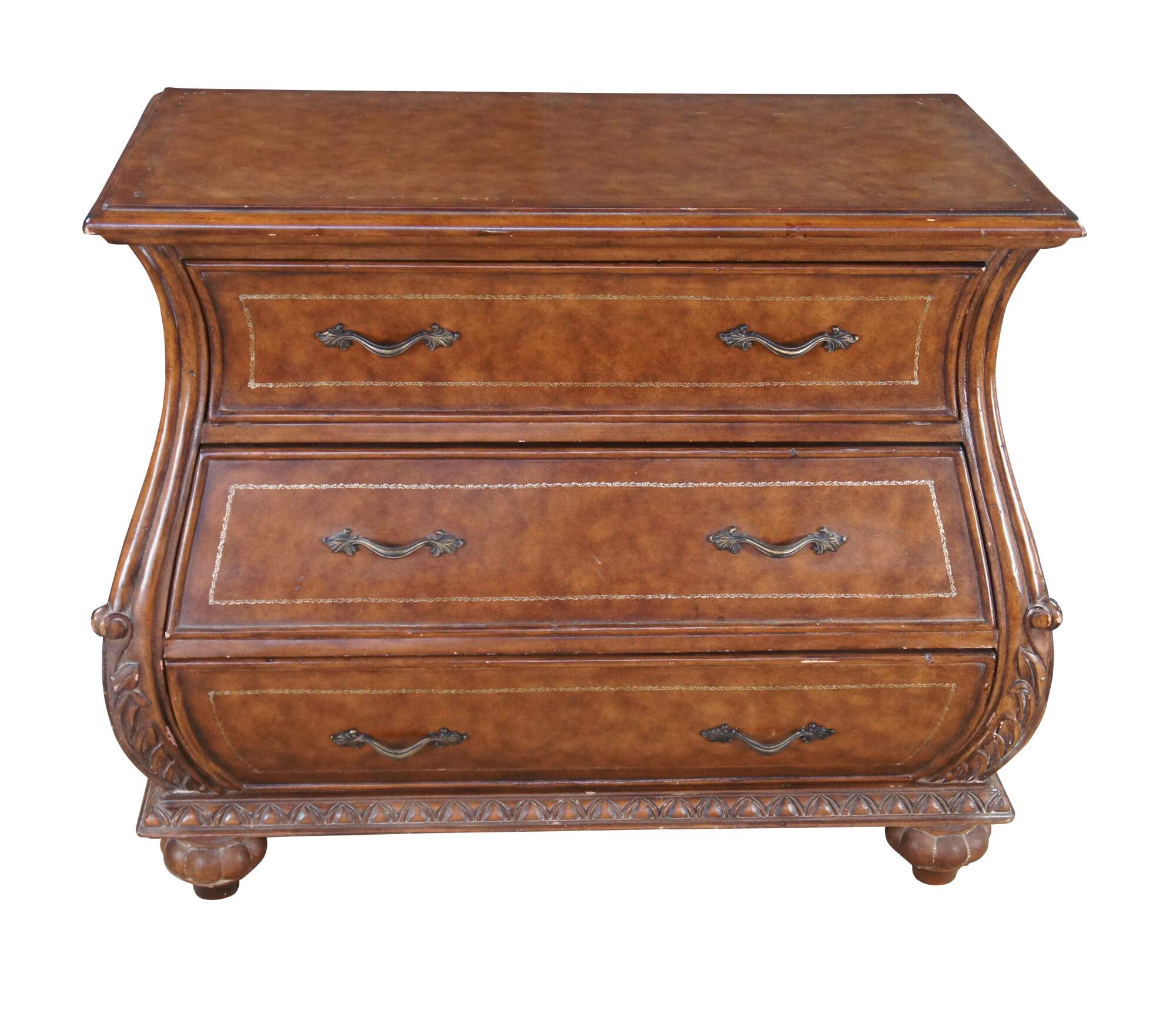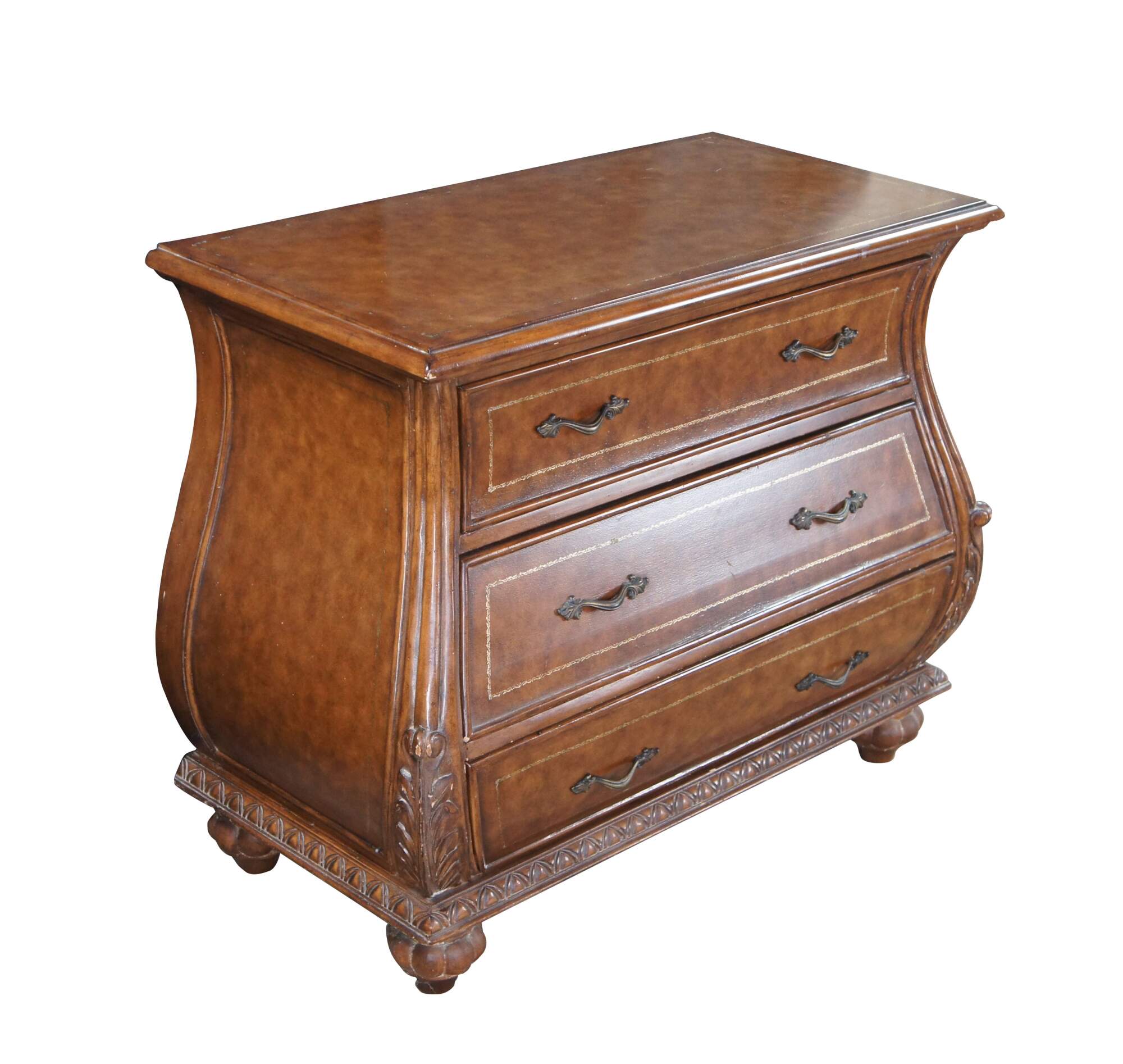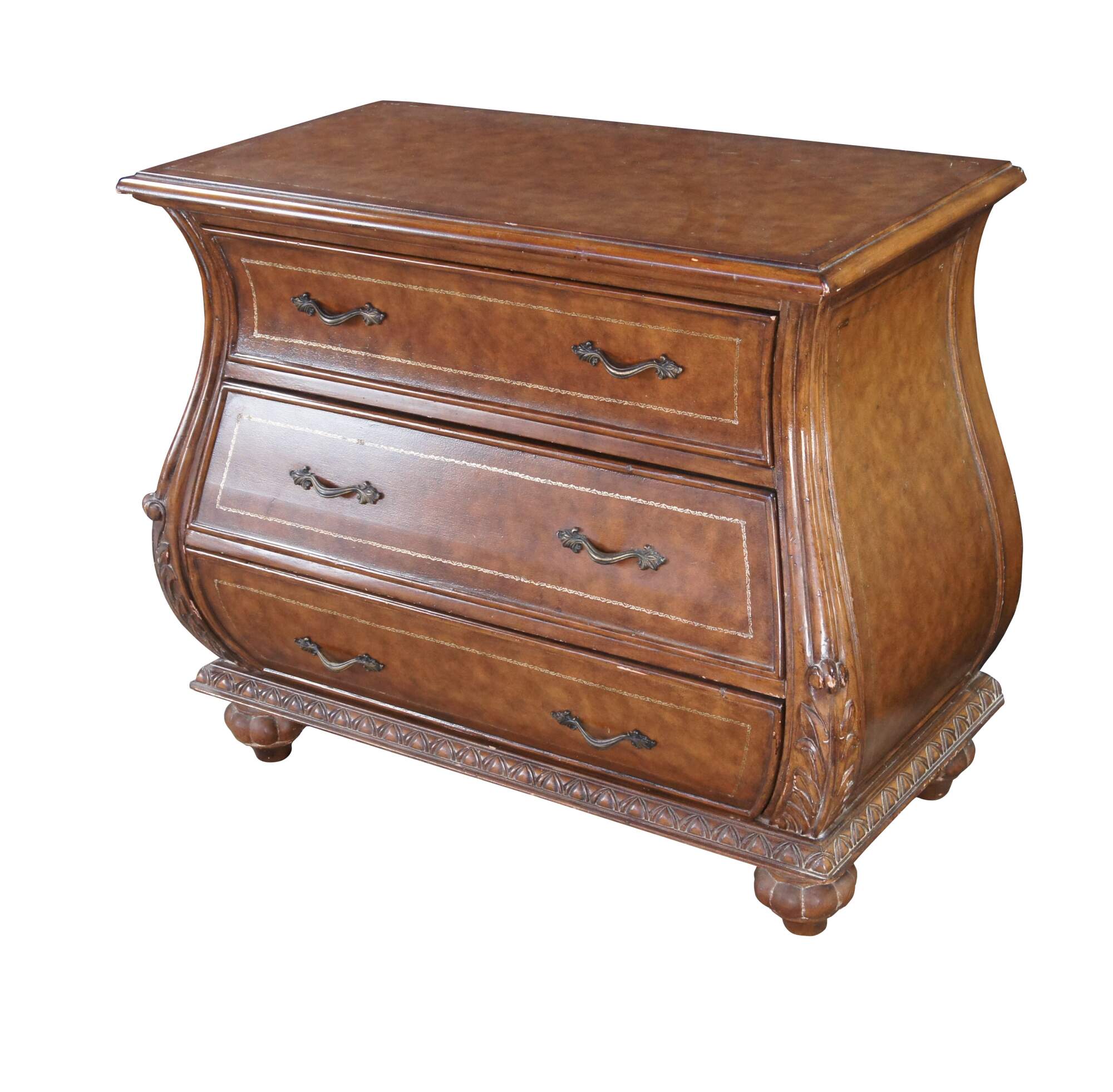 Vintage French Louis XVI style bombe dresser / chest of drawers featuring a tooled leather design with acanthus accents. Made in Indonesia 40-72.