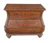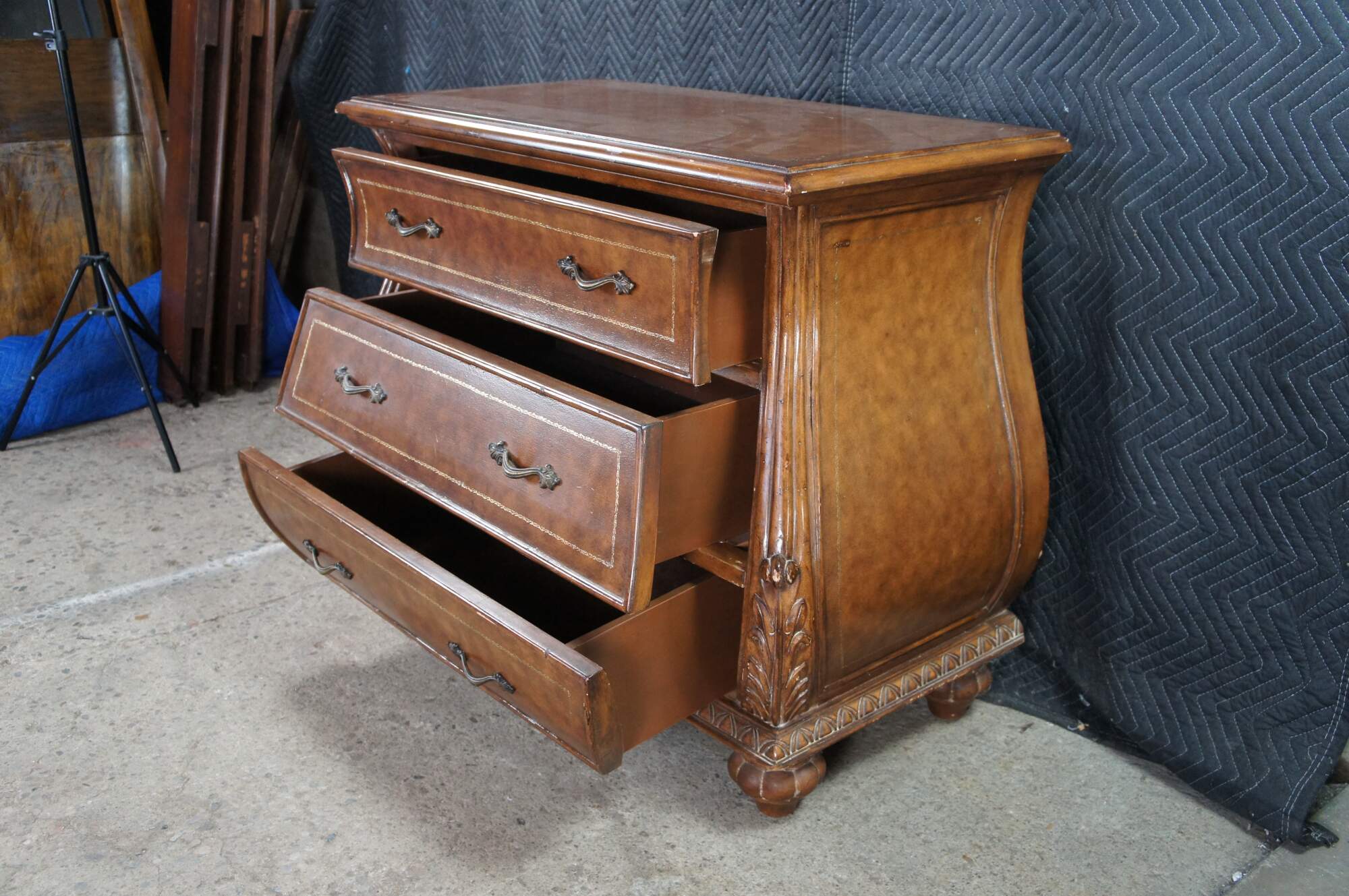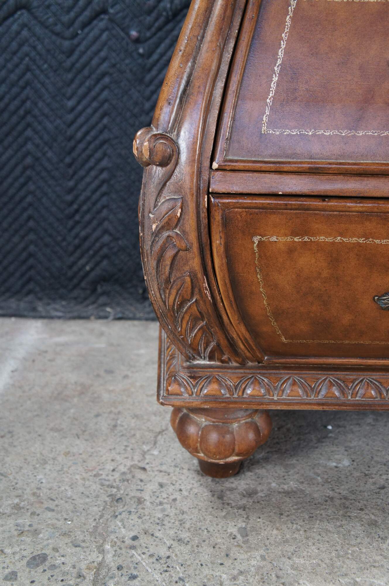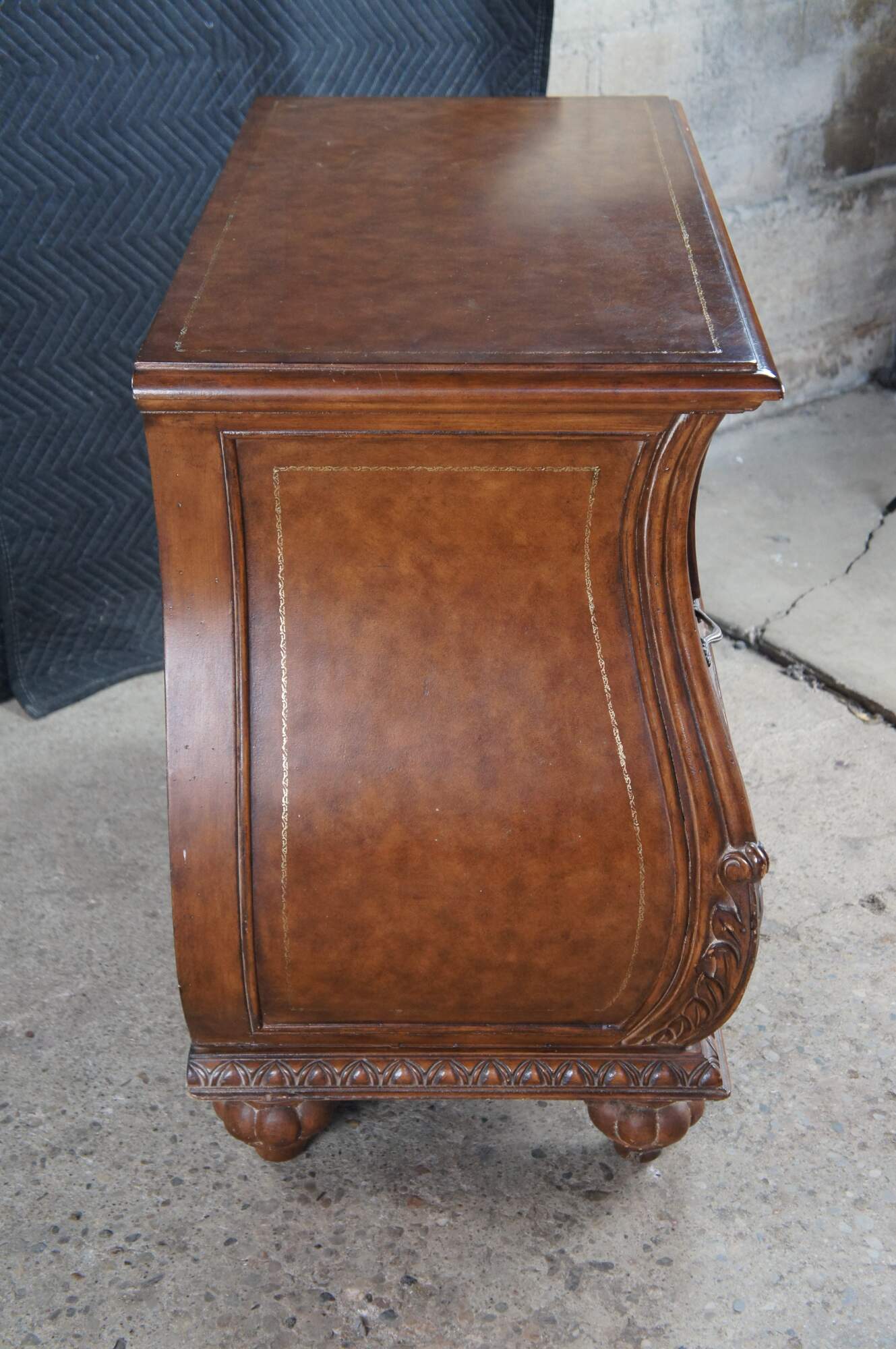 Vintage French Louis XVI style bombe dresser / chest of drawers featuring a tooled leather design with acanthus accents. Made in Indonesia 40-72.