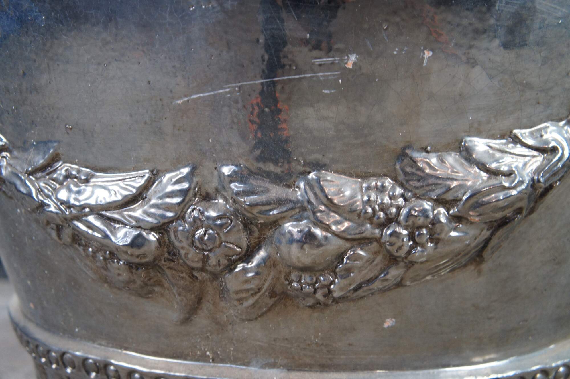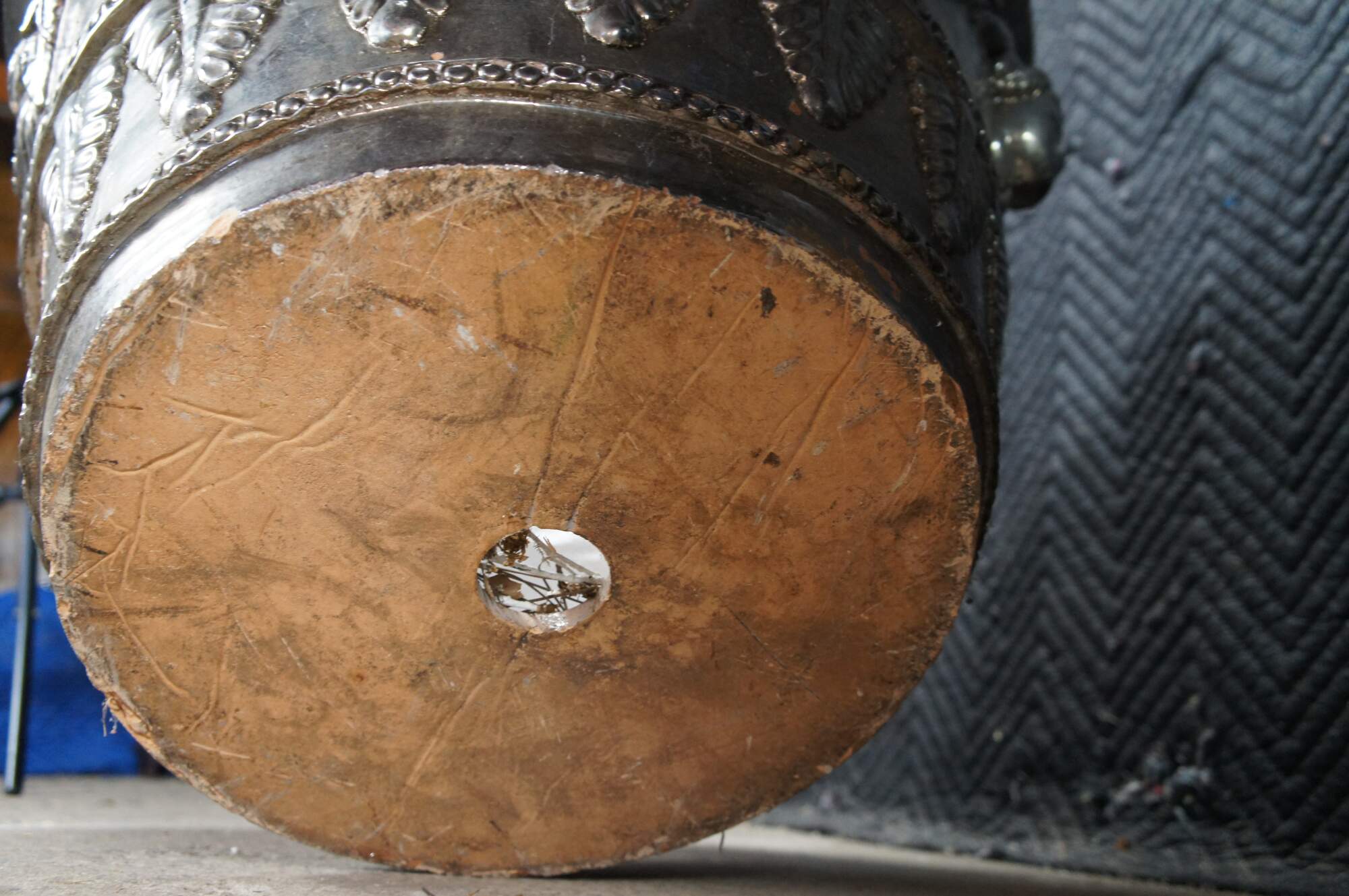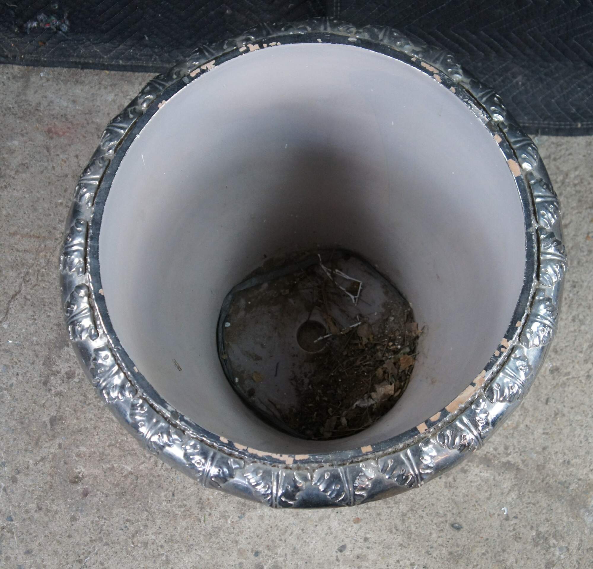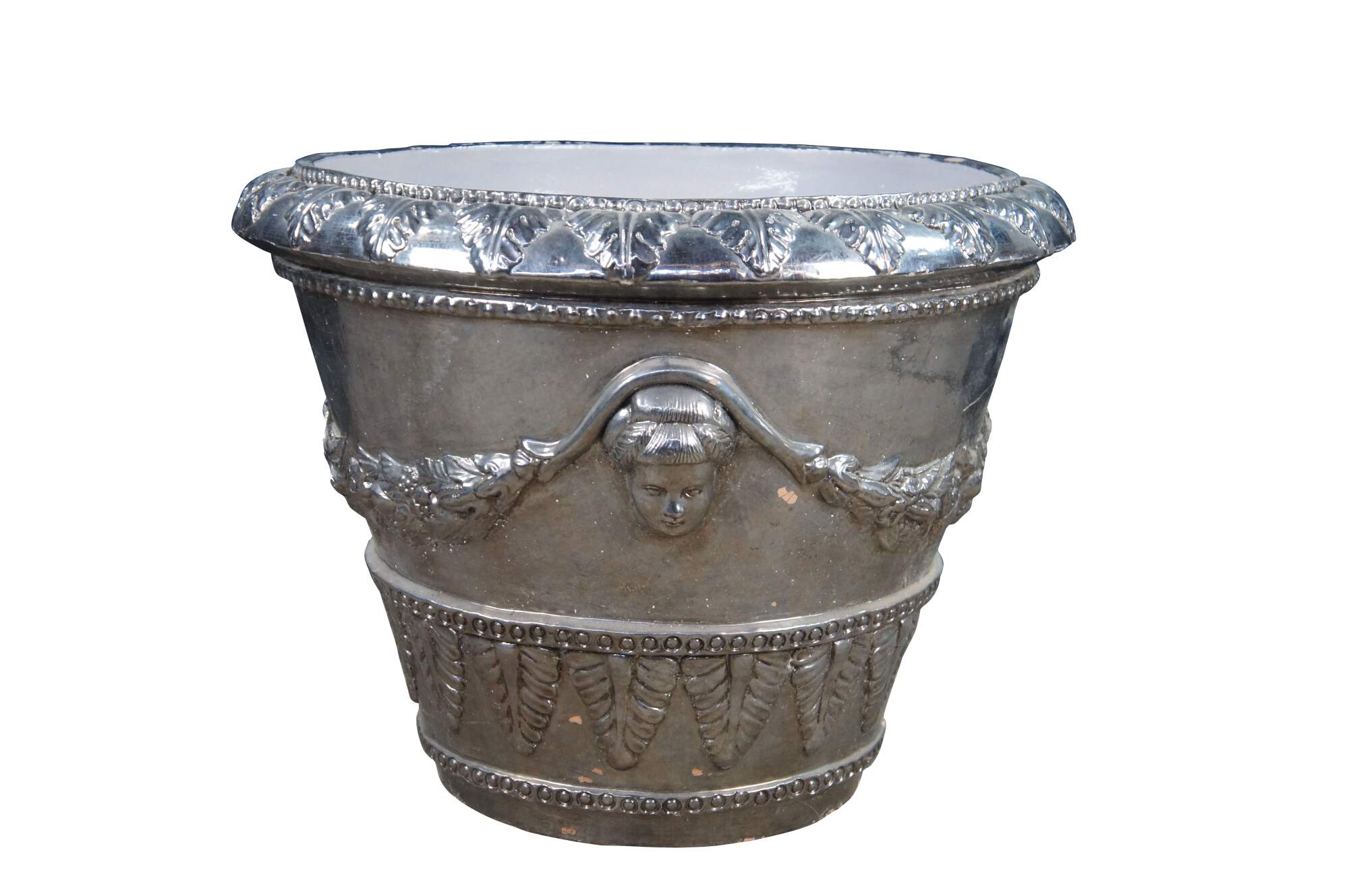 A very large silver painted terracotta planter featuring Italian Neoclassical designs with faces, swags and acanthis accents.