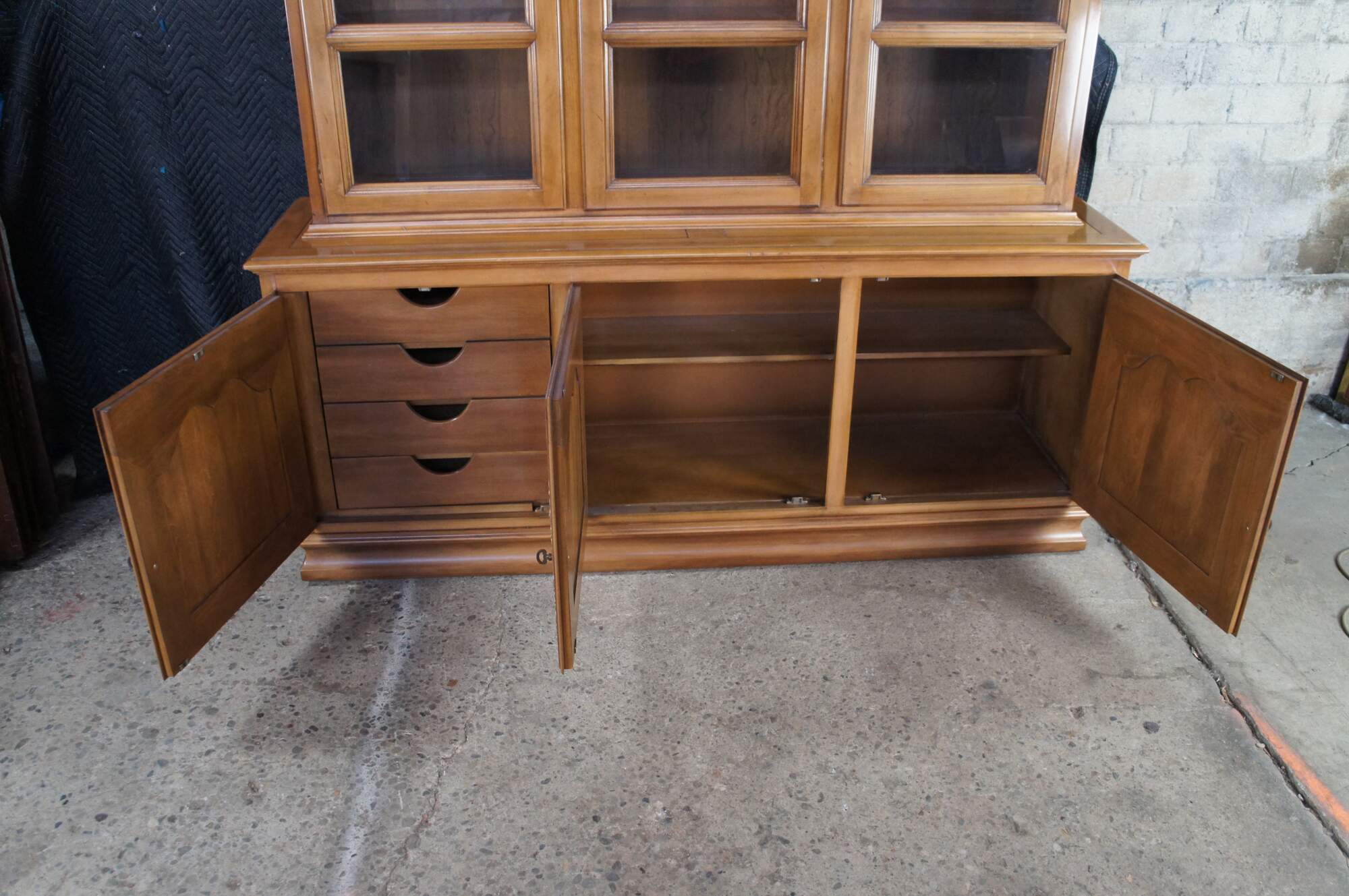 Circa 1970s Century Furniture Italian Provincial China Cabinet. Made from walnut with a stepback hutch featuring 3 shelves for display of china and collectibles. Buffet portion opens to 4 drawers and accessory storage.