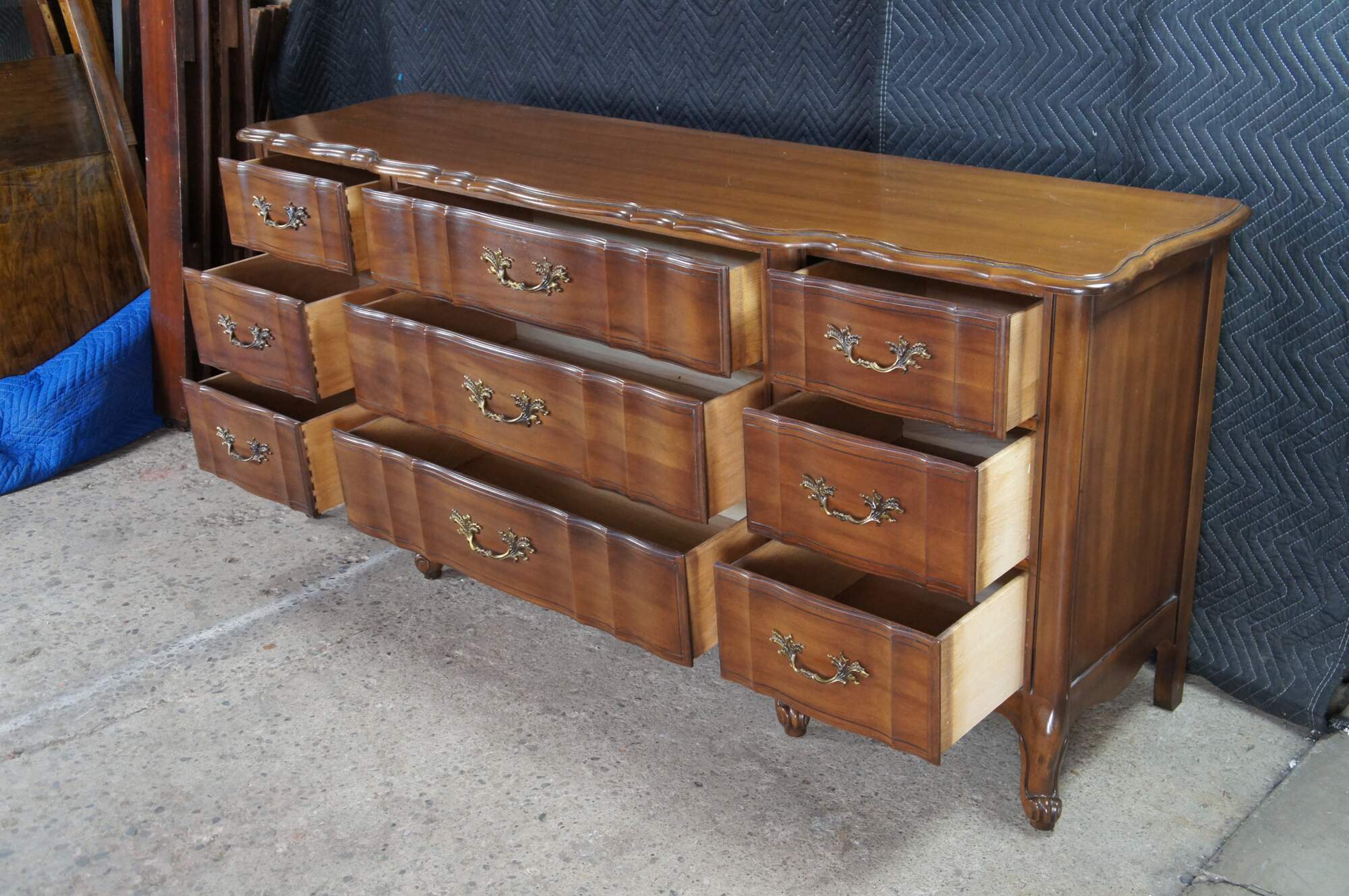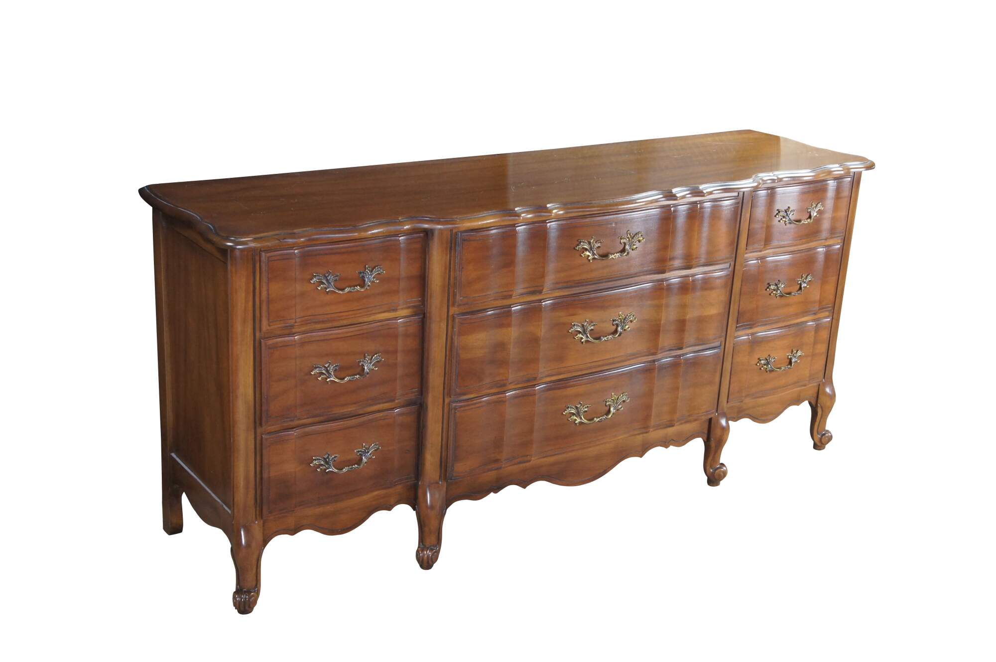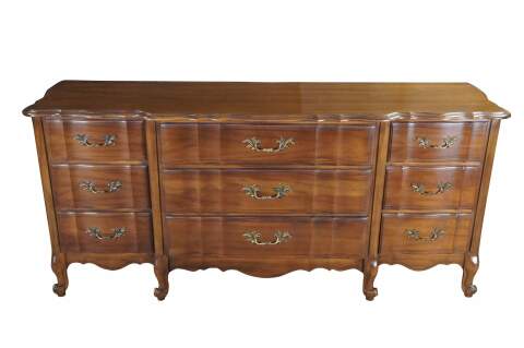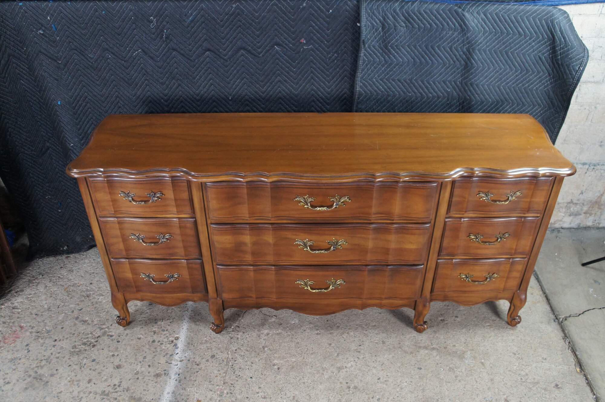 Vintage dresser / sideboard / console by Kent Coffey. From the Marquee French collection, featuring French Provincial styling with scalloped / serpentine top over nine drawers and scrolled cabriole feet. 300-102, Fruitwood.