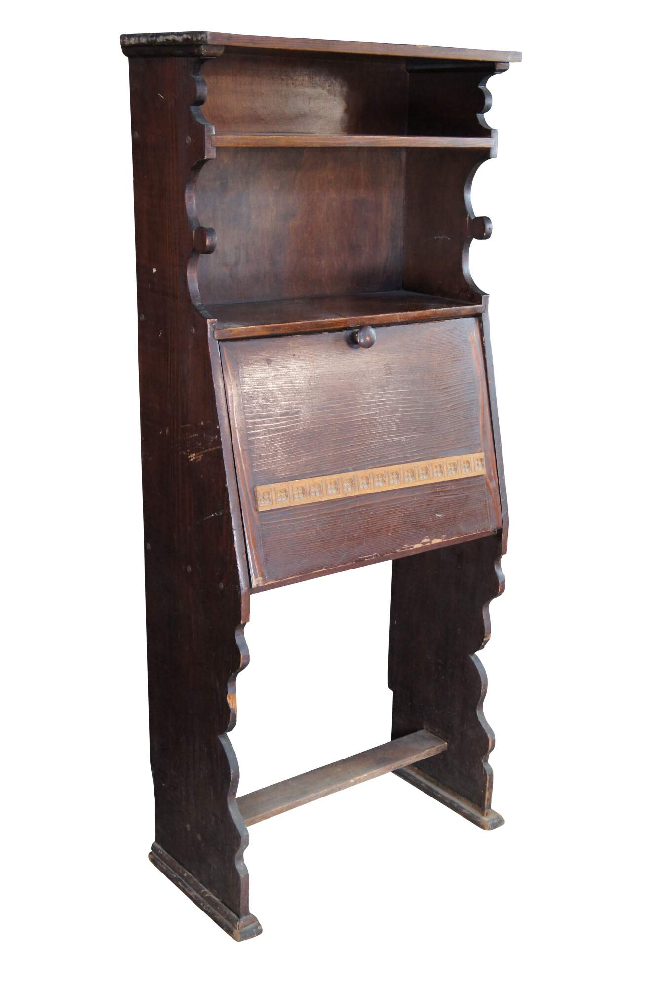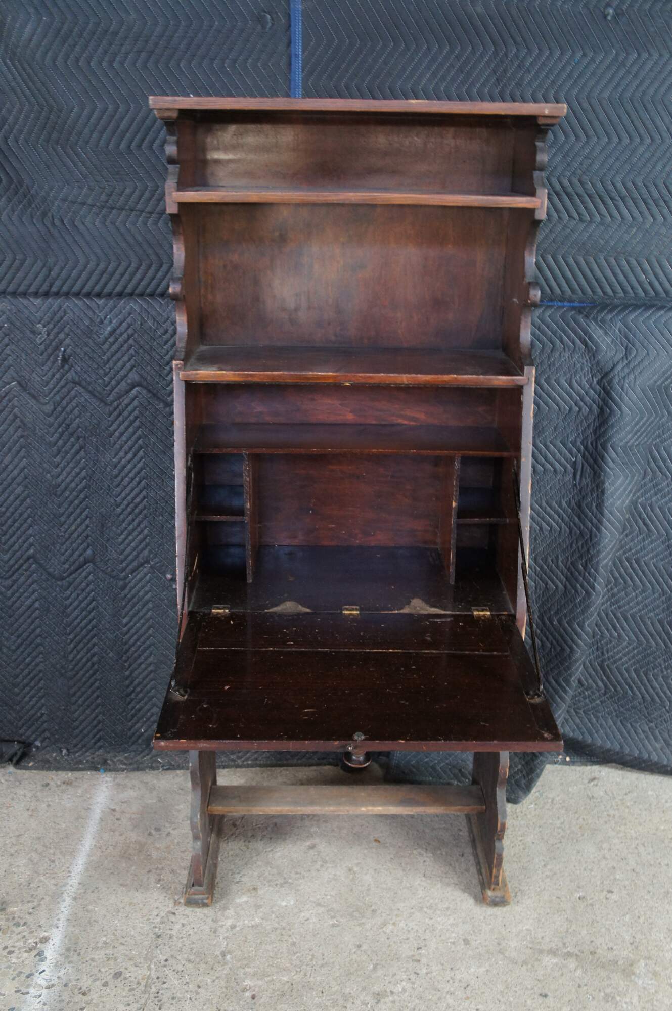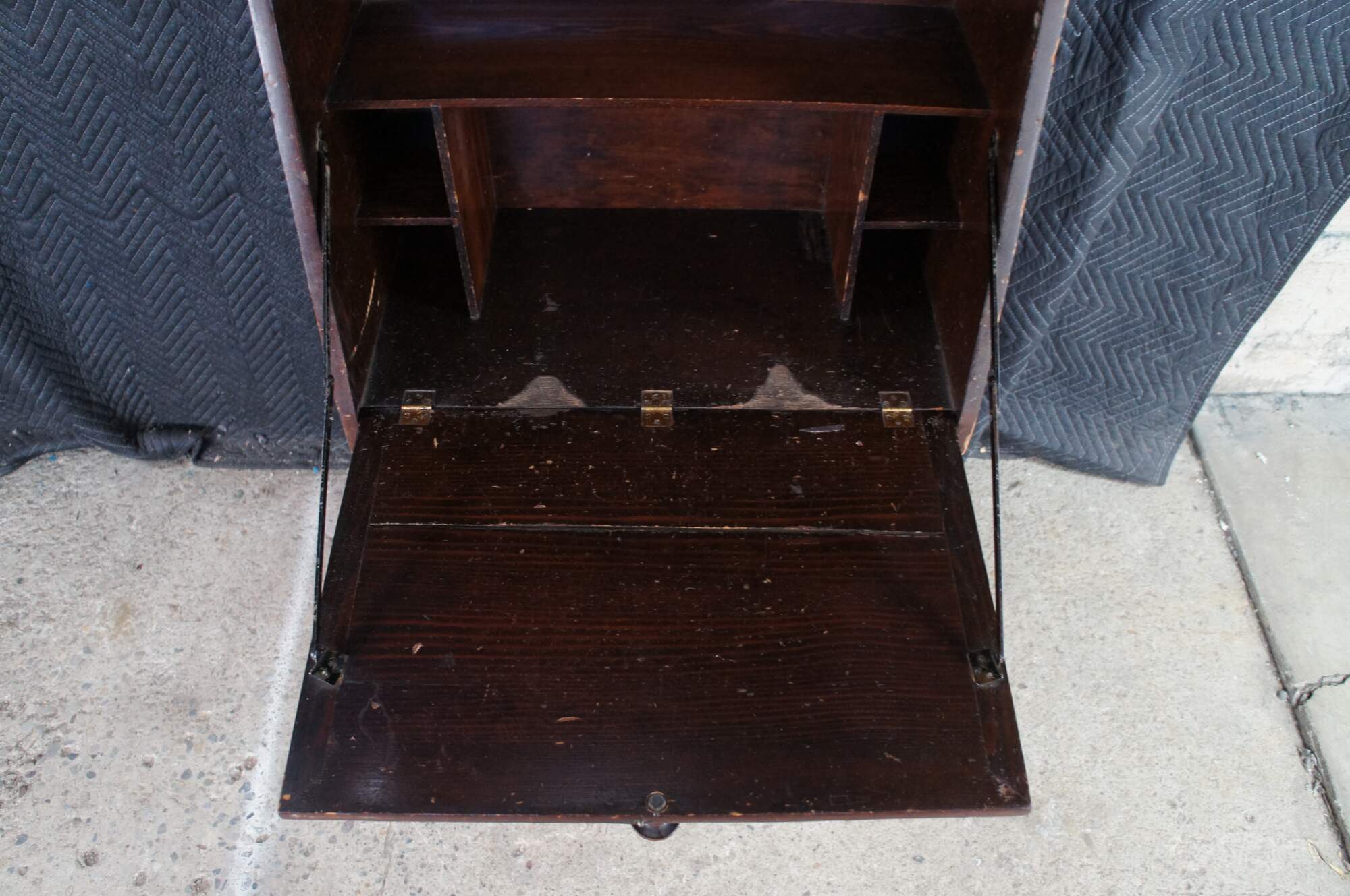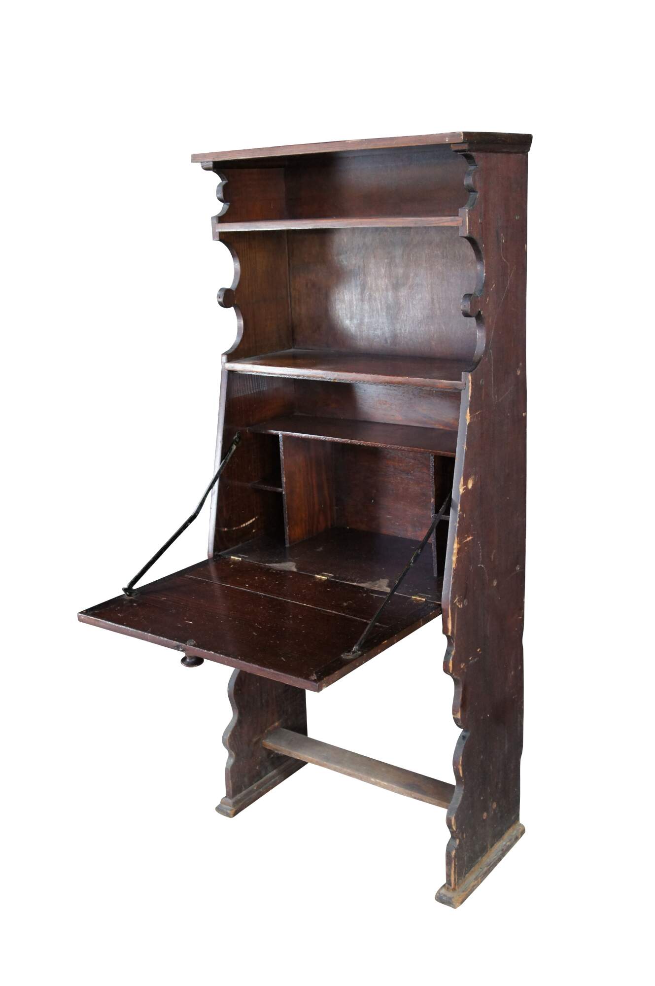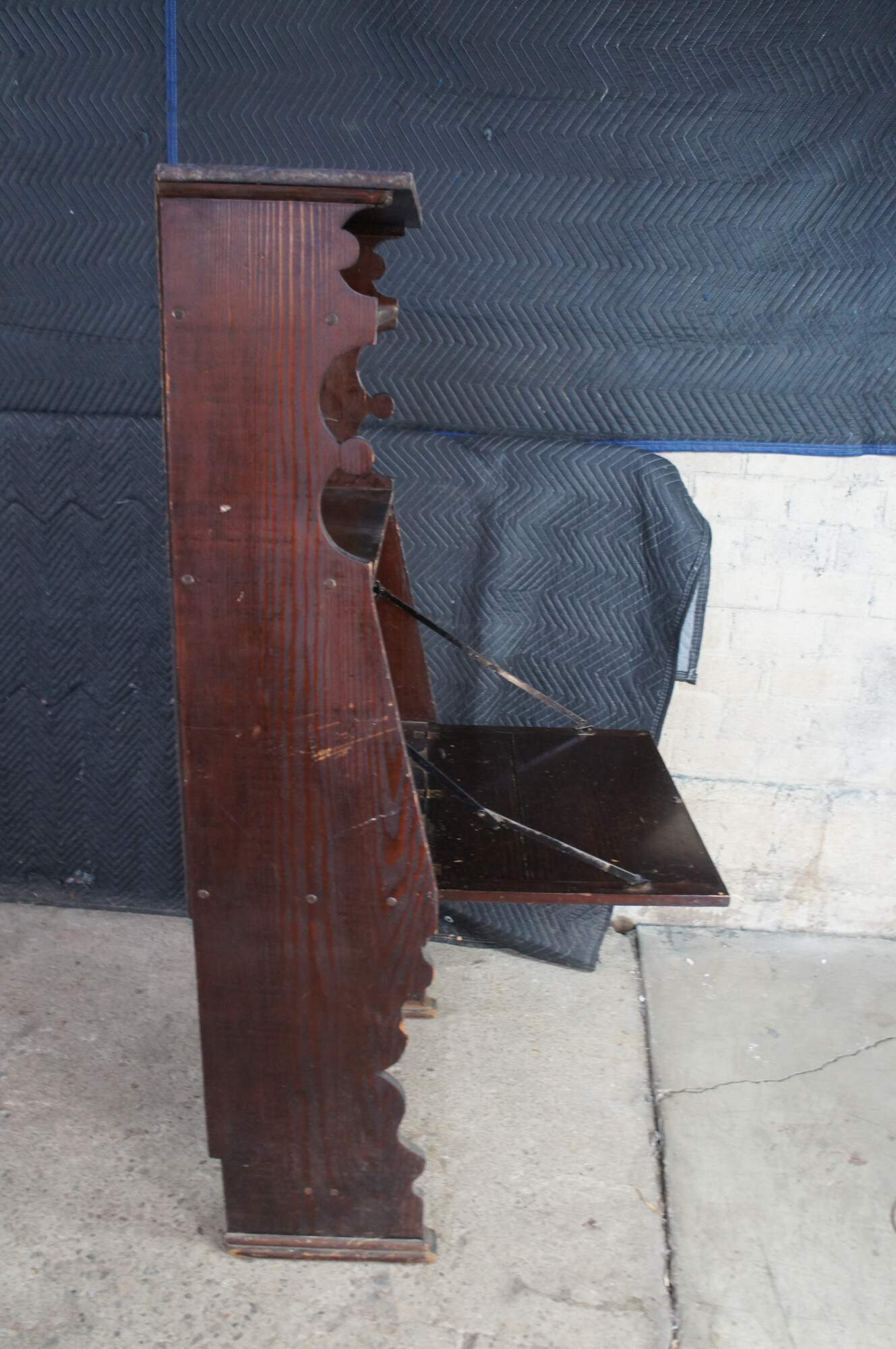 Antique Early American style secretary desk / bookcase / writing bureau / larkin / chalet . Made of oak featuring a serpentine design with drop front that opens to multiple cubbies and large work surface, and upper bookshelves.