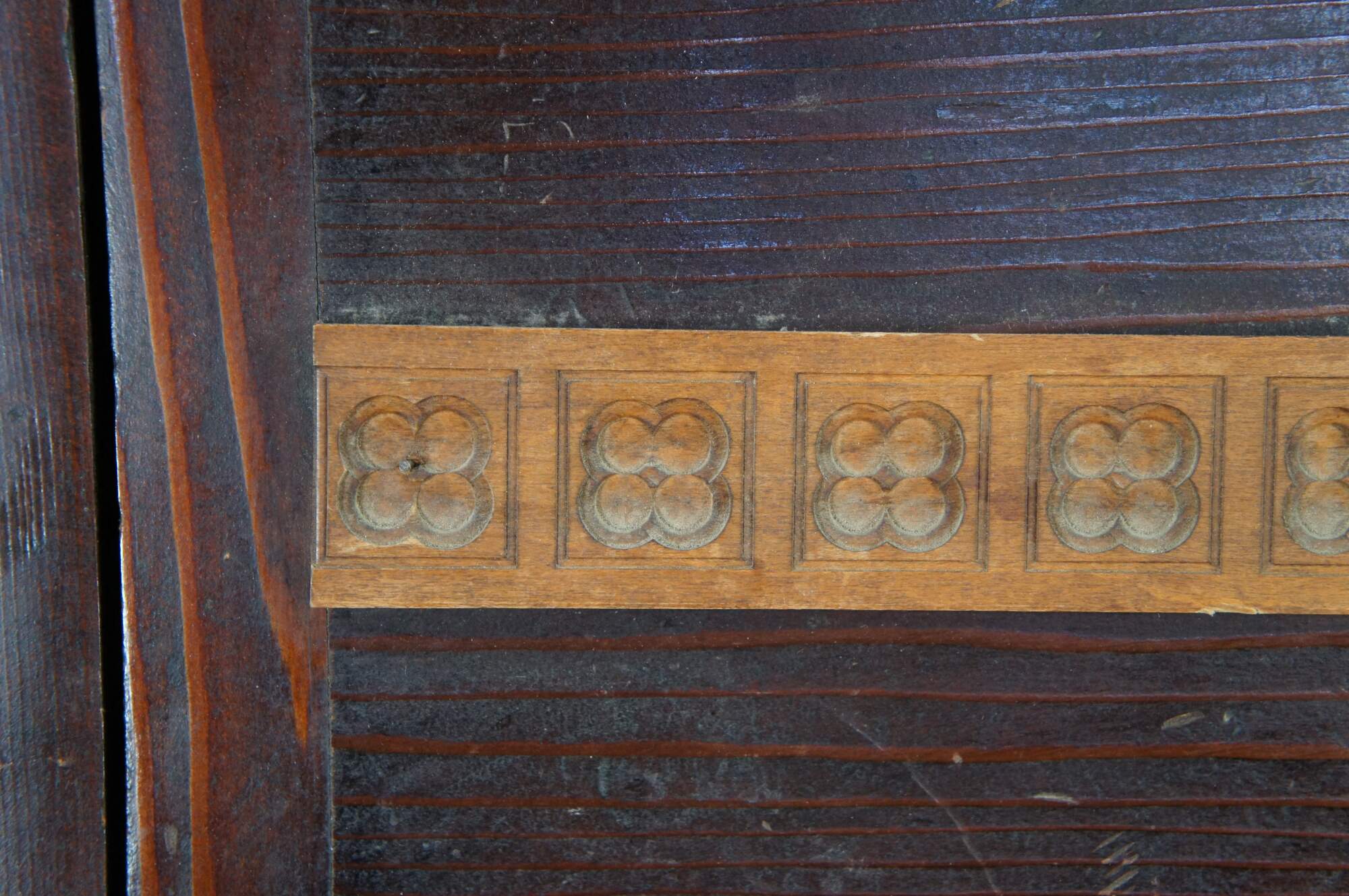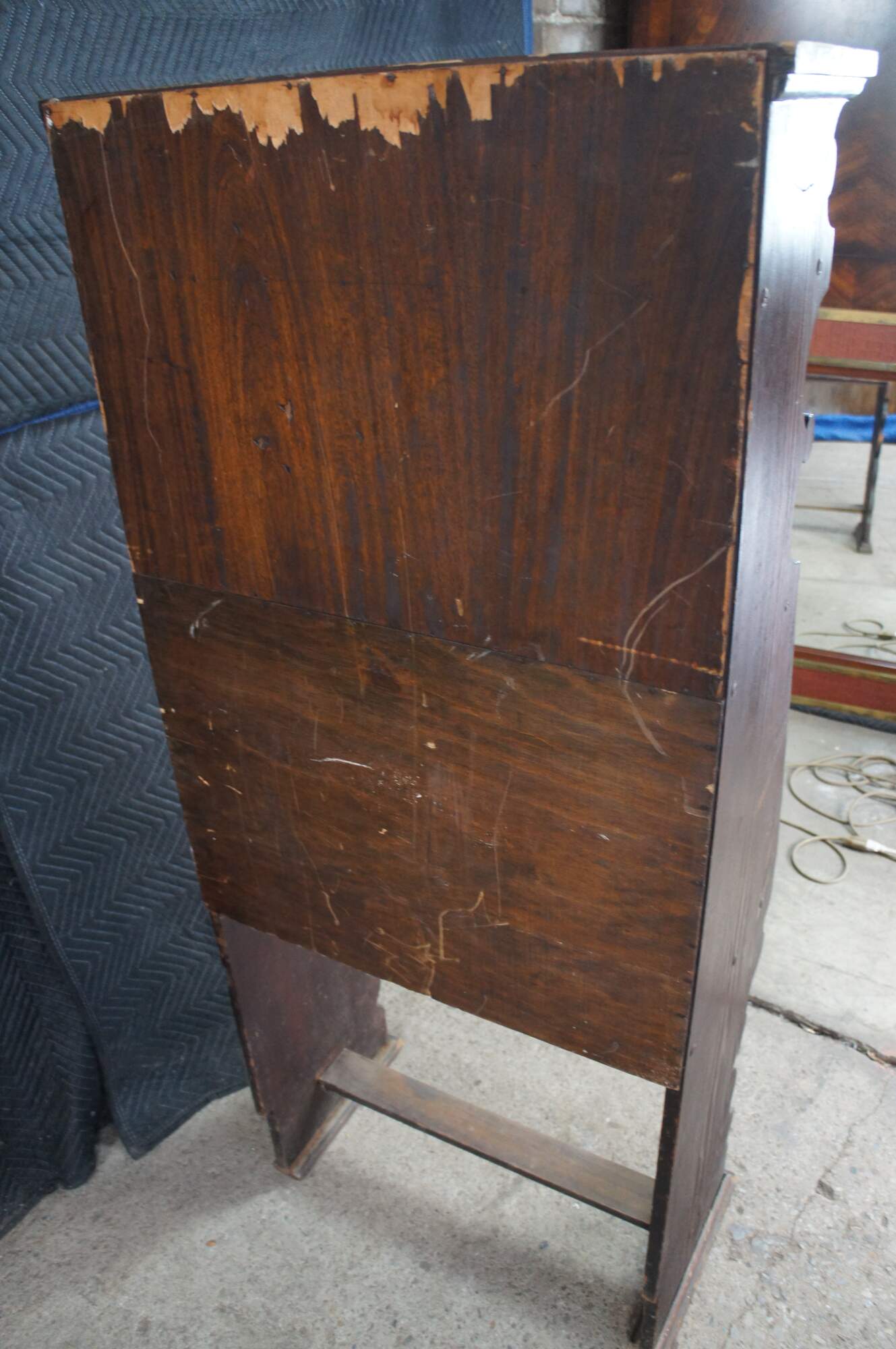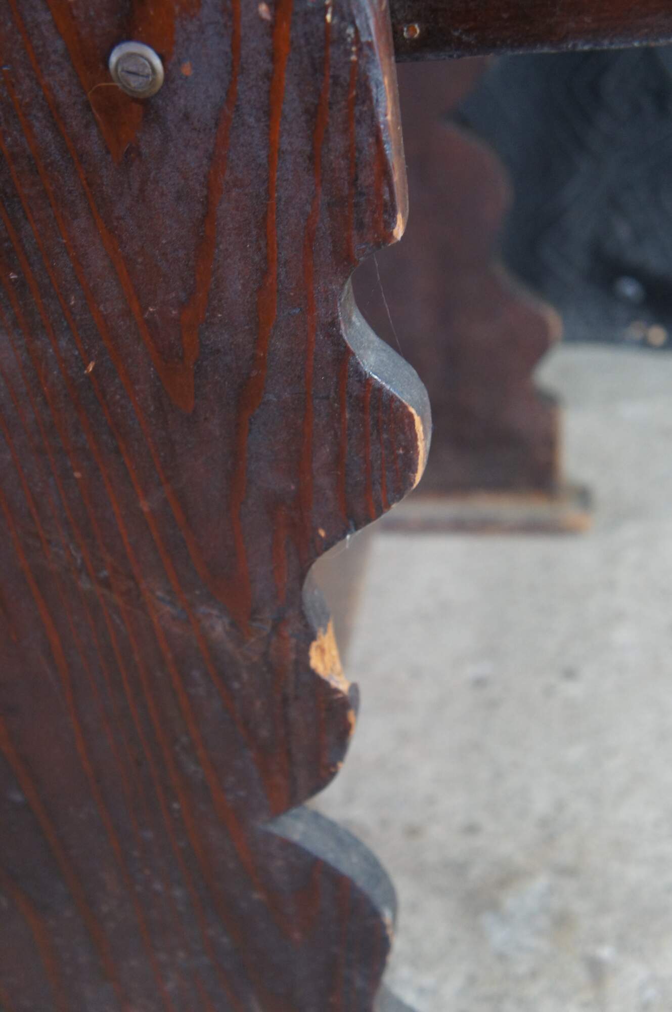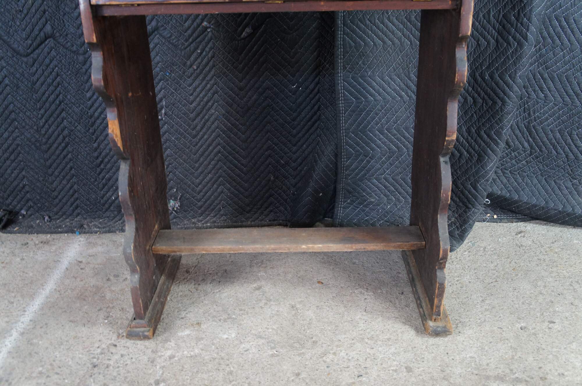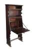 Antique Early American style secretary desk / bookcase / writing bureau / larkin / chalet . Made of oak featuring a serpentine design with drop front that opens to multiple cubbies and large work surface, and upper bookshelves.
