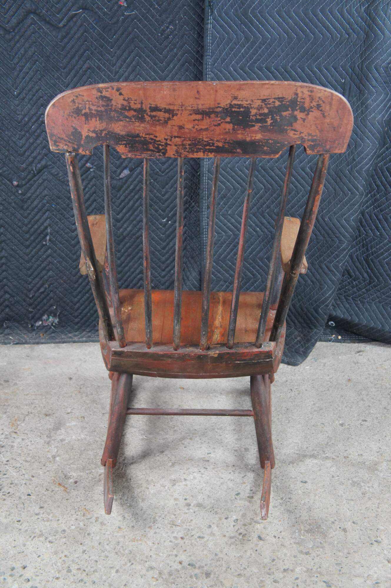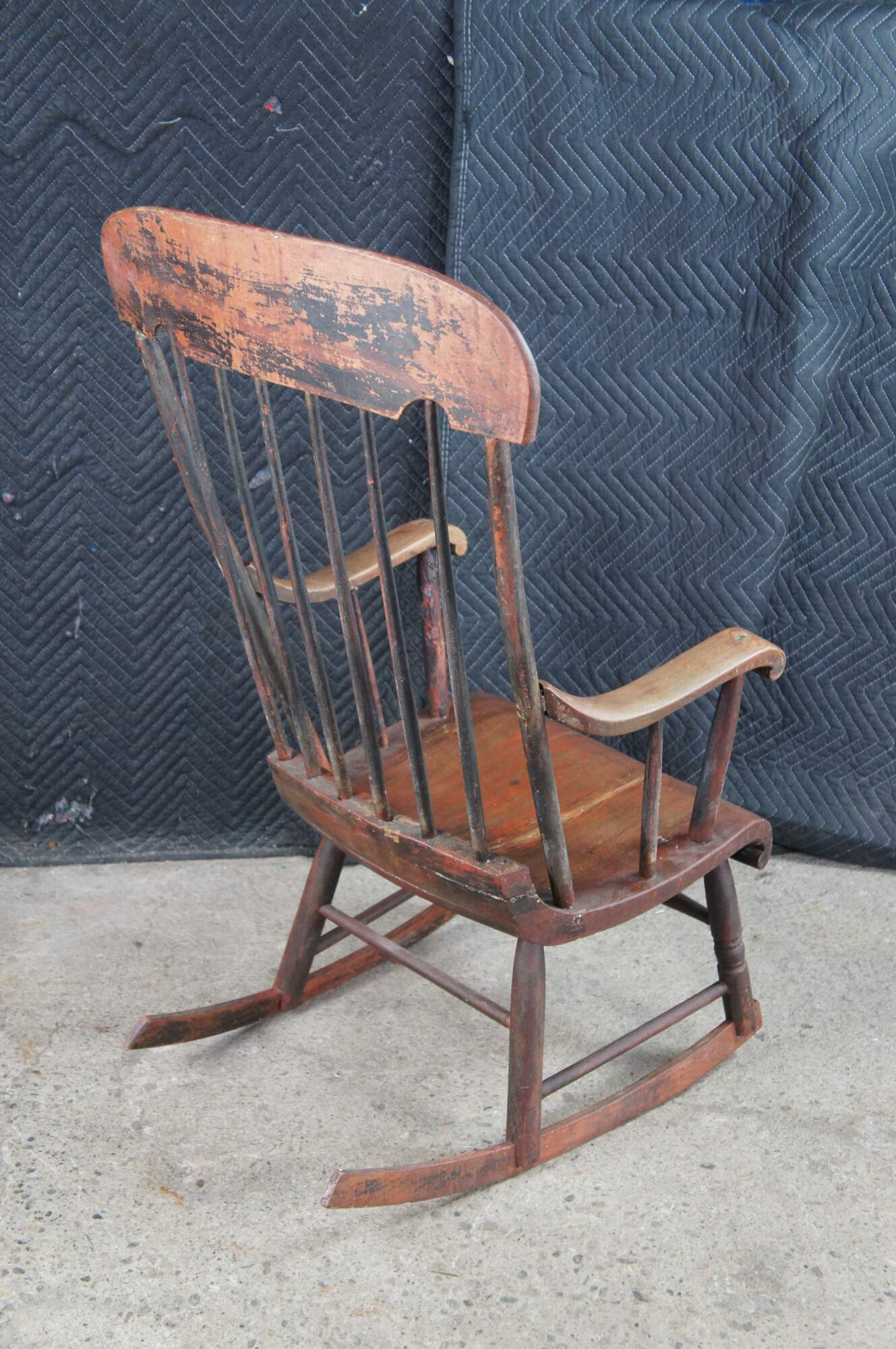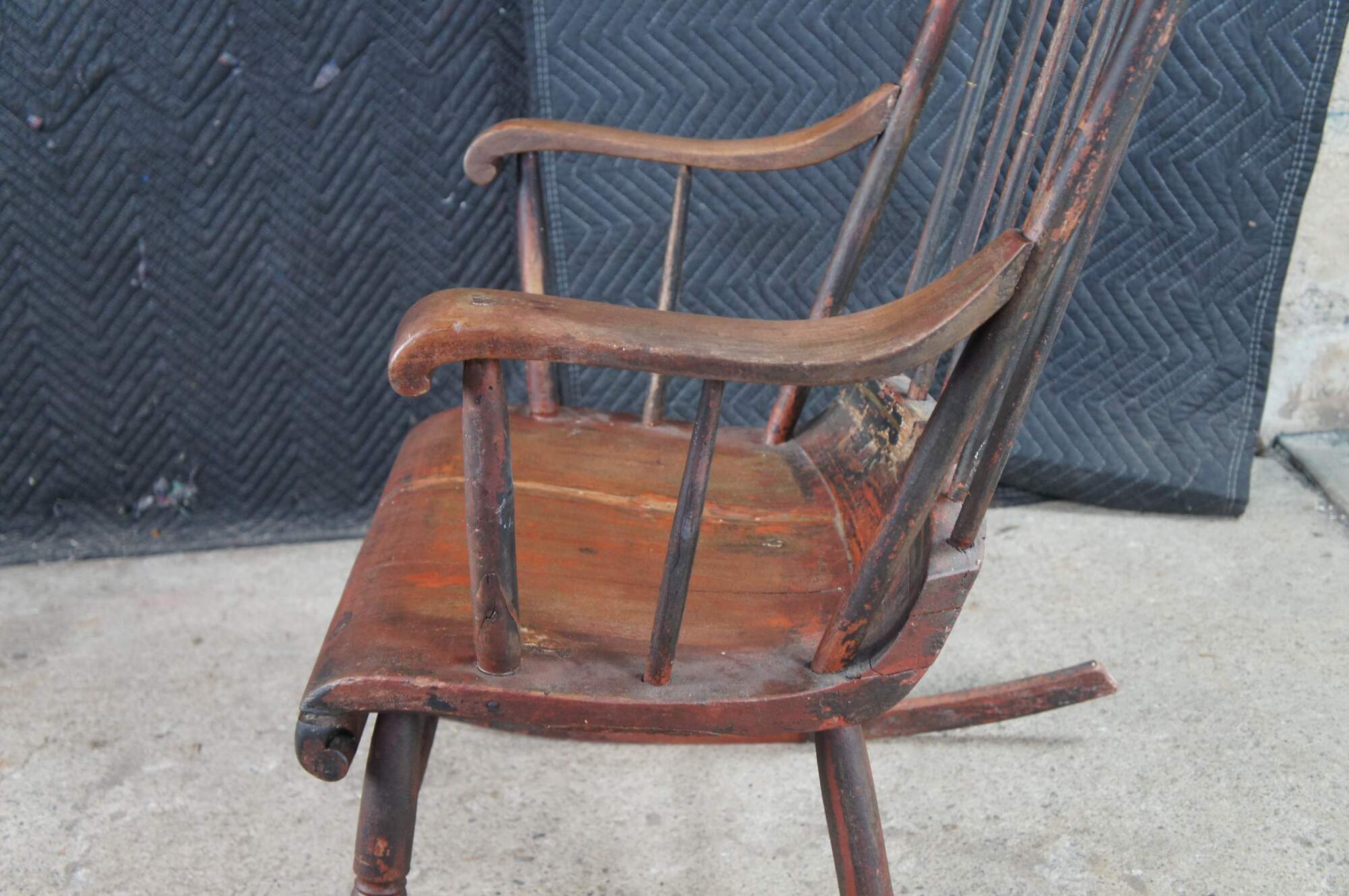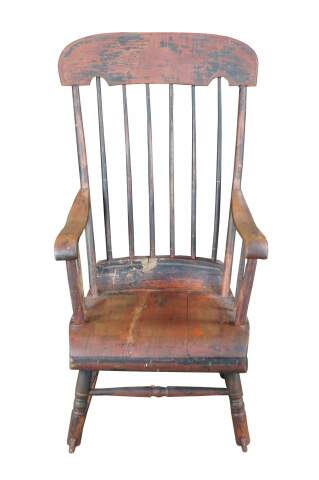 Antique Early American Country Farmhouse Windsor Hitchcock style slat back rocking armchair. Likely an old Boston stenciled rocker, but has been repainted / heavily faded.