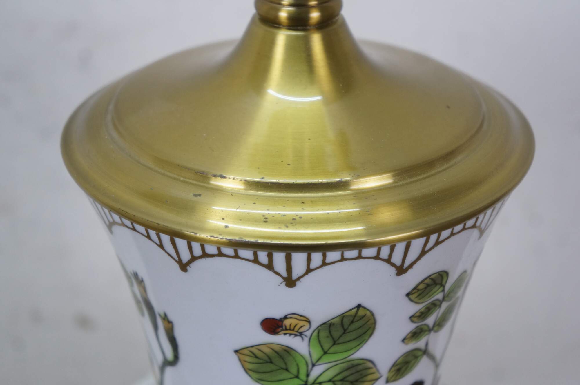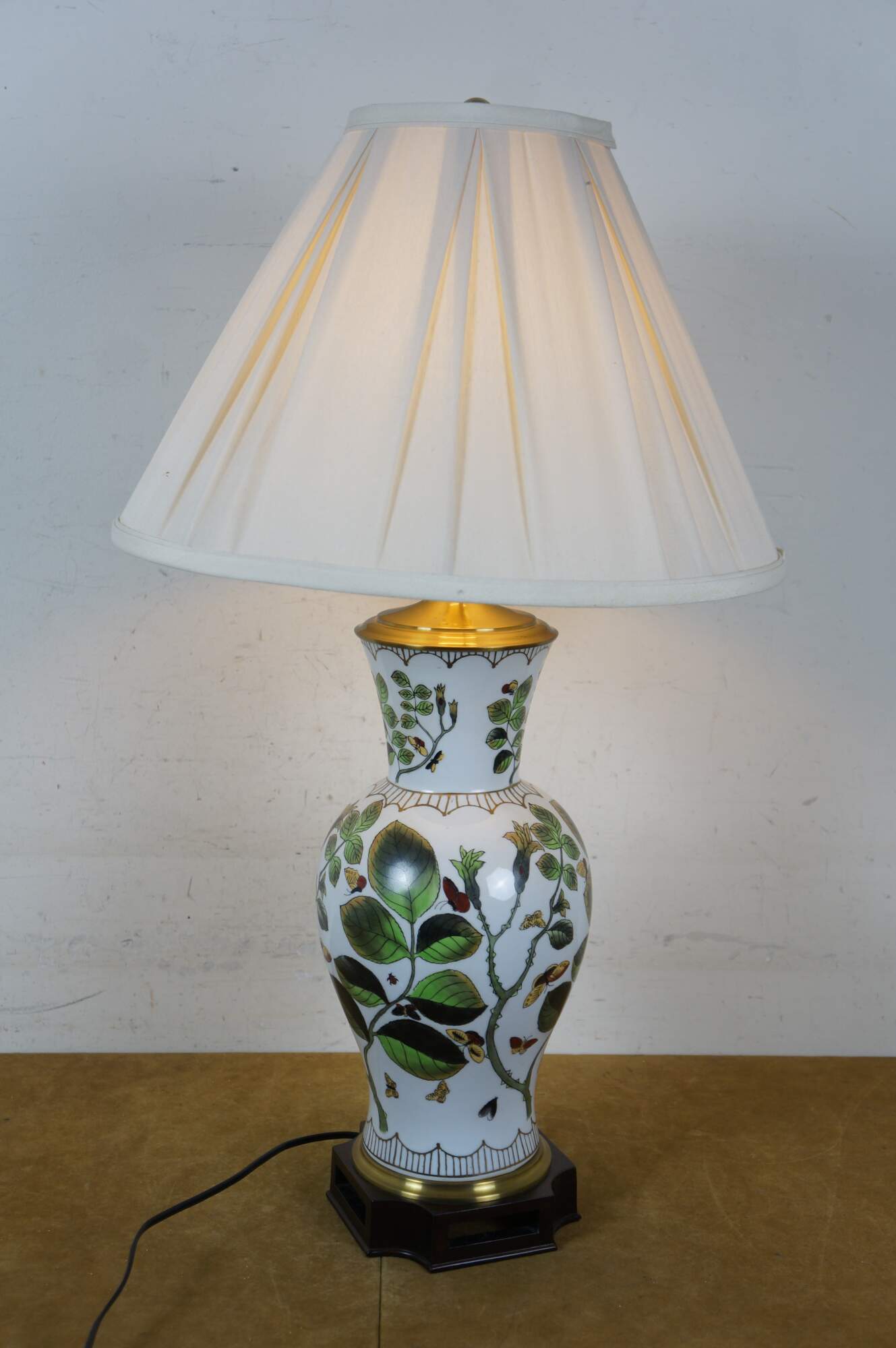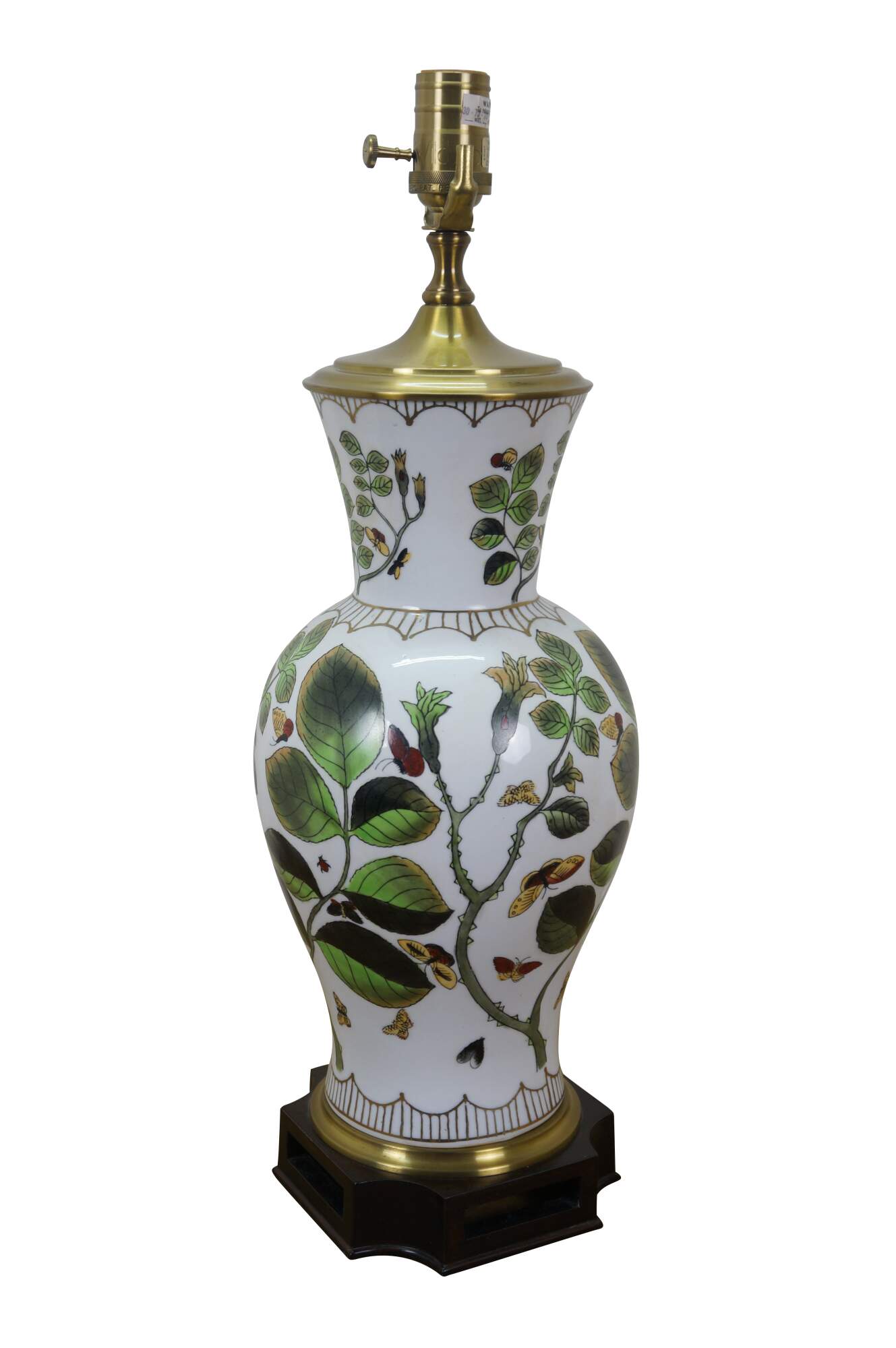 Circa 1980's Wildwood table lamp - Chinoiserie style white porcelain vase shaped body, hand painted with leaves, branches and butterflies, brass accents and a squared off wooden base. Includes harp, orb finial, and white fabric shade.