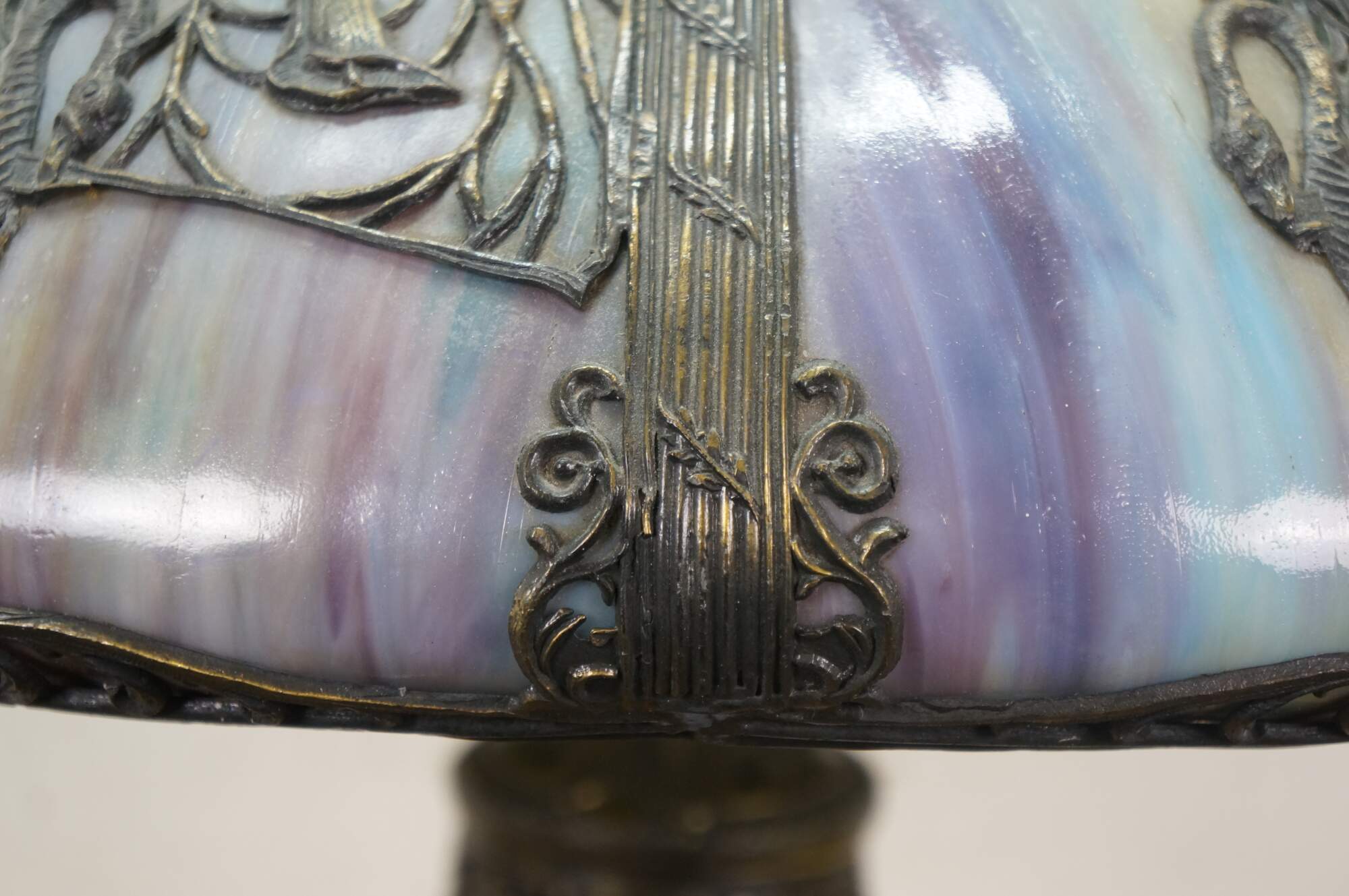Antique Victorian era Aesthetic Movement / Art Nouveau style table lamp. Mushroom shaped lamp crafted of swirling blue, white, and purple slag glass framed with ornate filigree brass designs of vines, flowers, birds and chinoiserie vases. Two light upper portion with pull chains. Individually illuminated base with button switch. Attributed to Bradley & Hubbard.