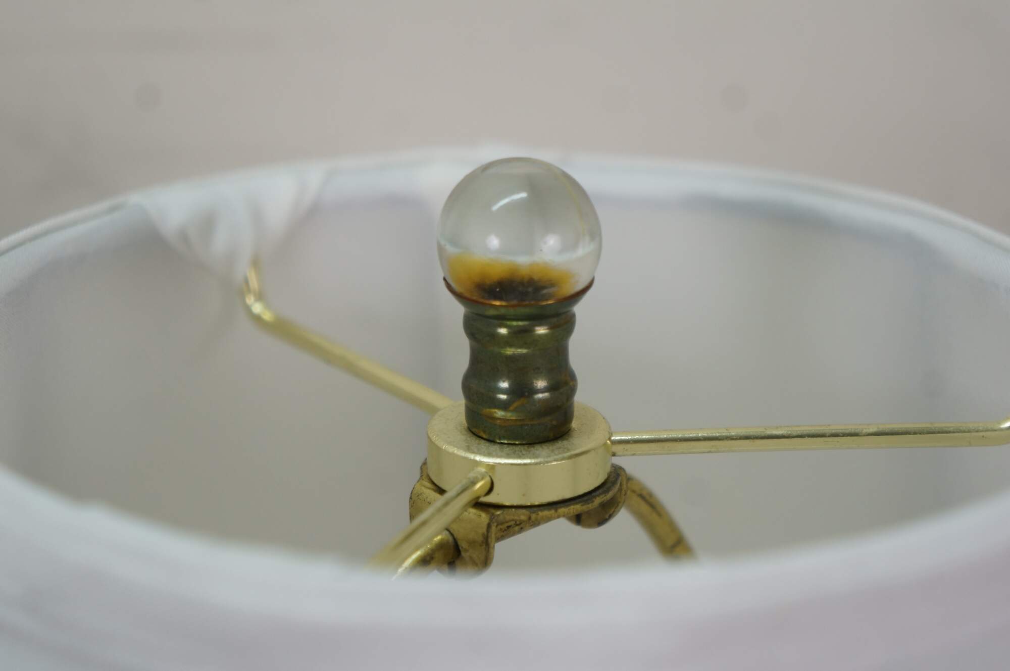 Pair of circa mid 20th century cut crystal / glass table lamps - five geometrically cut crystal prisms divided by reticulated brass bands. Hollywood Regency styling. Includes harps, glass orb finials, and white fabric shades.