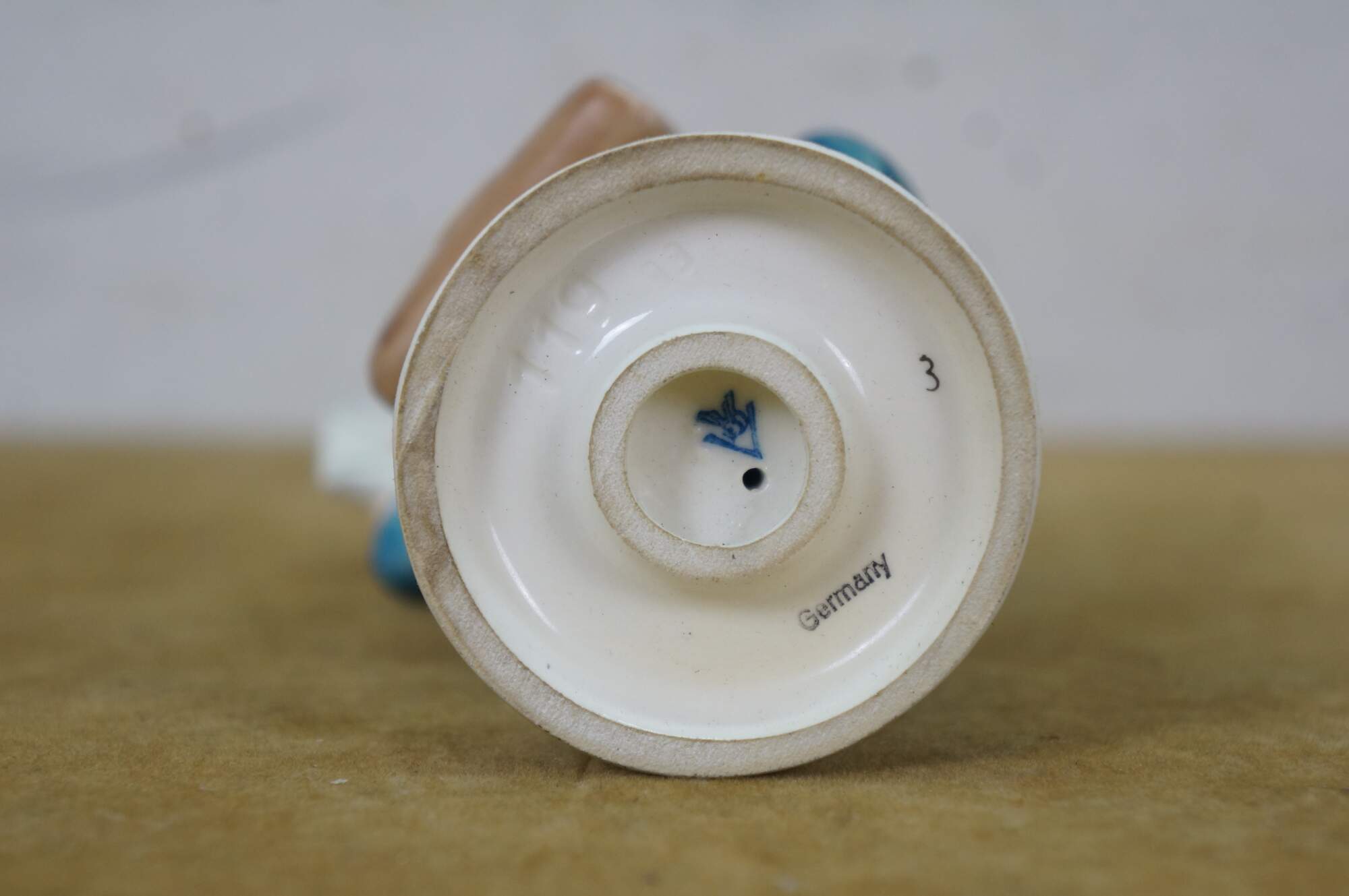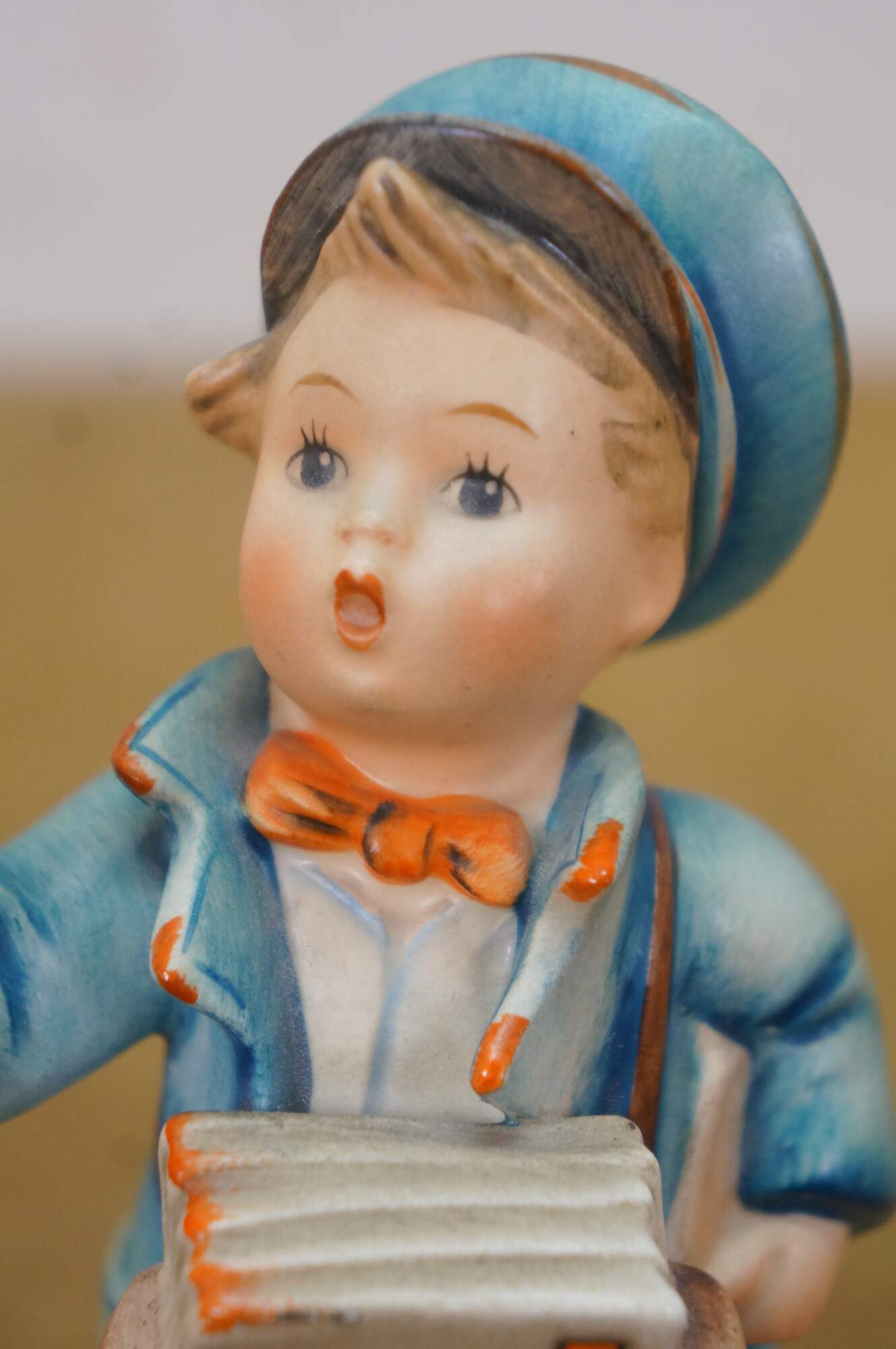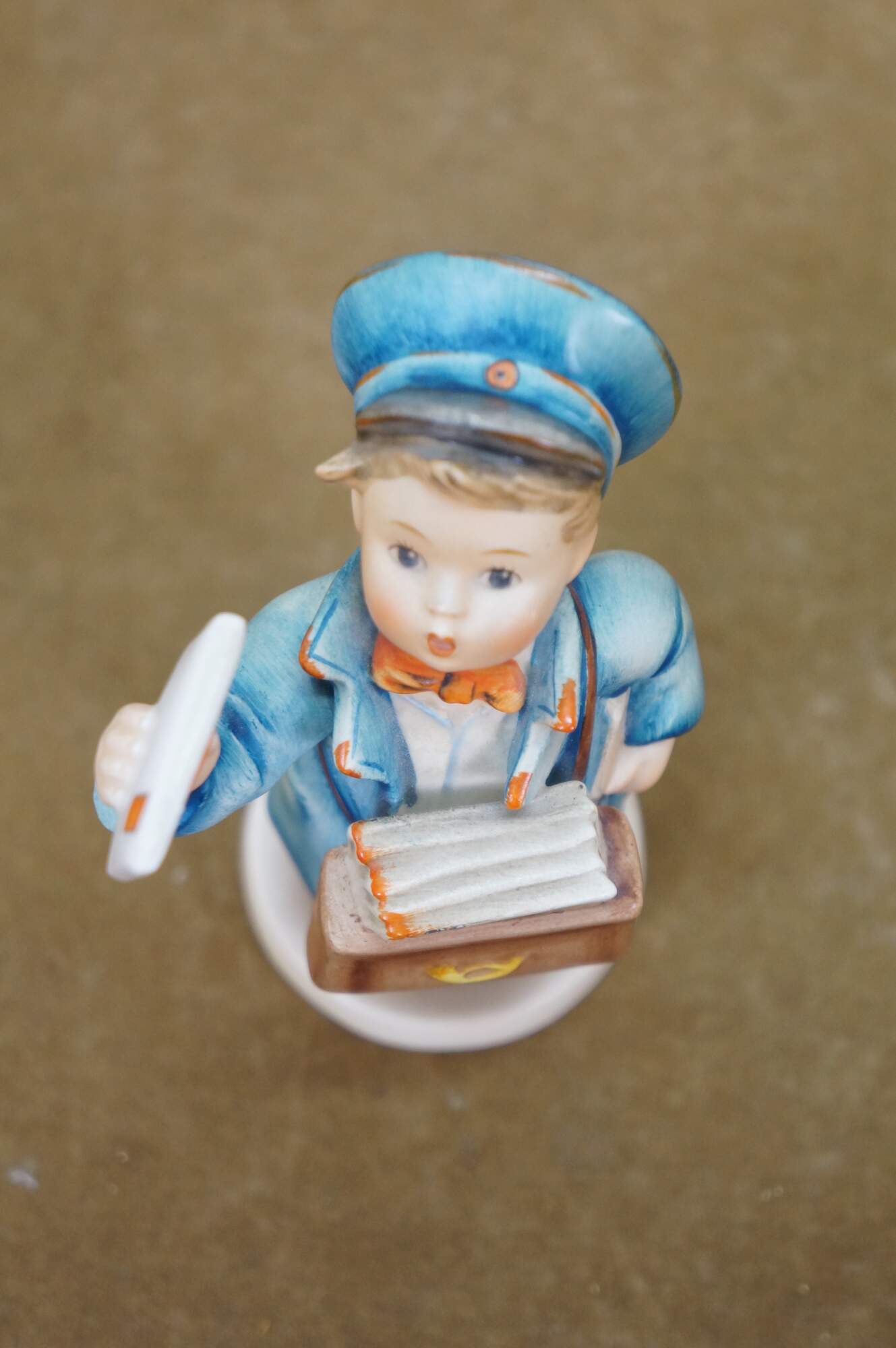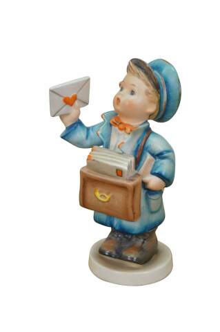 Mid 20th century Goebel Hummel figurine number 119 - Postman. TMK-2 Full Bee Mark - circa 1950-1955. Young boy in blue postman's uniform carrying a bag full of letters / Valentines, lifting one up to the viewer.