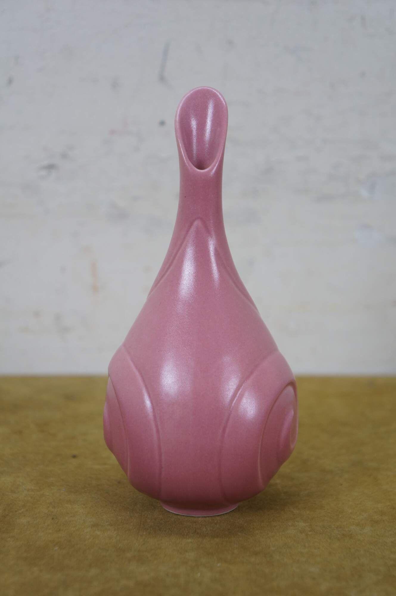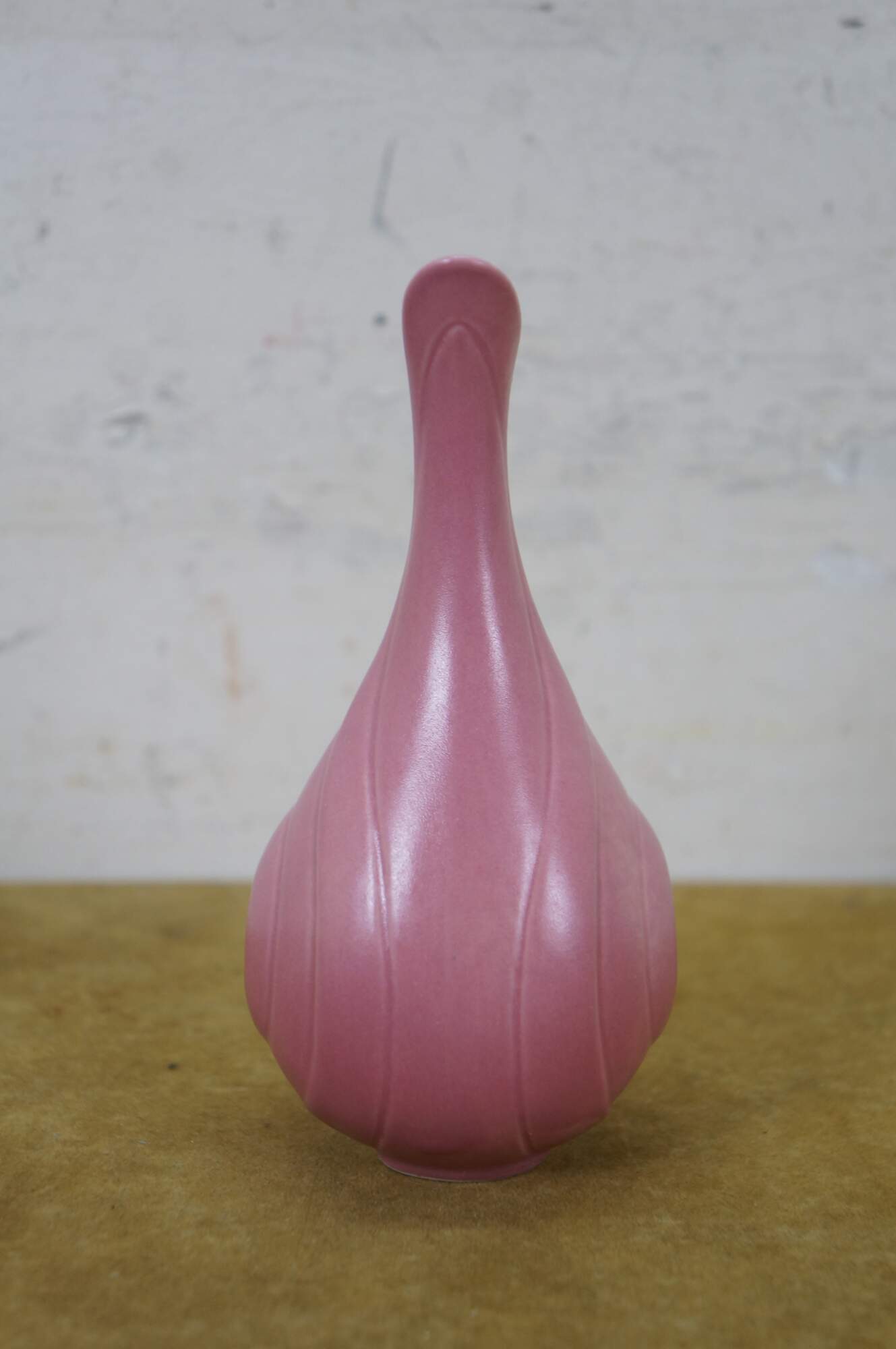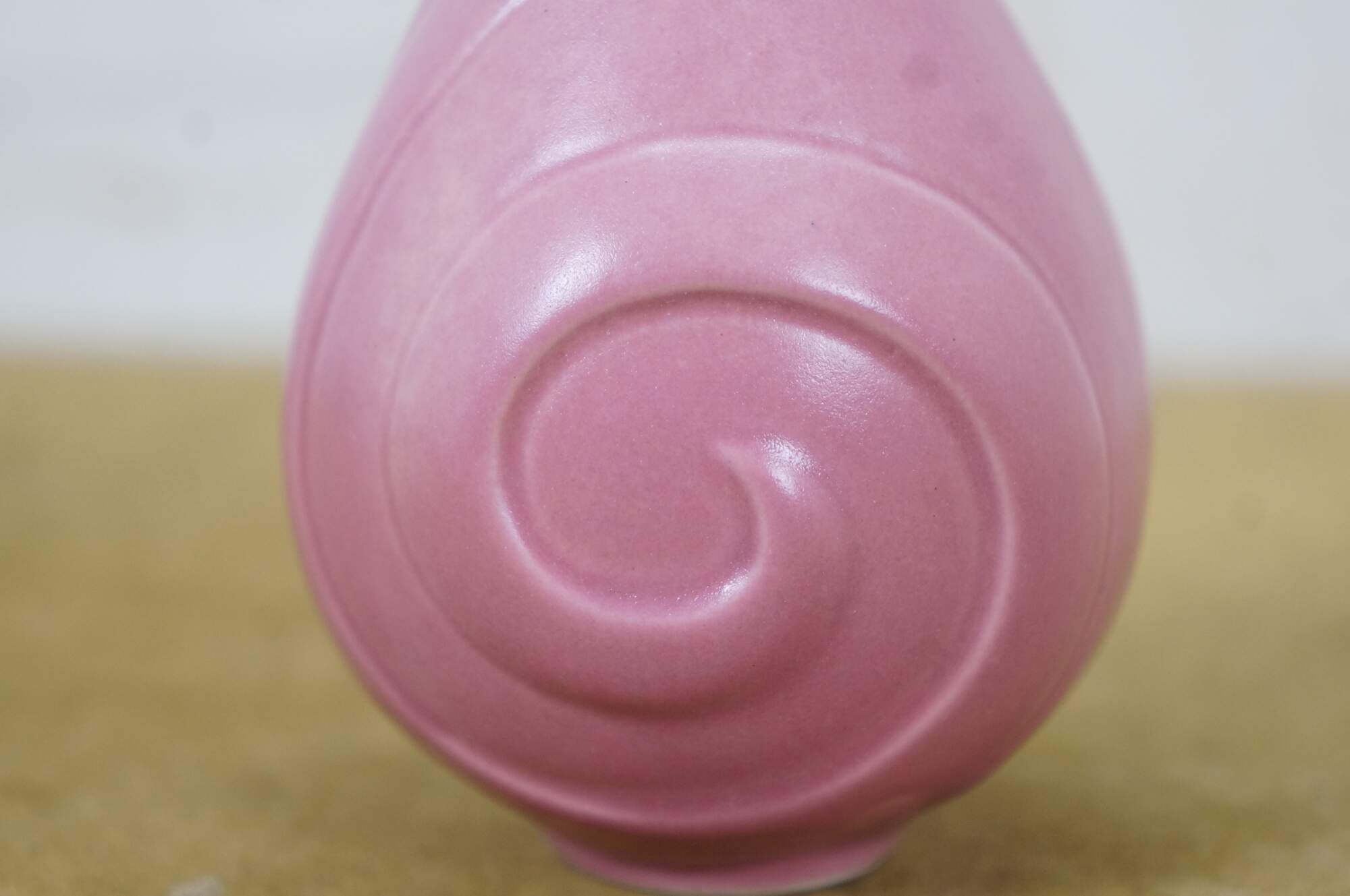 Early 21st century Rookwood Pottery bud vase - teardrop / bulb shaped vase with a soft pink glaze and a raised Art Deco inspired spiral / swirl design on the side. Marked 10106 D - MMXV (2015).