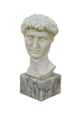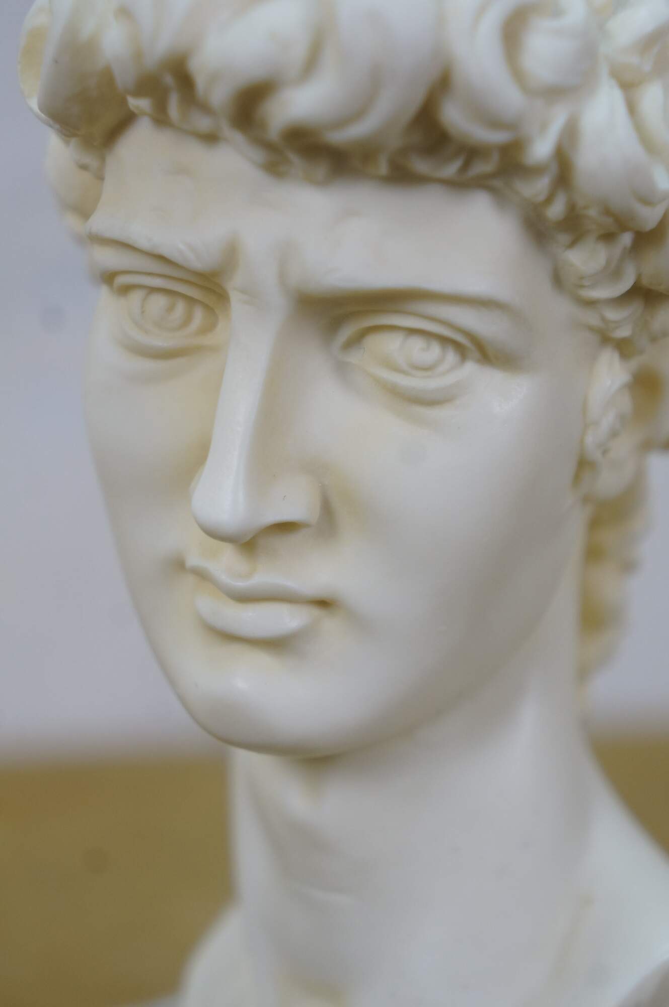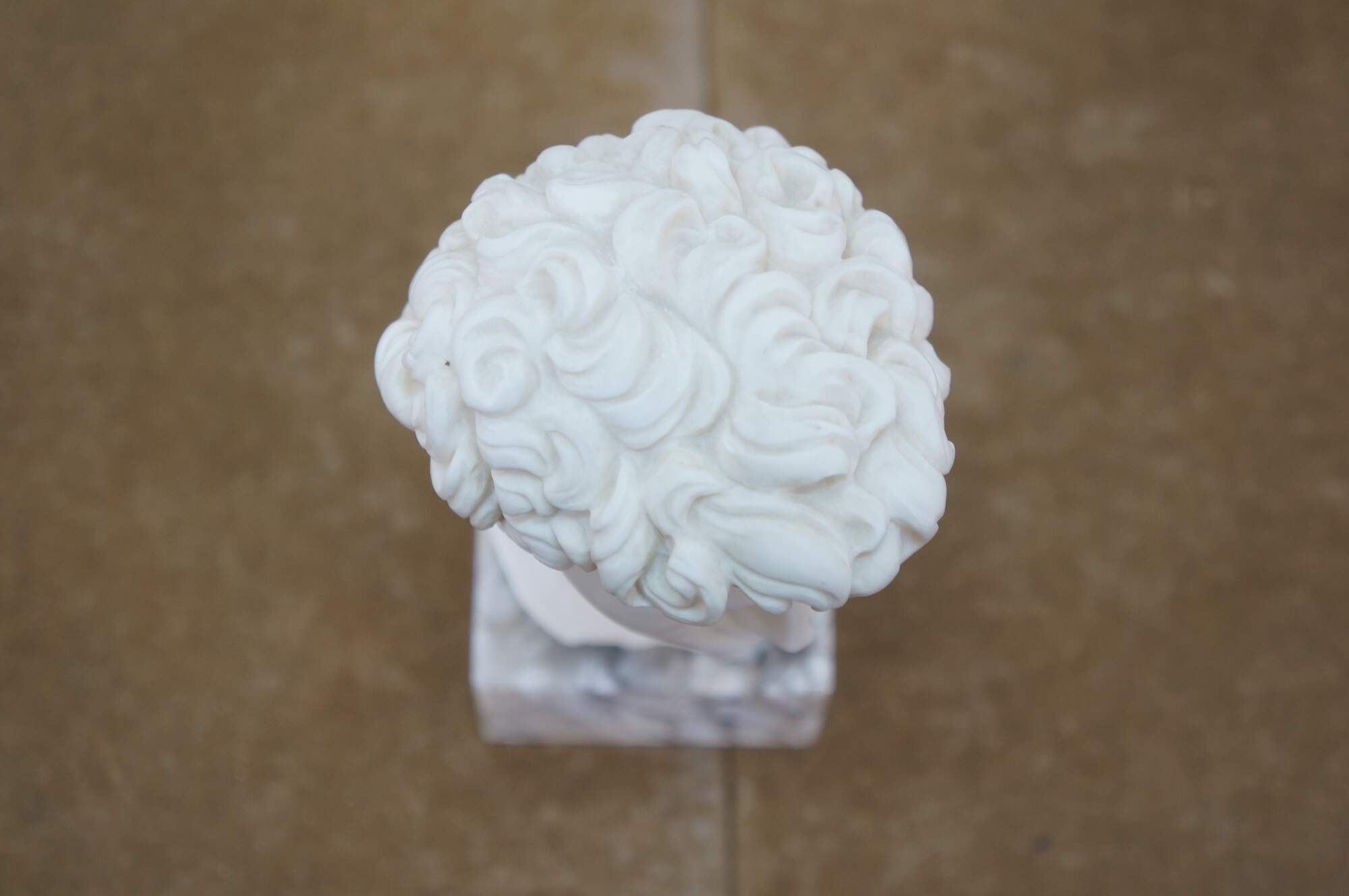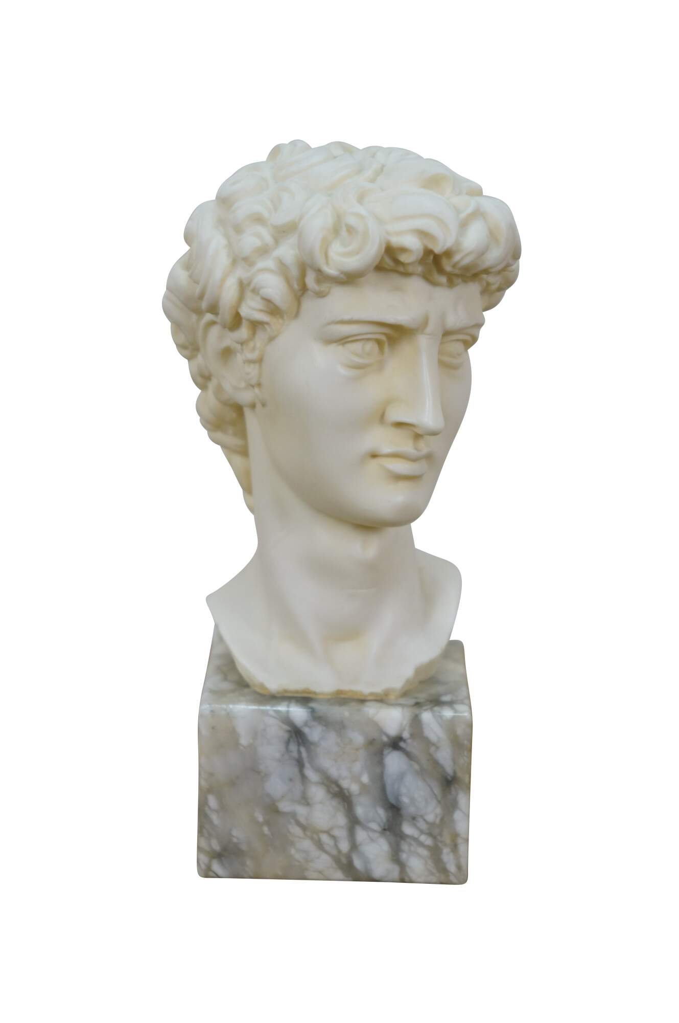 Late 20th century figurine / bust after the head of Michelangelo's David from Florence, Italy, as recreated by Arnaldo Giannelli (1907-2005). Resin, mounted on a white and beige marble plinth.