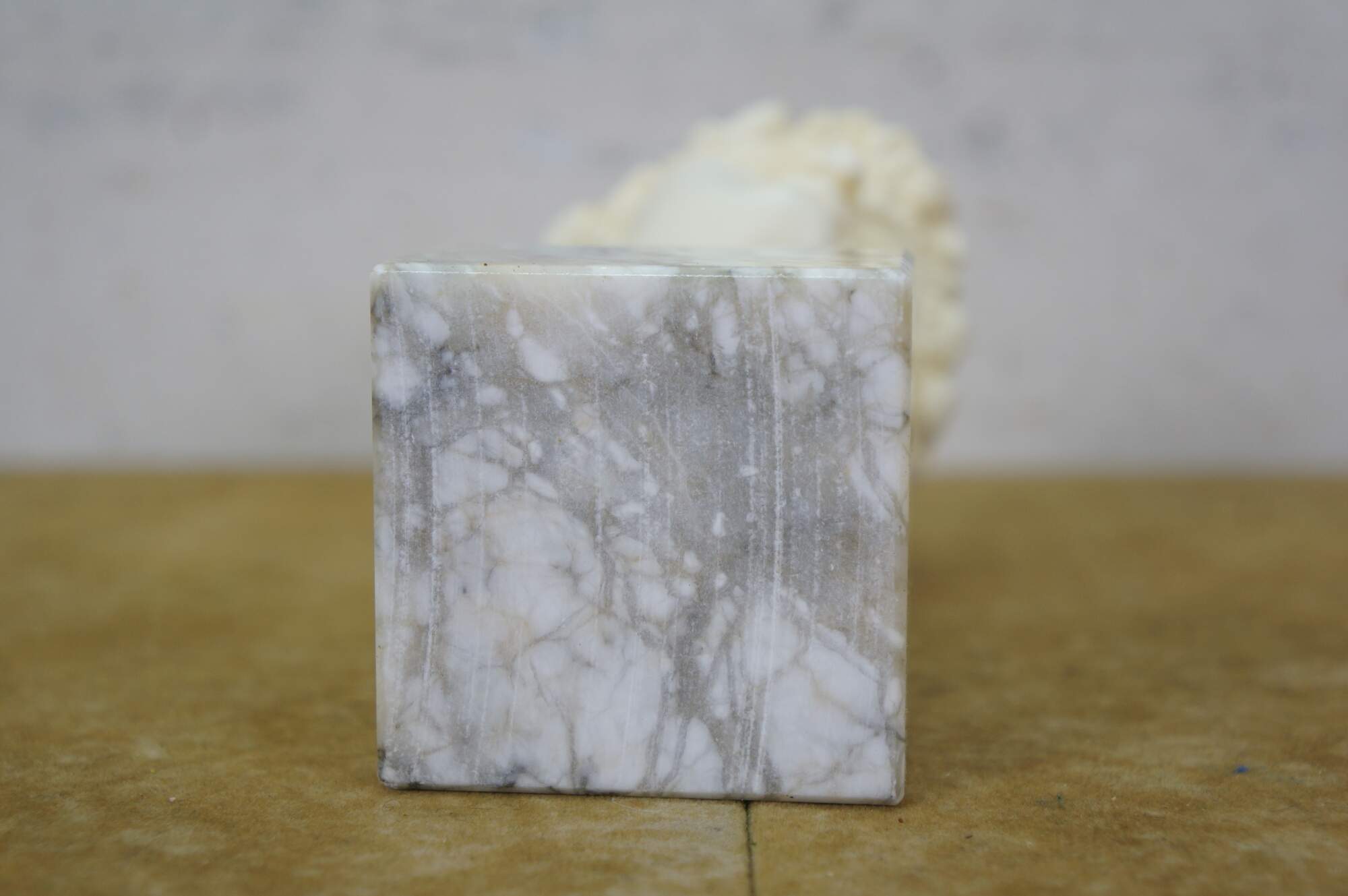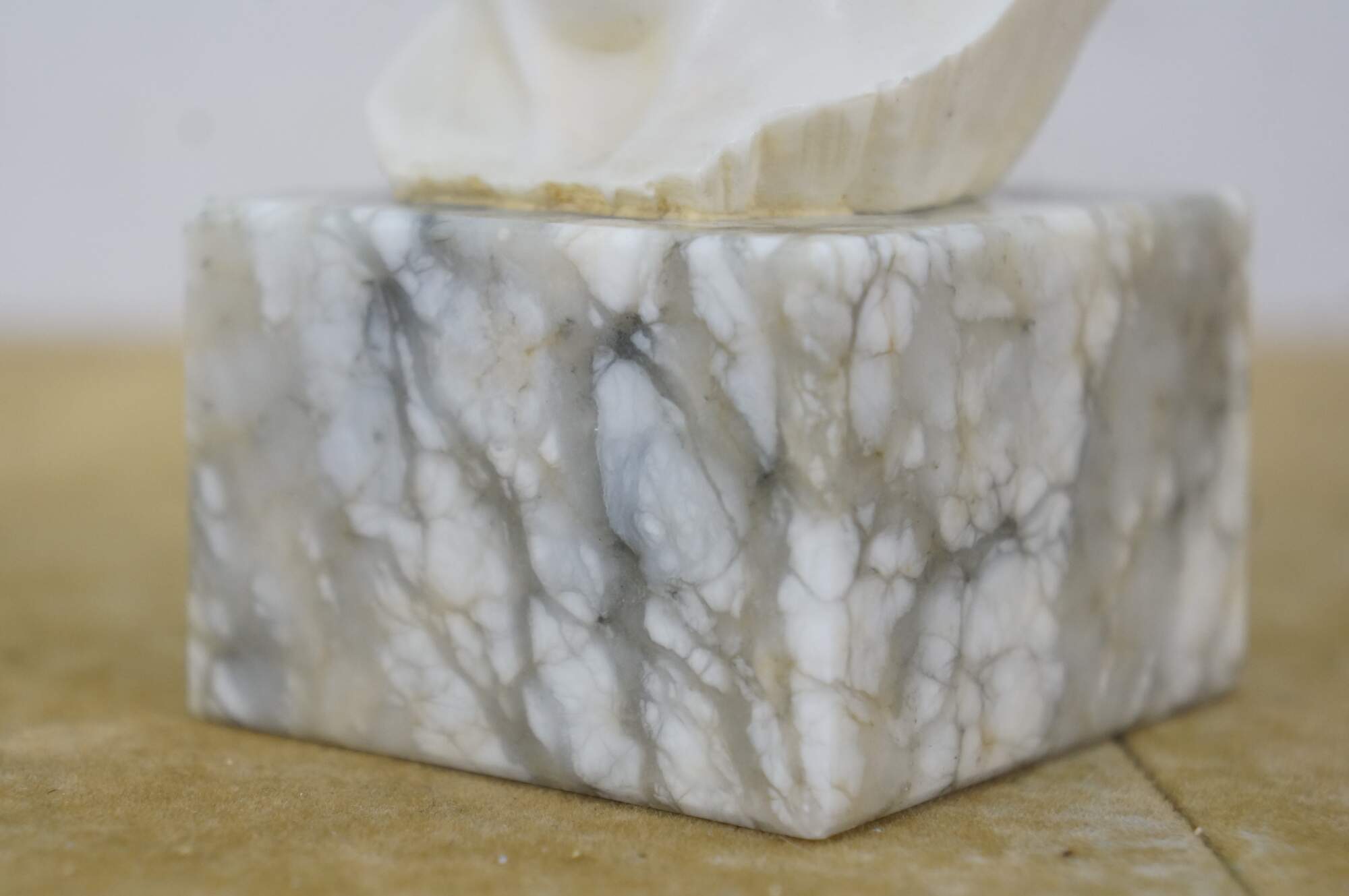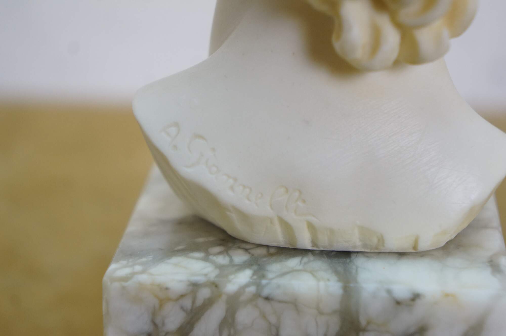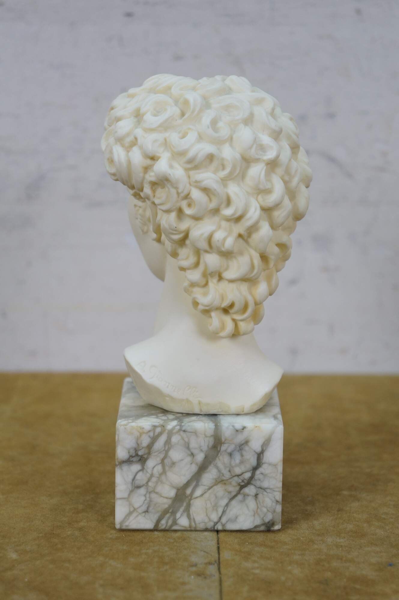 Late 20th century figurine / bust after the head of Michelangelo's David from Florence, Italy, as recreated by Arnaldo Giannelli (1907-2005). Resin, mounted on a white and beige marble plinth.