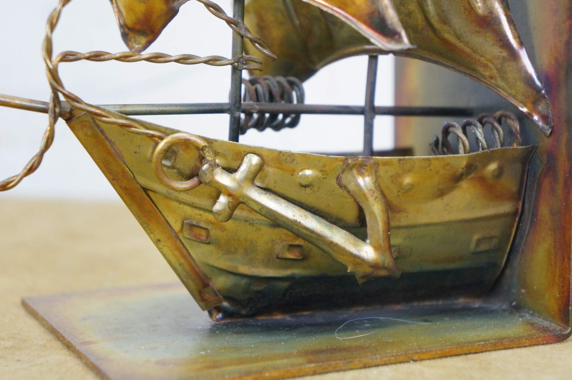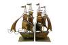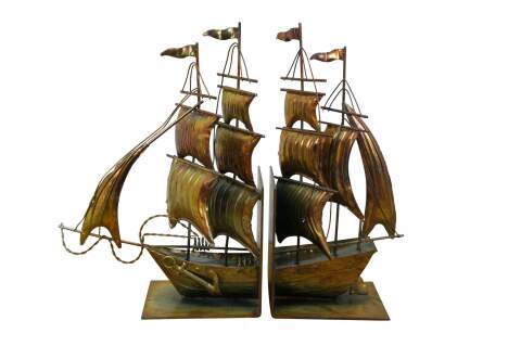 Vintage late 20th century nautical copper / tin / brass bookends in the shape of an old maritime sailing ship with four masts, billowing sails and a large anchor. Made in Hong Kong.