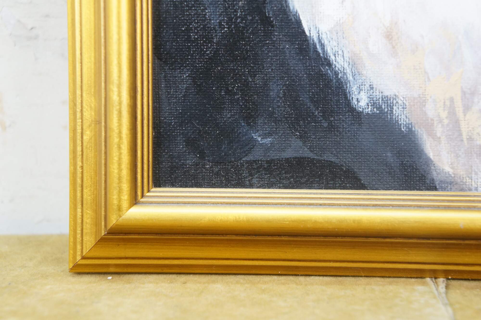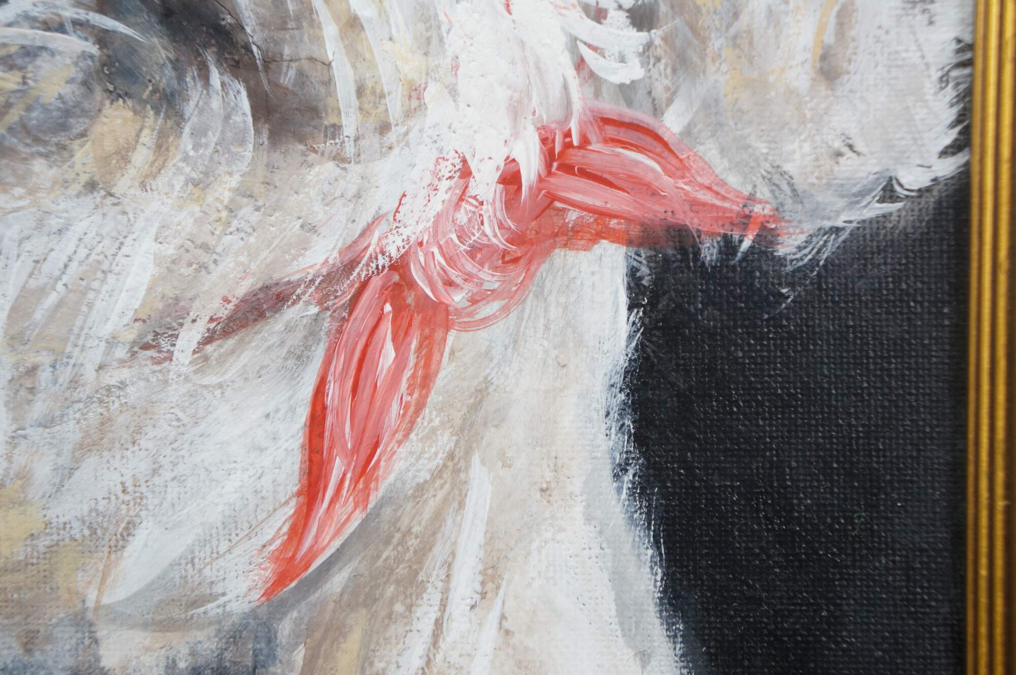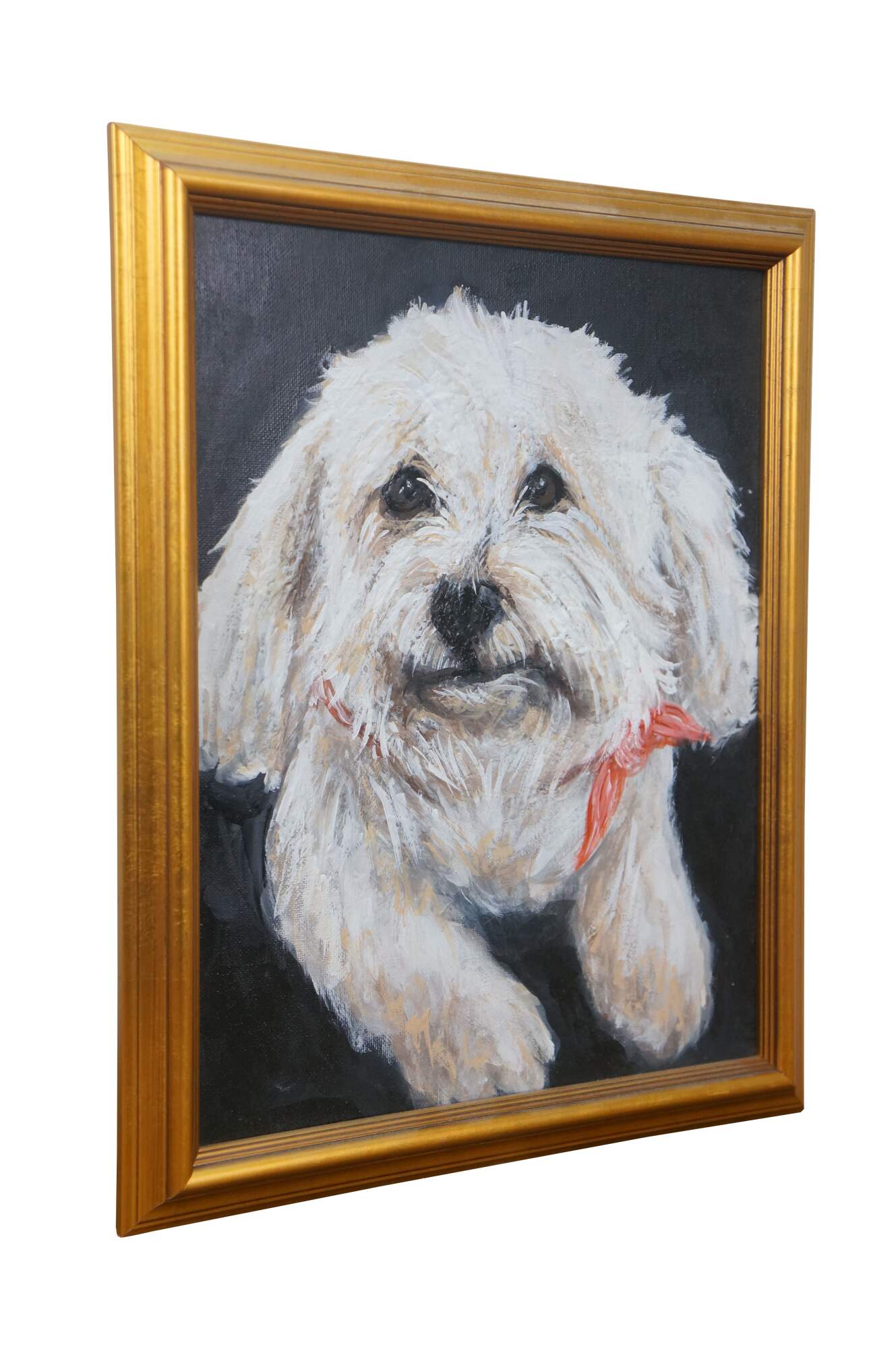 Late 20th century original oil on canvas painting depicting a white fluffy dog - likely a Maltese - wearing a pink ribbon. Beveled gilt frame.