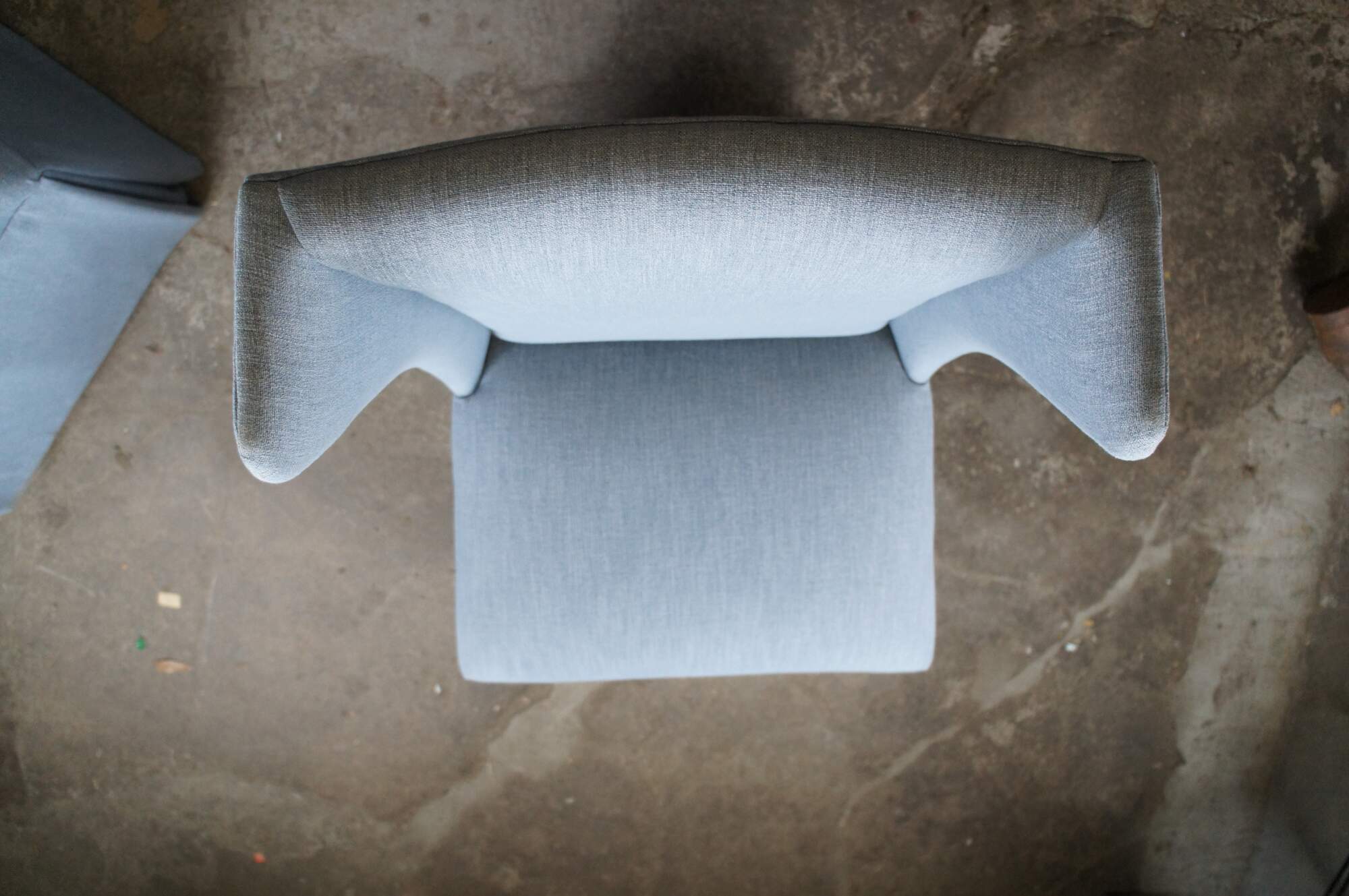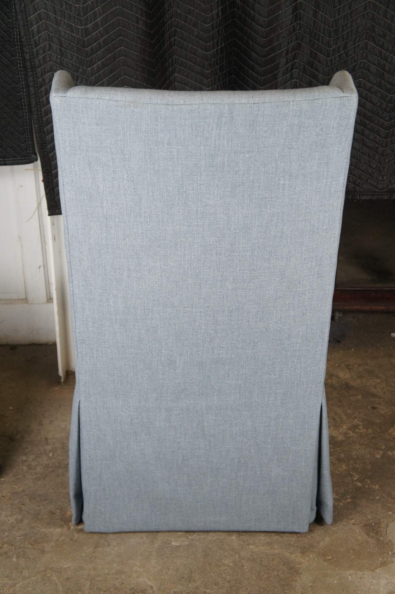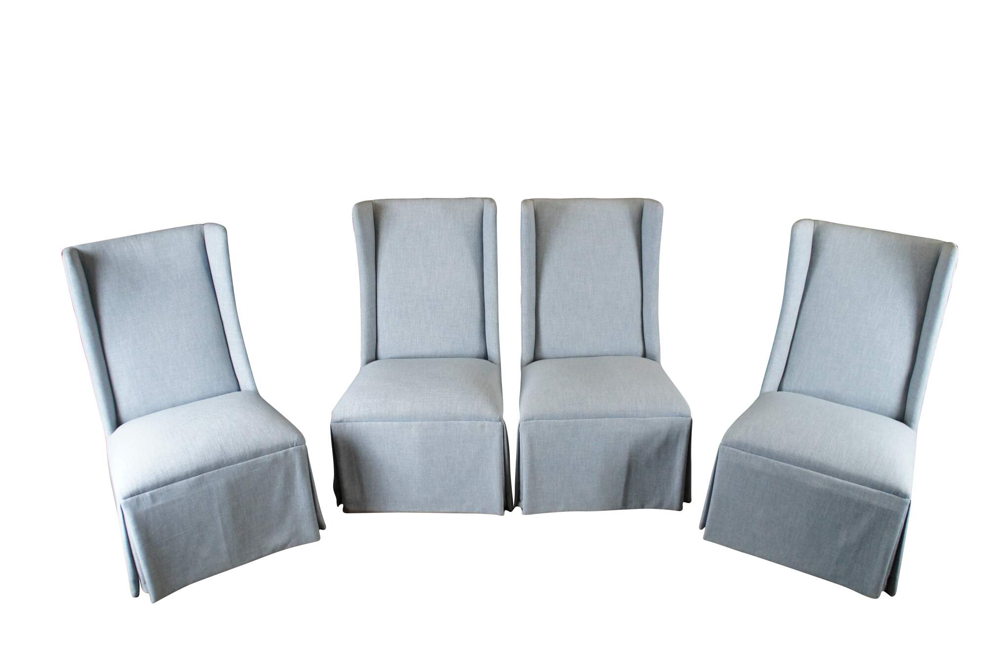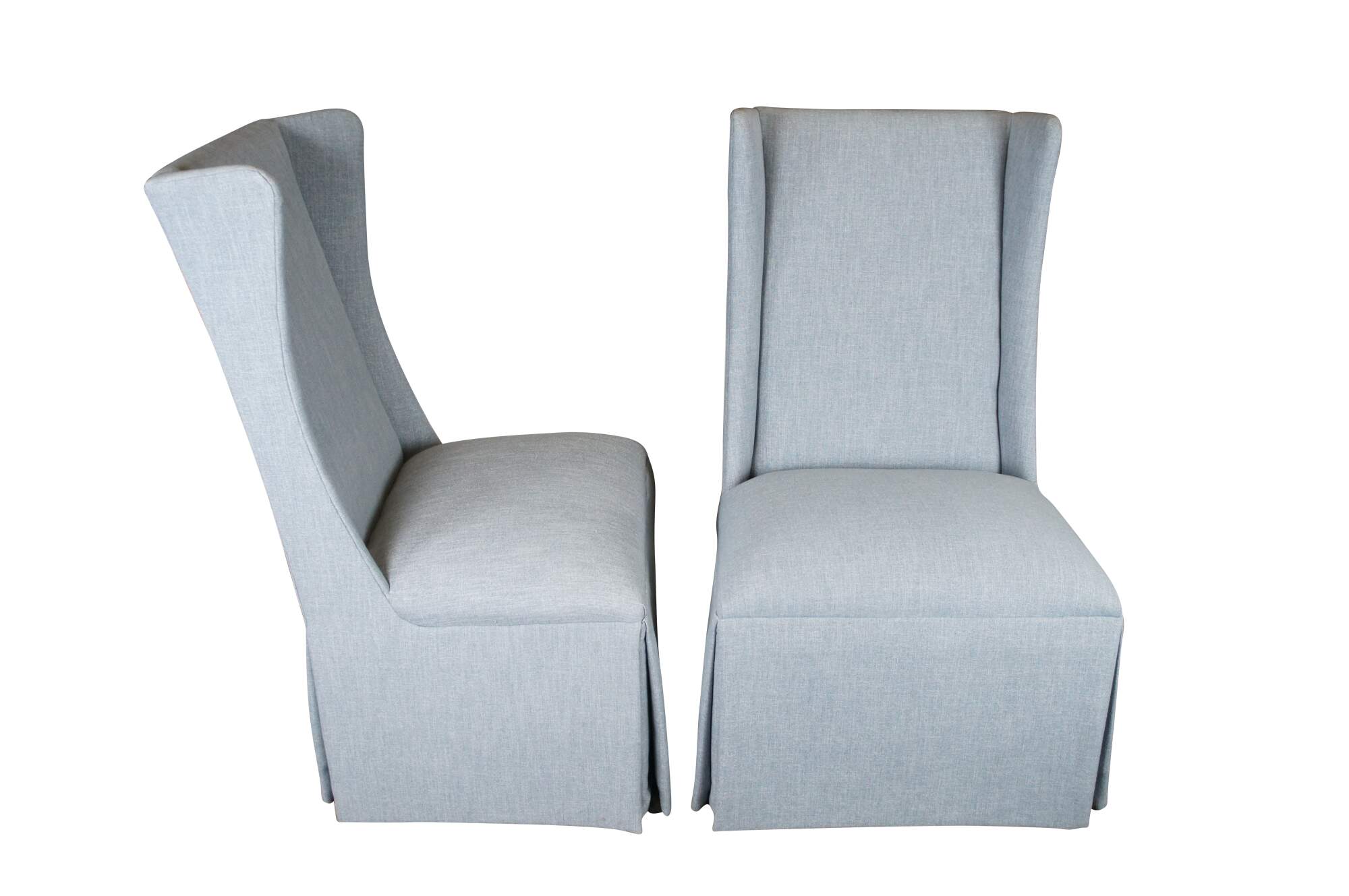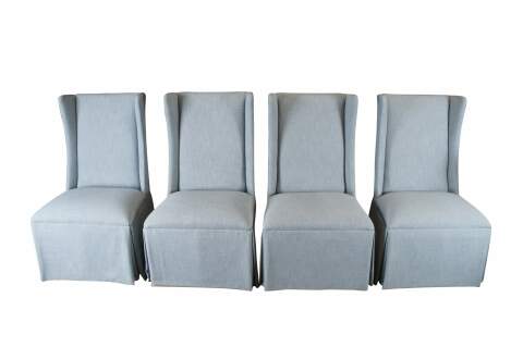 Features a highwingback over padded seat and skirted base. Upholstered in light blue. Made in America. MSRP $2,041.80 / per chair.