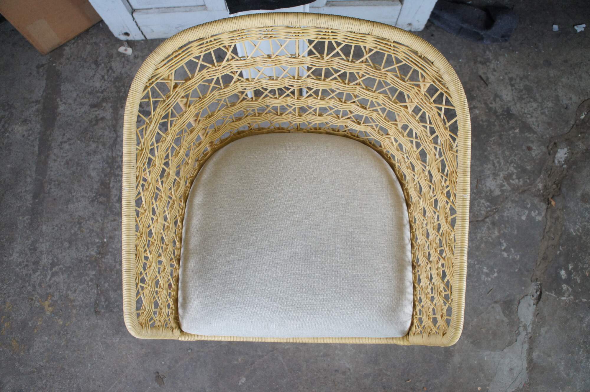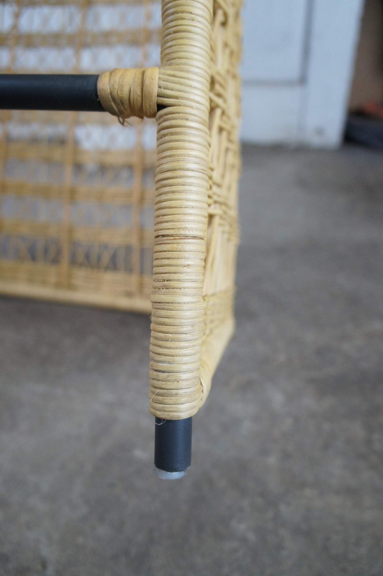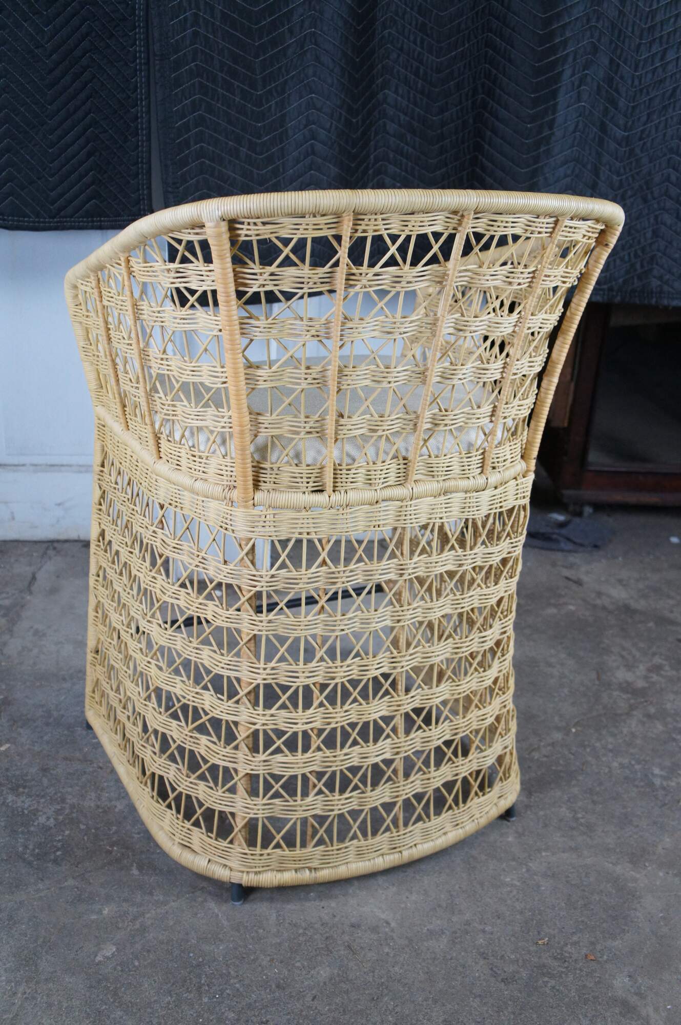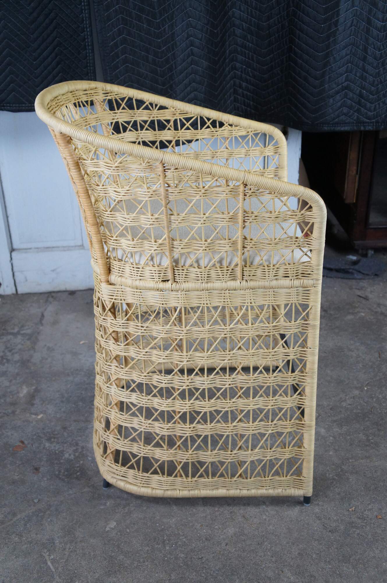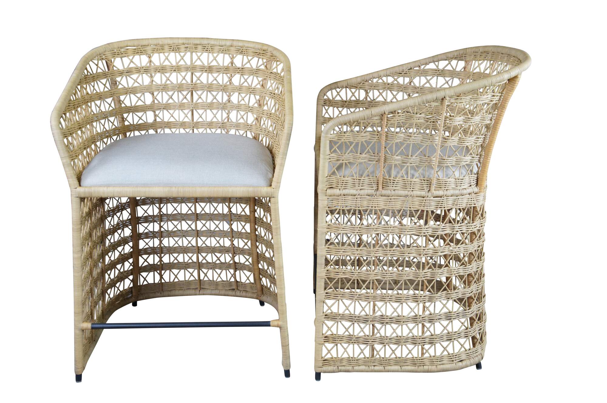 3 Gabby Libby Natural Rattan Counter Height Bar Stools. Features a Modern Boho Chic design with barrel back and sloped arms. Made from natural rattan with dark gray metal footrest. Seat is linen. MSRP $1199/chair