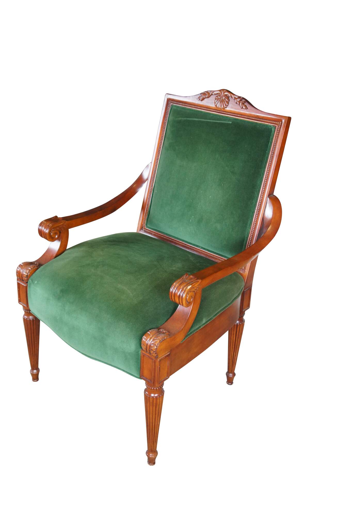 Late 20th Century French Empire Style Upholstered Arm Chair. Made from birch with a high back featuring a scalloped crest rail, green velvet upholstery and downswept scrolled acanthus carved arms. The legs are reeded and tapered leading to arrow feet.