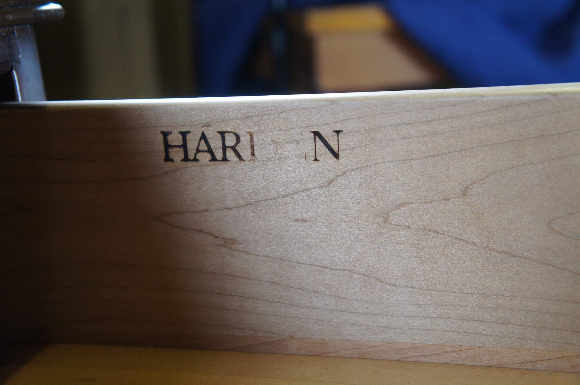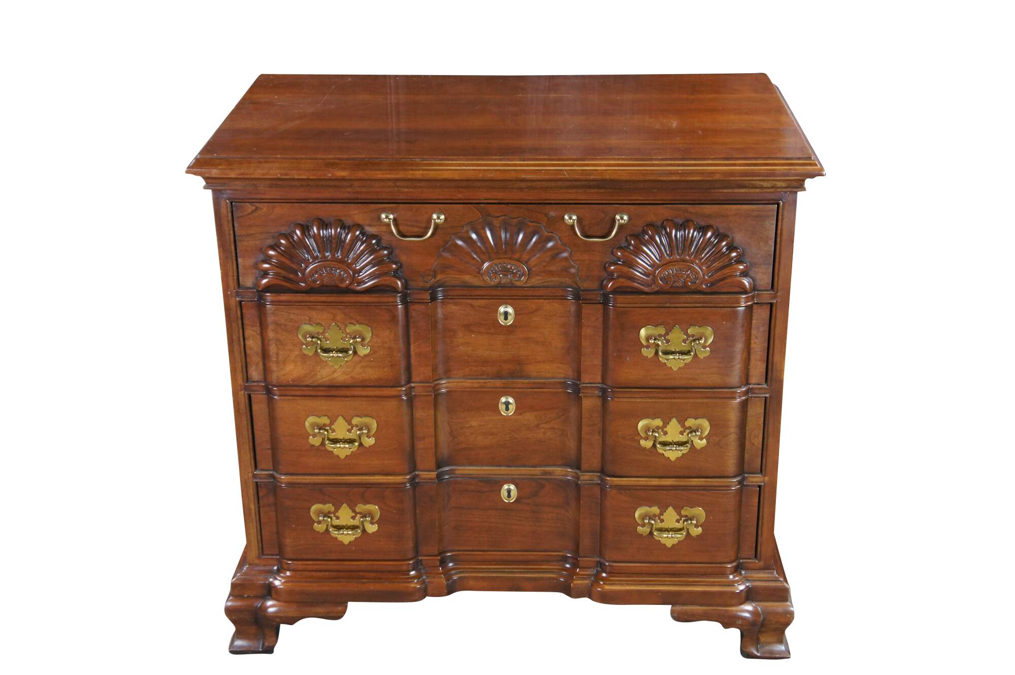 Harden Georgian style block front chest of drawers. Features a solid cherry frame with four dovetailed oak drawers. Drawer fronts are carved and scalloped along the top. with colonial style brass bale hardware with batwing plates. Drawer centers feature faux escutcheon plates. The chest is supported by Ogee bracket feet.